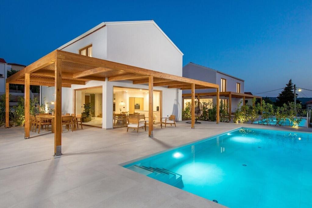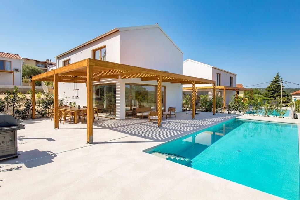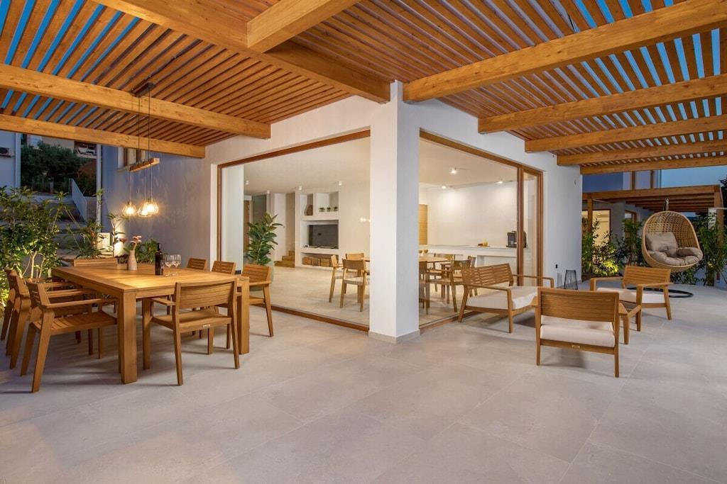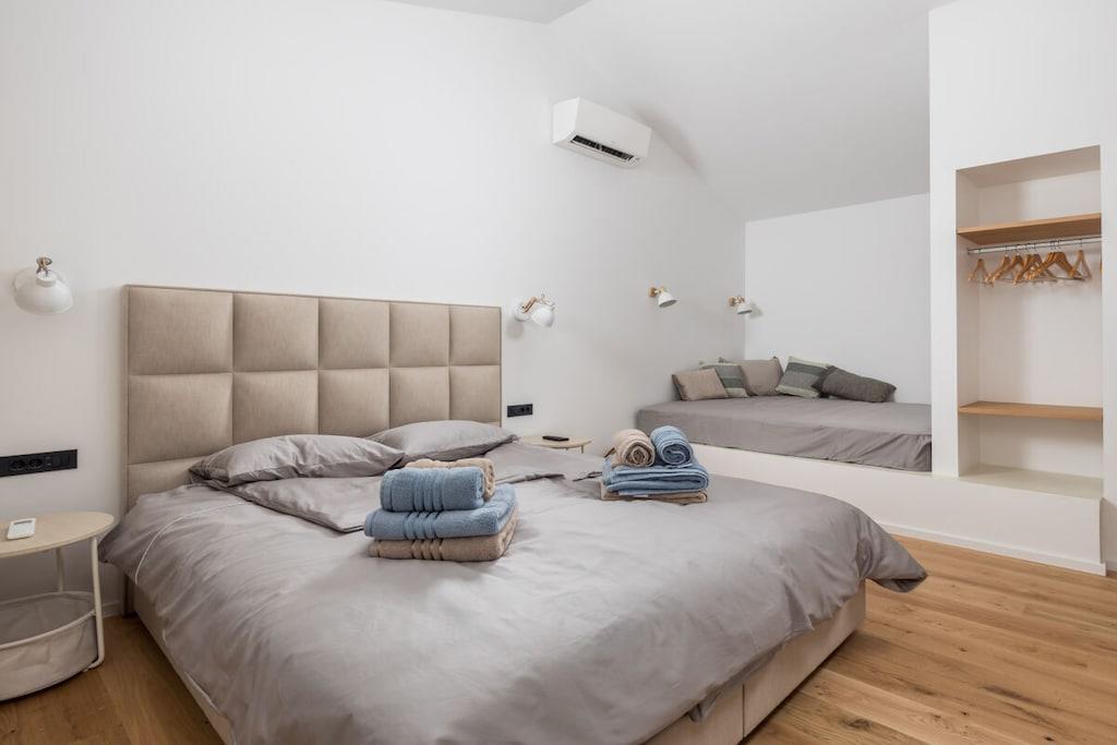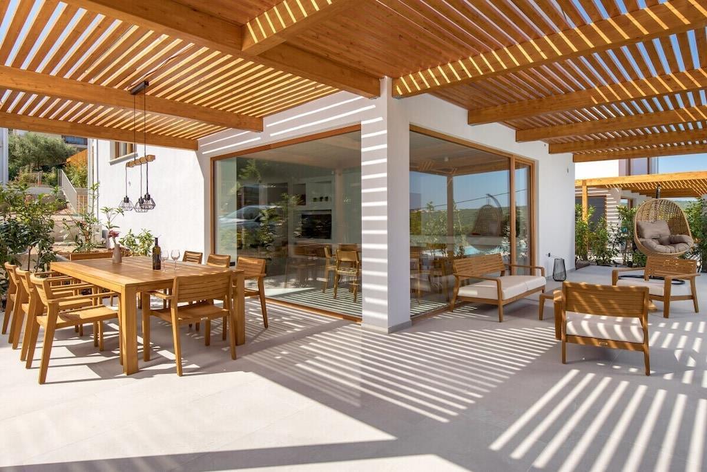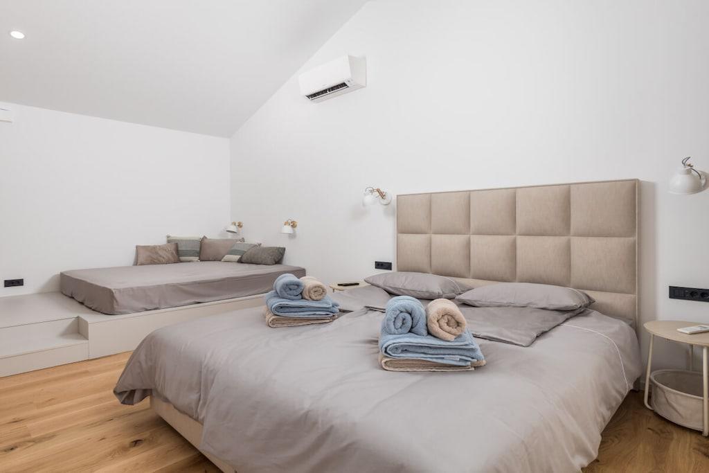 Ground floor: (Kitchen(cooker, oven, dishwasher, fridge, air conditioning), Living/diningroom(Sofa, TV, dining table, air conditioning), guest toilet(Mirror, toilet, washbasin)) On the 1st floor: (bedroom(Bed Linen, Wardrobe, double bed, TV, air conditioning), bedroom(Bed Linen, Wardrobe, double bed, TV, air conditioning), bedroom(Bed Linen, Wardrobe, double king size bed, double king size bed, TV, air conditioning), bathroom(Mirror, toilet, shower, washbasin, heating), bathroom(Mirror, toilet, shower, washbasin, heating, air conditioning)) Hot Water, Vacuum Cleaner, Internet access, Internet access, First Aid, tumble dryer, terrace(garden furniture, sun loungers, swimming pool), ironing board, Charging post for electric cars