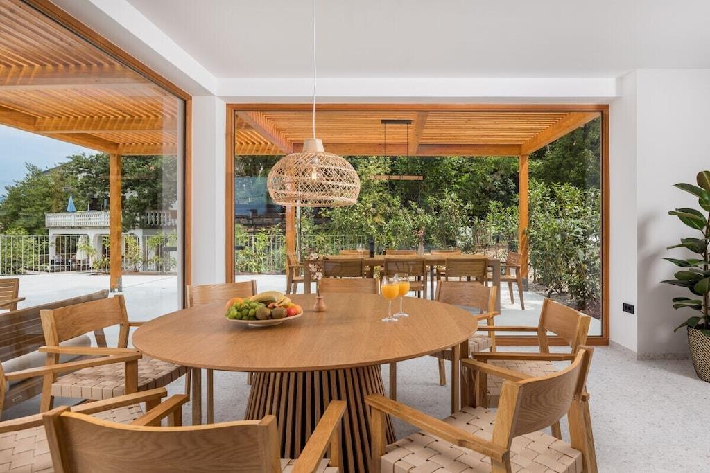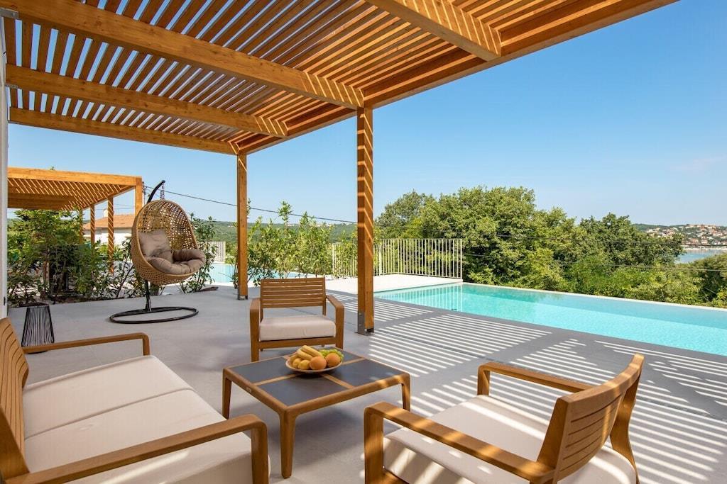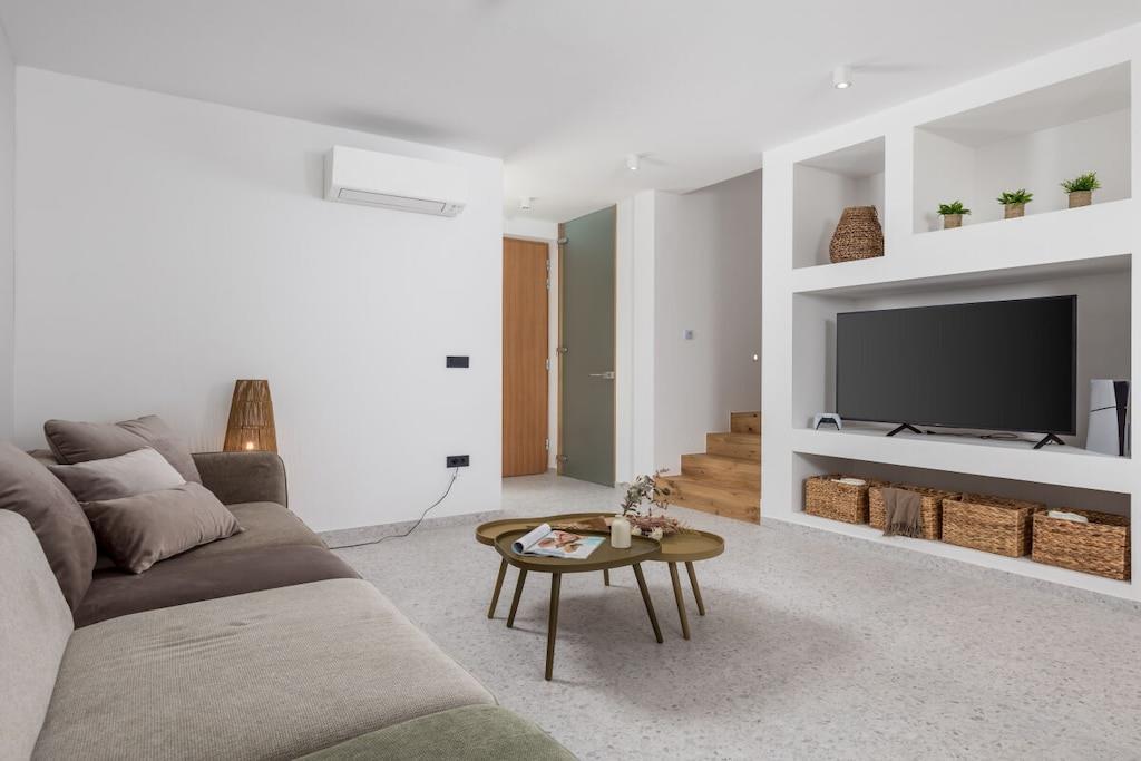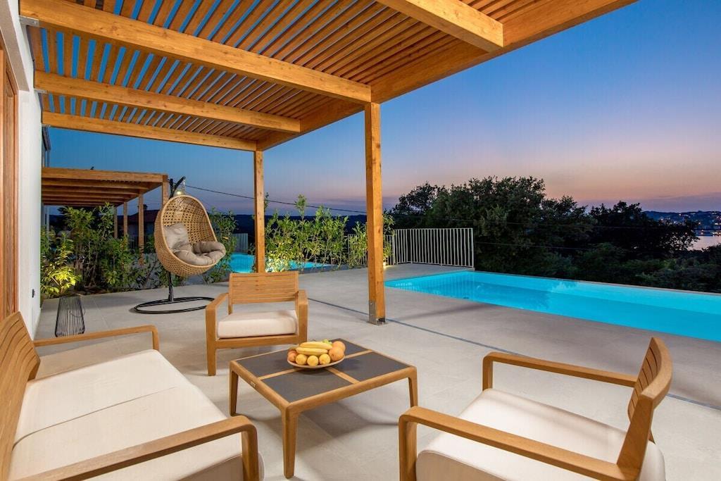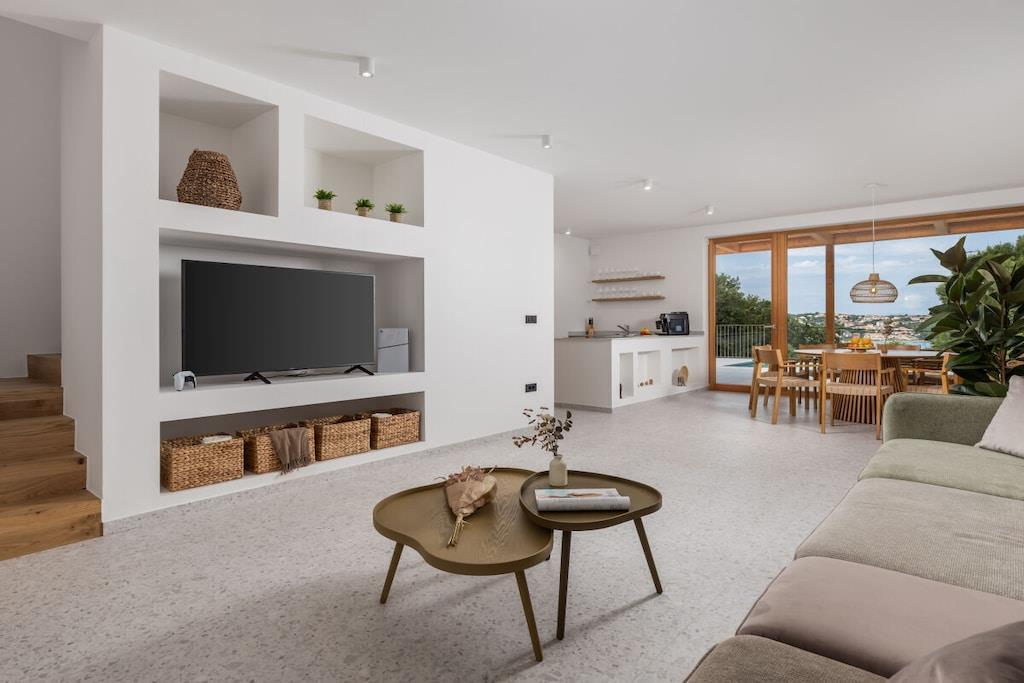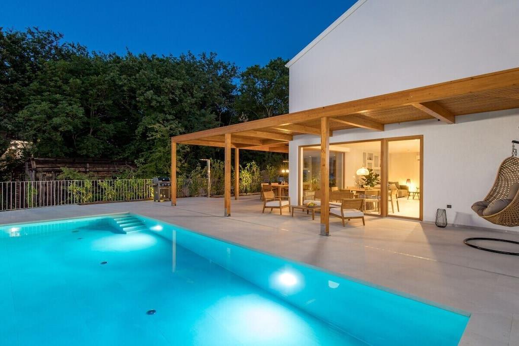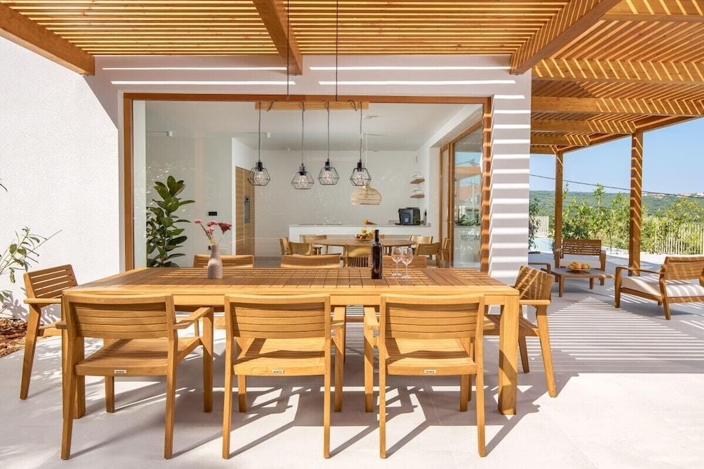 Ground floor: (Kitchen(cooker, oven, dishwasher, fridge, air conditioning), Living/diningroom(Sofa, TV, dining table, air conditioning), guest toilet(Mirror, toilet, washbasin)) On the 1st floor: (bedroom(Bed Linen, Wardrobe, double bed, TV, air conditioning), bedroom(Bed Linen, Wardrobe, double bed, TV, air conditioning), bedroom(Bed Linen, Wardrobe, double king size bed, double king size bed, TV, air conditioning), bathroom(Mirror, toilet, shower, washbasin, heating), bathroom(Mirror, toilet, shower, washbasin, heating, air conditioning)) Hot Water, Vacuum Cleaner, Internet access, Internet access, First Aid, tumble dryer, terrace(garden furniture, sun loungers, swimming pool), ironing board, Charging post for electric cars