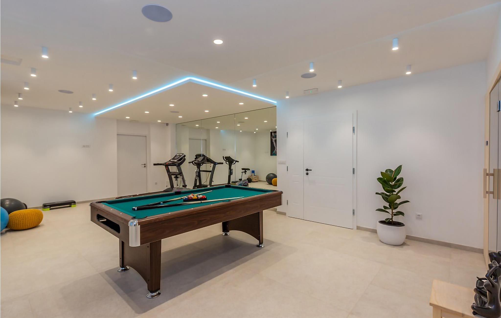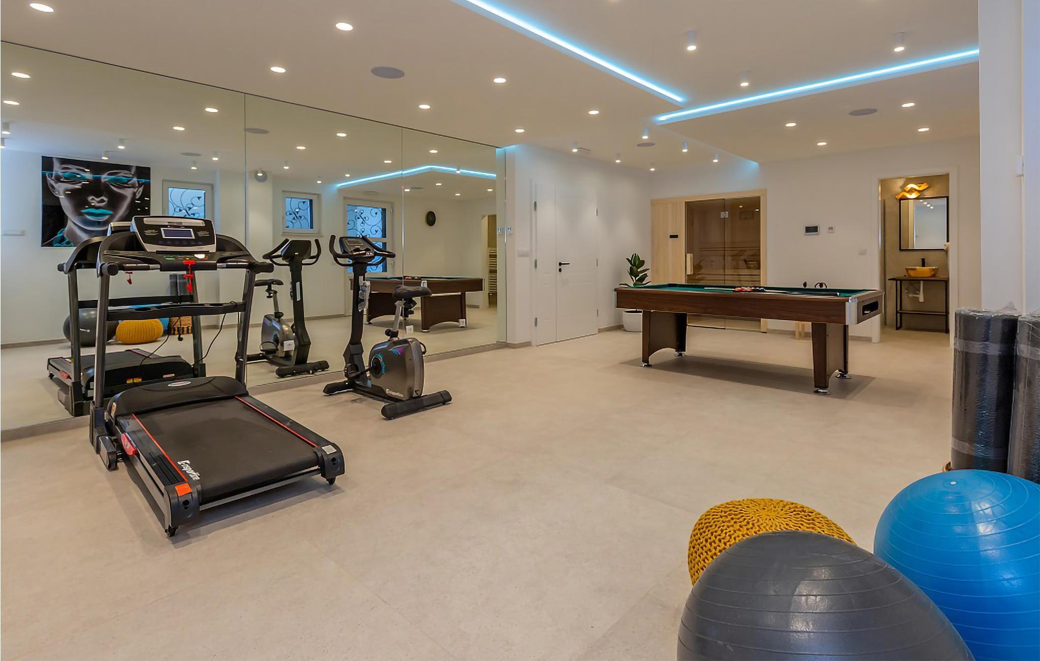 Der offene und lichtdurchflutete Wohnraum, der durch einen großen Balkon erweitert wird, ist der perfekte Raum für Ihre Geselligkeit, Kochspaß und gemeinsame Mahlzeiten. Der sportliche Aspekt Ihres Urlaubs sollte nicht fehlen? Dann haben Sie im eigenen Fitnessraum mit Sauna, den richtigen Raum dafür. Ein separater Freizeitbereich mit Billiard und Tischkicker rundet das Angebot für Sie ab.