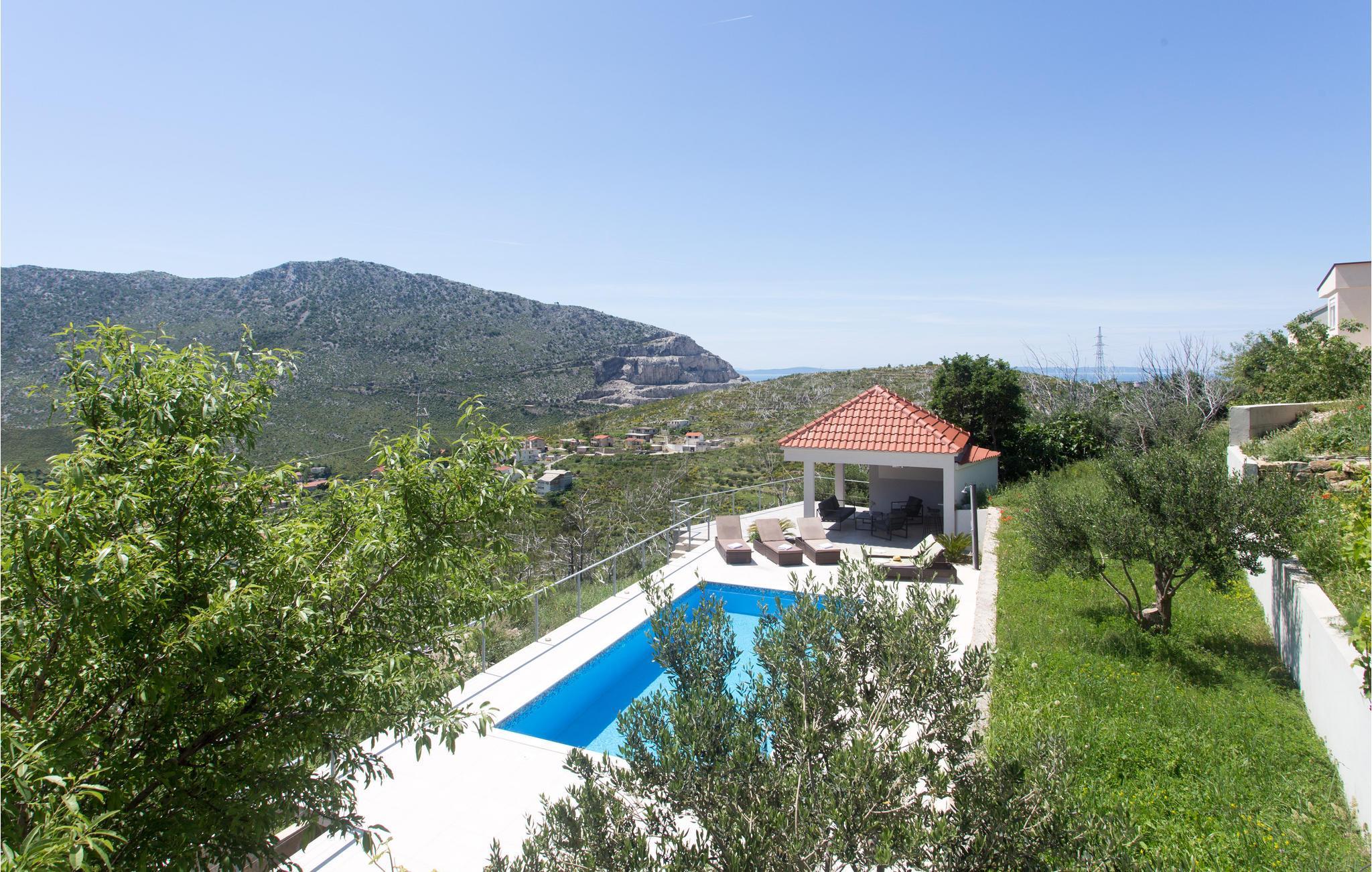 Das Grundstück ist terrassenförmig angelegt und bietet einen herrlichen Ausblick auf das Bergmassiv Mosor. Die nächste Einkaufsmöglichkeit haben Sie in der Ortschaft Žrnovica, etwa 5 Fahrminuten mit dem Auto entfernt. Diese angenehme Ferienunterkunft bietet Ihnen Erholung in natürlichem Umfeld, weit weg vom Alltag. Die große Terrasse am Pool ist sichtgeschützt.