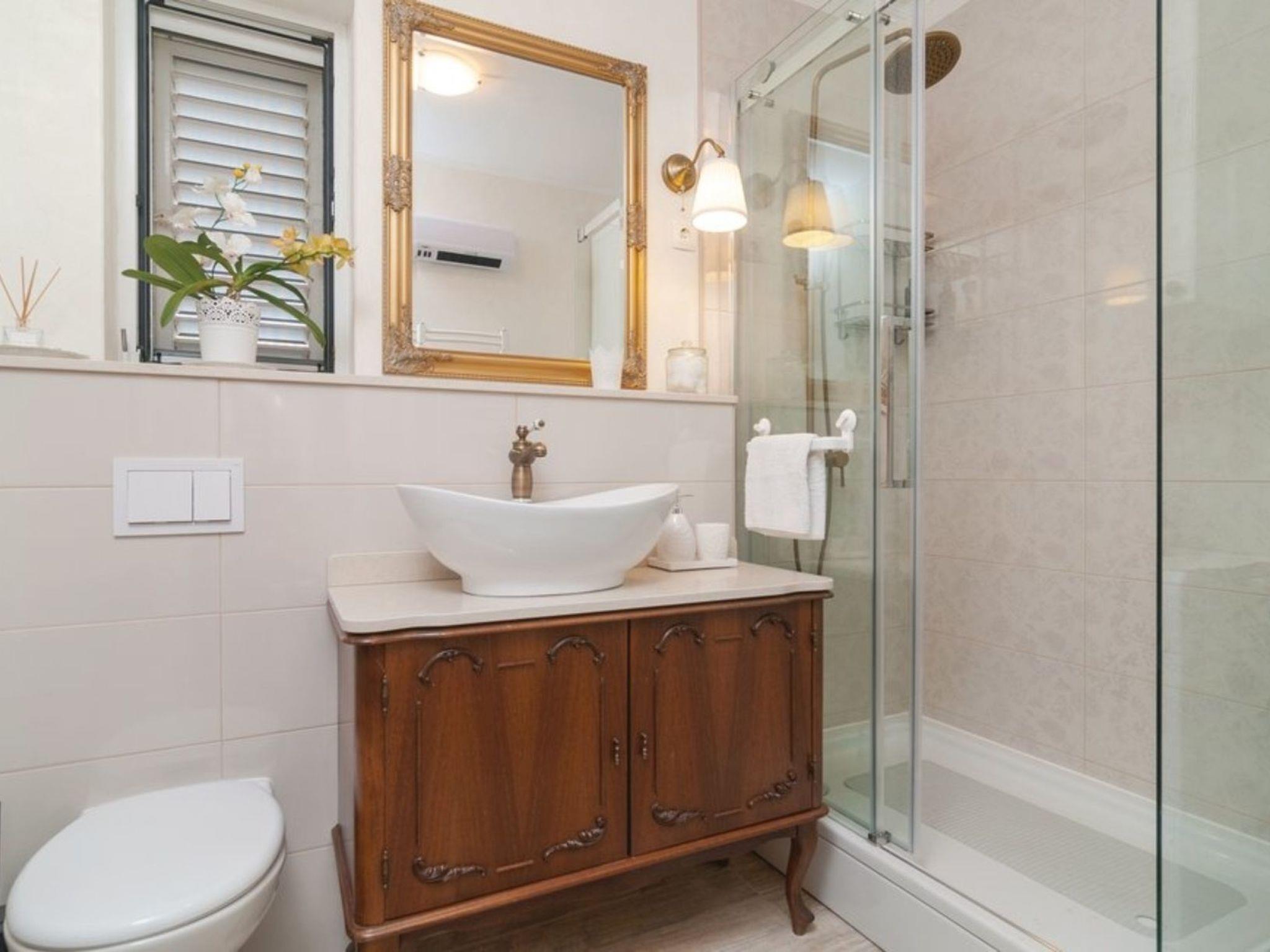 Inside, this holiday house is equipped for an effortless stay with two bedrooms and a spacious living area featuring a large sofa. The residence caters to your every convenience with two fully equipped bathrooms ensuring privacy and comfort for all guests. The inclusion of underfloor heating in parts of the house adds a cozy touch for cooler evenings, while air conditioning throughout ensures a pleasant retreat from the warm Dalmatian sun. Convenience is further provided by a washing machine and clothes dryer, exclusively for guest use within the property, ensuring all the comforts of home are at your fingertips.