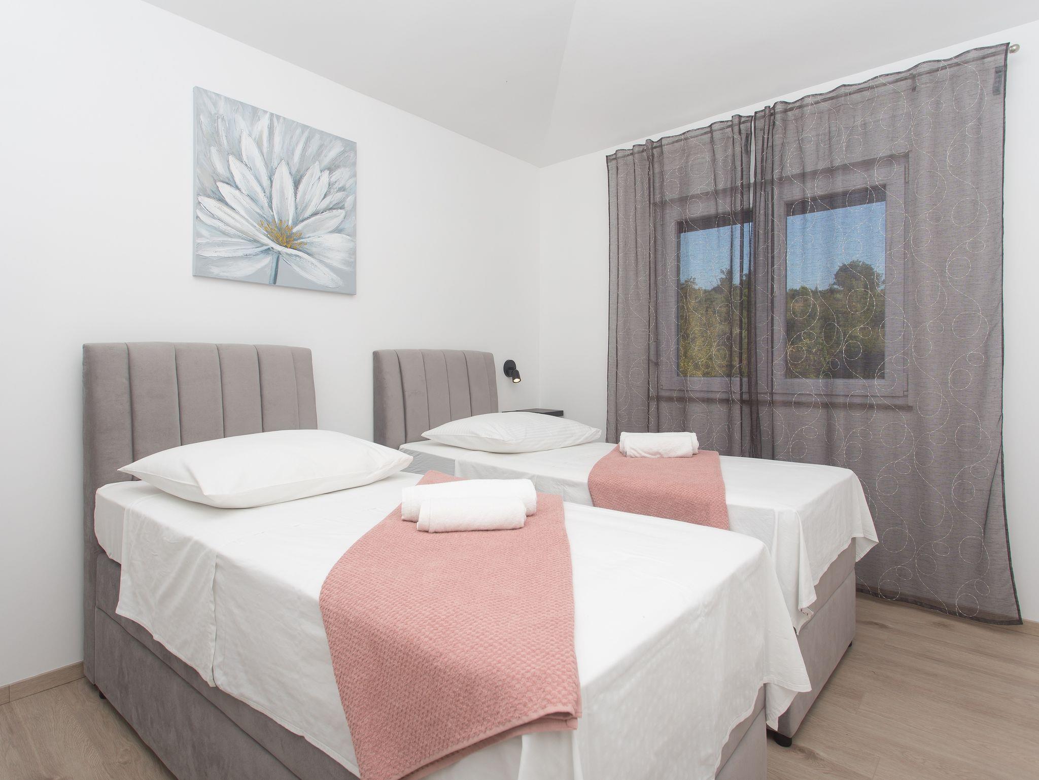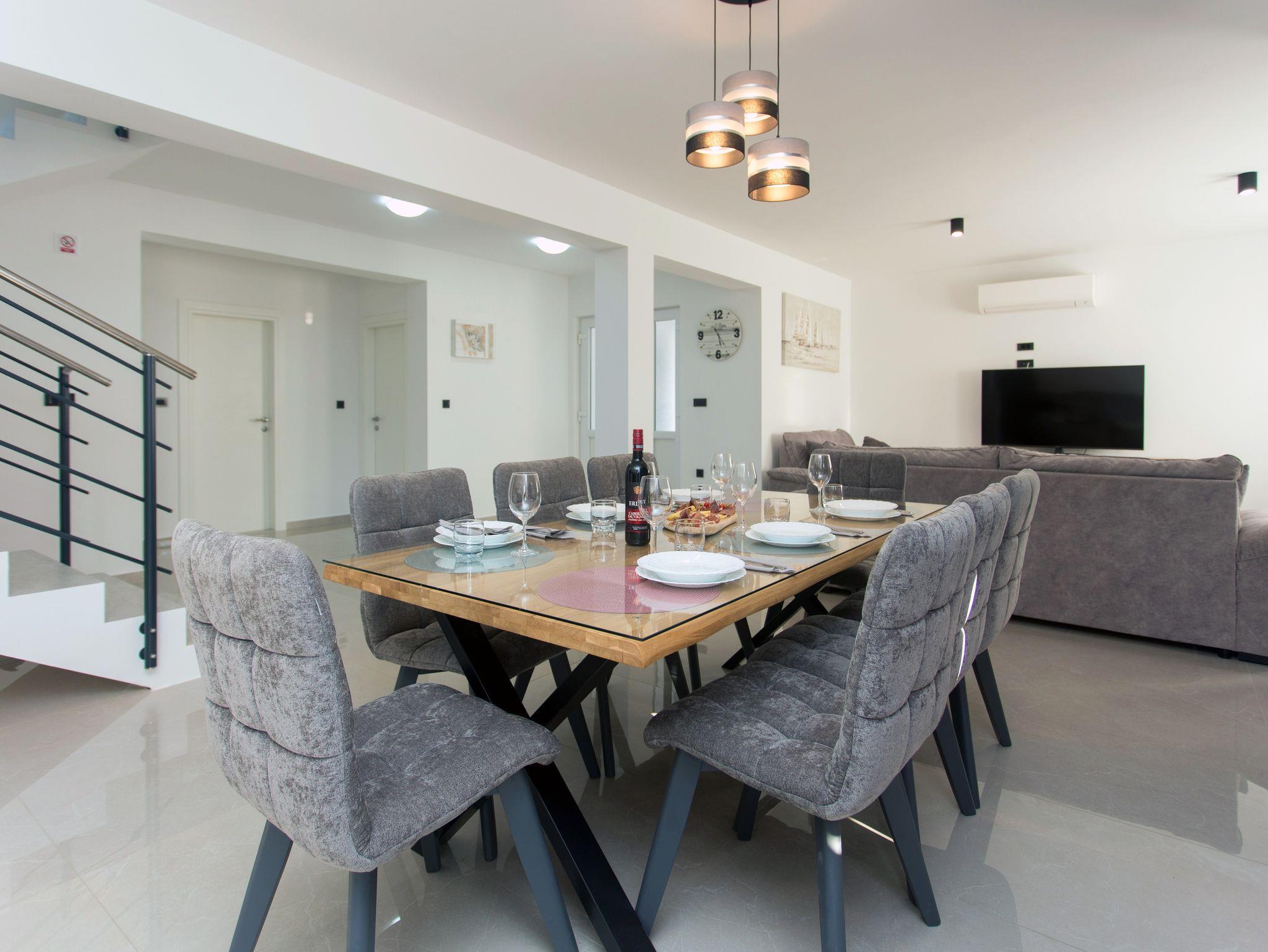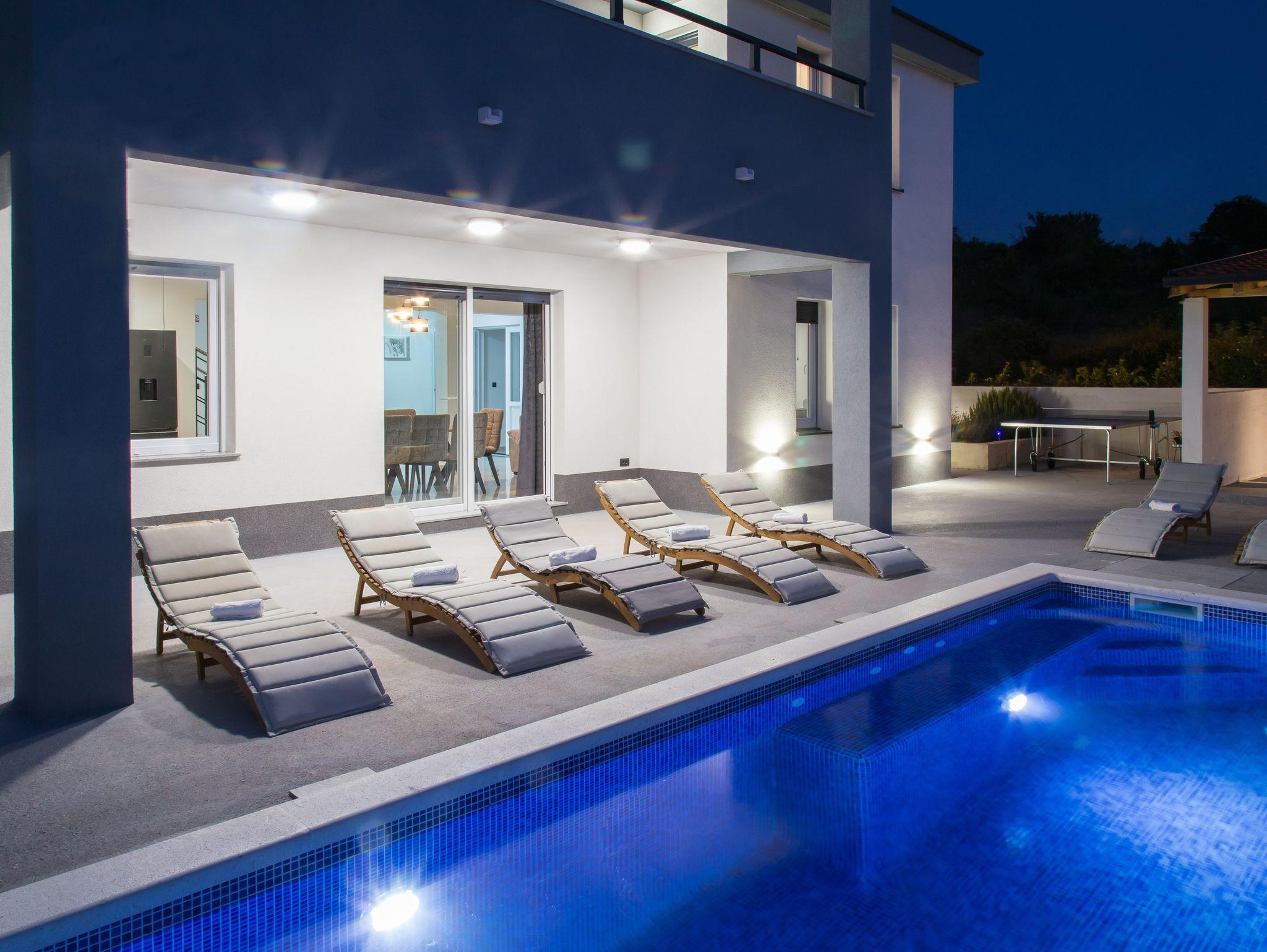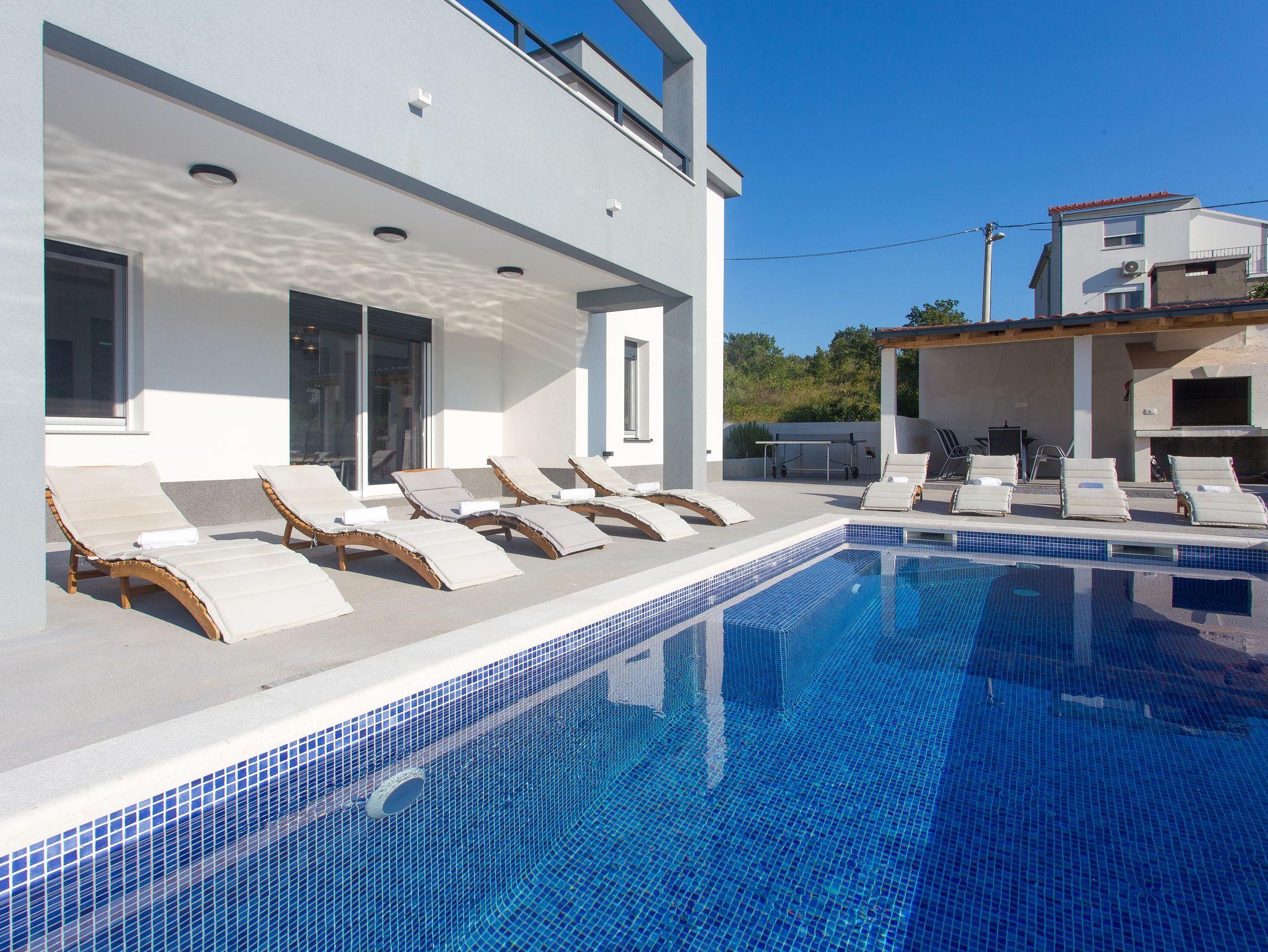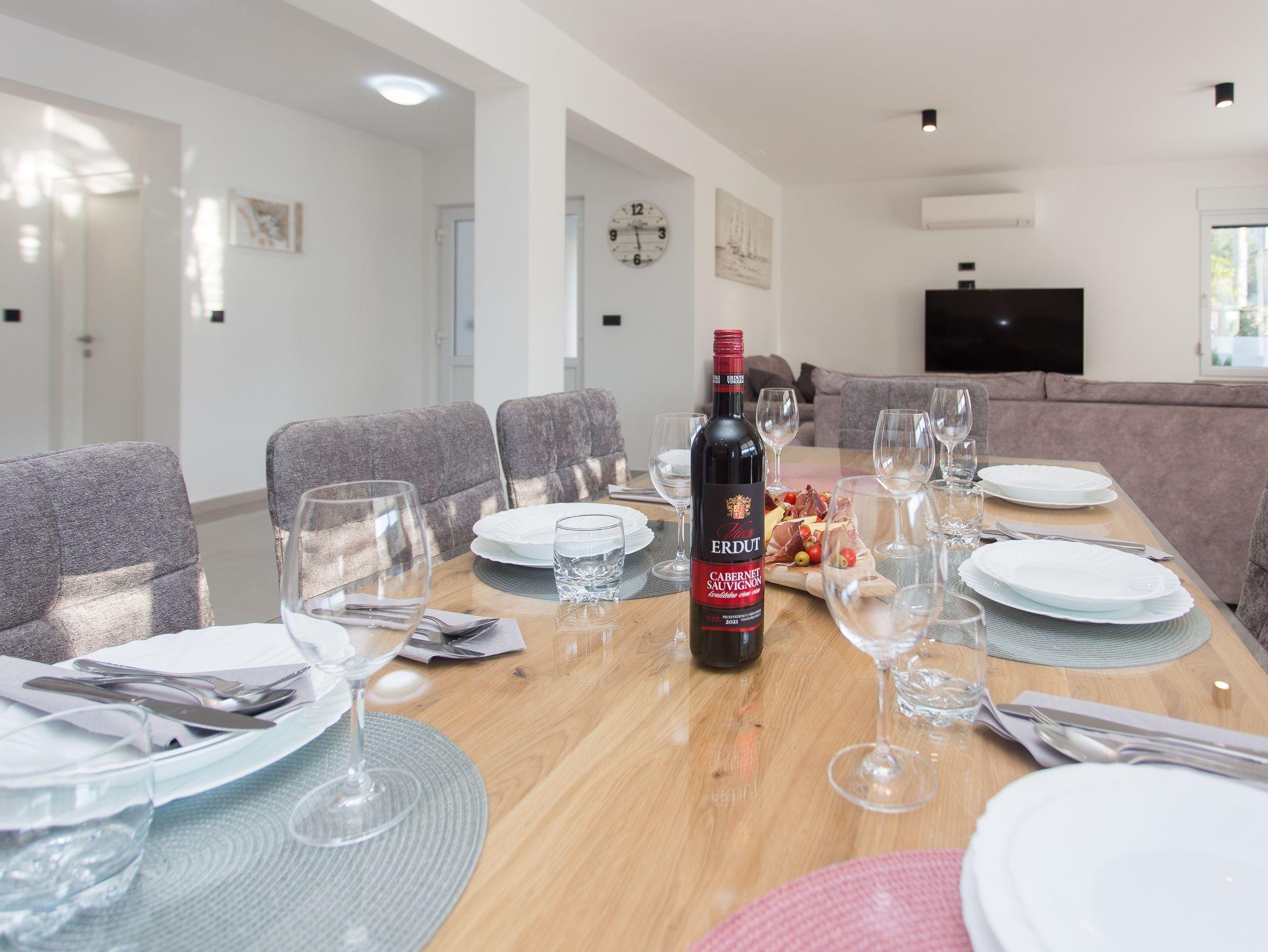 Haus bietet Platz für 10 Gäste. Die Betten sind in Schlafzimmern, die es 5 gibt, innerhalb einer Gesamtfläche von 184m2, angeordnet. Die Gäste haben eine eigene Terrasse zur Verfügung, auf der sie in warmen Sommernächten genießen können. Für vollen Genuss und Entspannung gibt es einen privaten Grill für Gäste dieser Unterkunft. Während ihres Aufenthalts können sich Gäste im privaten Schwimmbad entspannen. IM PREIS INBEGRIFFEN: Kurtaxe, Endreinigung, Klimatisierung, Pool, Parkplatz, Internet, Kinderbett, Bügeleisen, Bügelbrett, Föhn. Die Verfügbarkeit zusätzlicher Dienstleistungen in Ihrem reservierten Termin und die Preise derselben (falls nicht aufgeführt) müssen im Voraus überprüft werden. Zusätzliche Dienstleistungen die in der Zahlungsaufforderung nicht aufgeführt sind werden direkt beim Vermieter bezahlt, angenommen der Gast nutzt auch diese.
