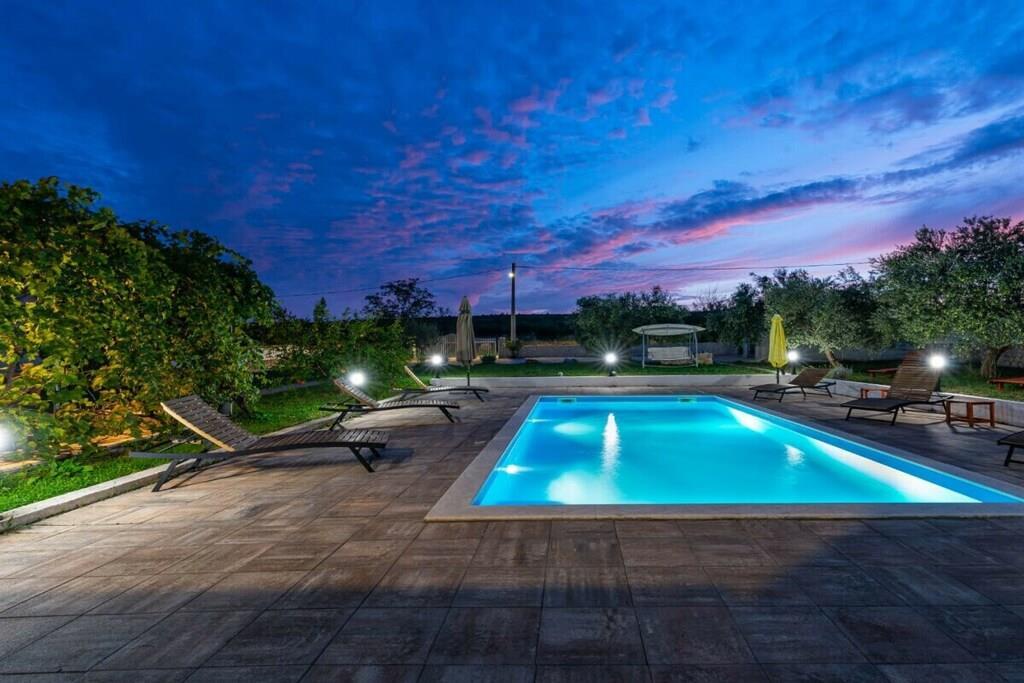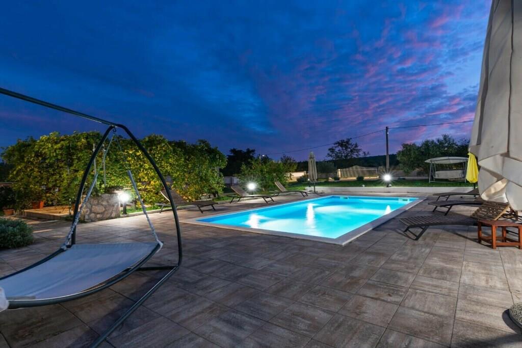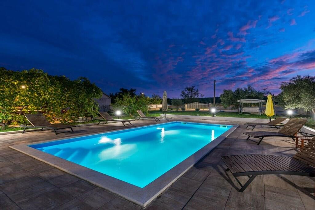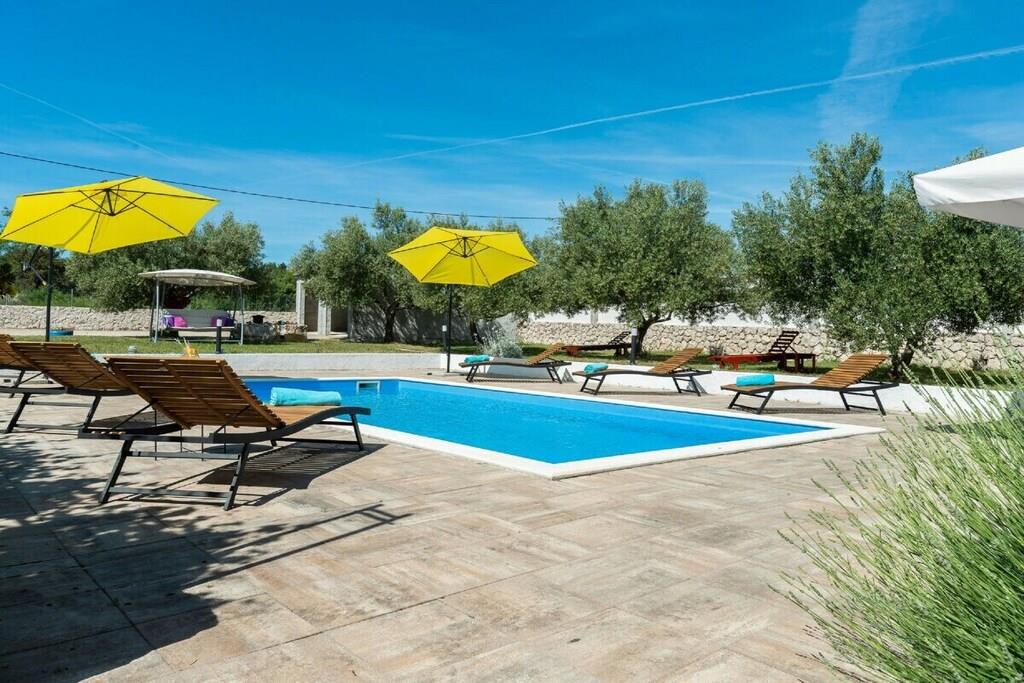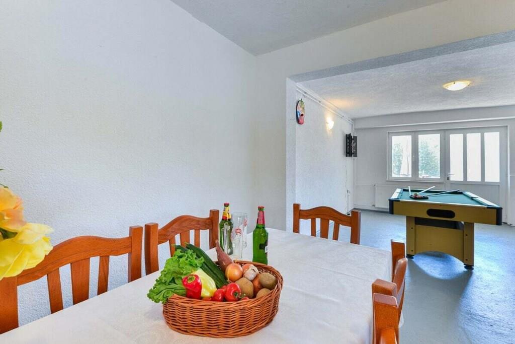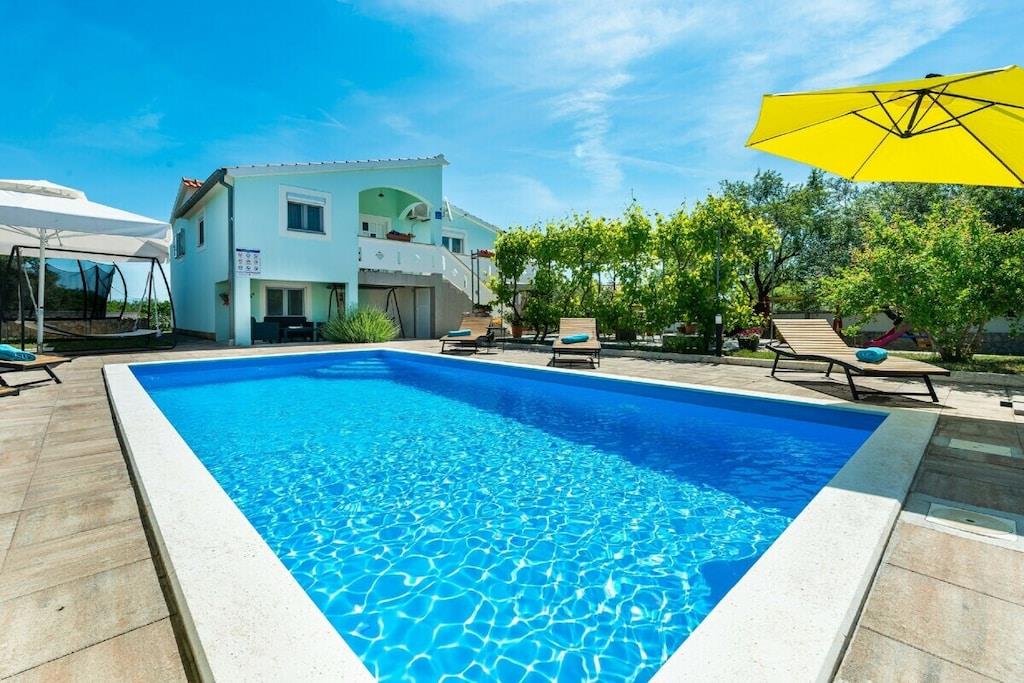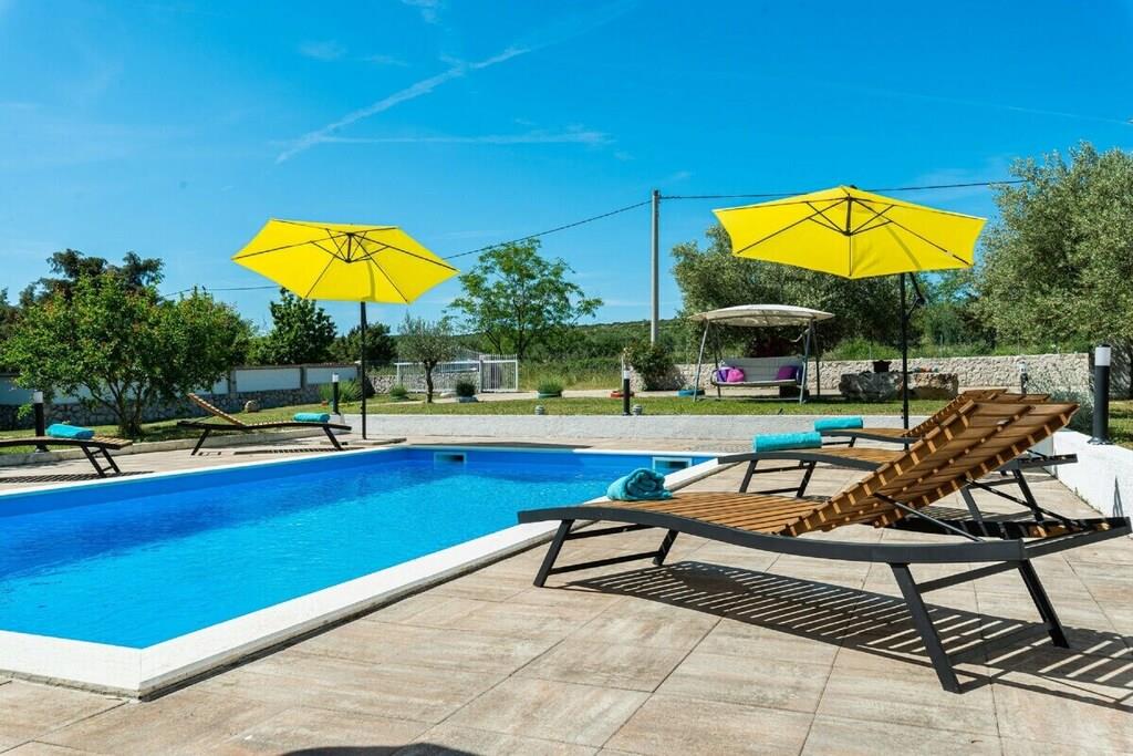 Das Ferienhaus Marina befindet sich im Dorf Glavica - Sukošan, 3,5 km vom Strand im Landkreis Zadar entfernt. Das Anwesen ist komplett eingezäunt, umgeben von Natur und grünen Hügeln. Das Haus ist 130 m² groß und besteht aus einer voll ausgestatteten Küche, einem Essbereich, einem Wohnzimmer, 3 Schlafzimmern, eines mit 2 Einzelbetten und 2 mit Doppelbetten. Es gibt auch 2 Badezimmer, eines mit Badewanne und eines mit Dusche. In der Nähe des Außenbereichs befindet sich ein Aufenthaltsraum mit Fitnessgeräten, Billardtisch und Dart, zusätzlicher Küche und Toilette. Im Hof gibt es einen schönen Pool mit Liegestühlen und Liegestühlen, Gartenmöbeln und einer großen Grillstation mit Esstisch. Für unsere Gäste stehen auch Fahrräder zur Verfügung. Haustiere sind gegen Aufpreis willkommen.
