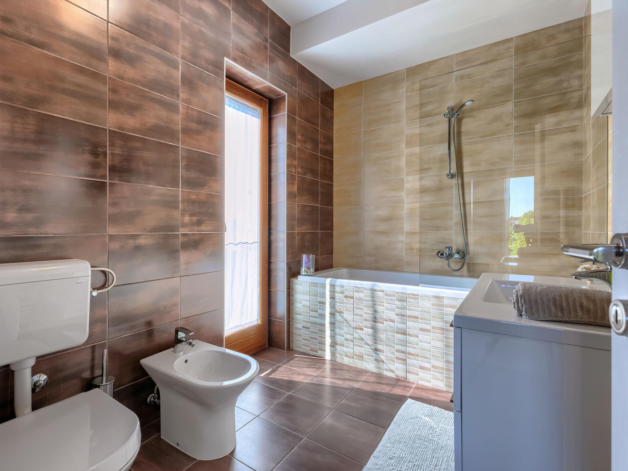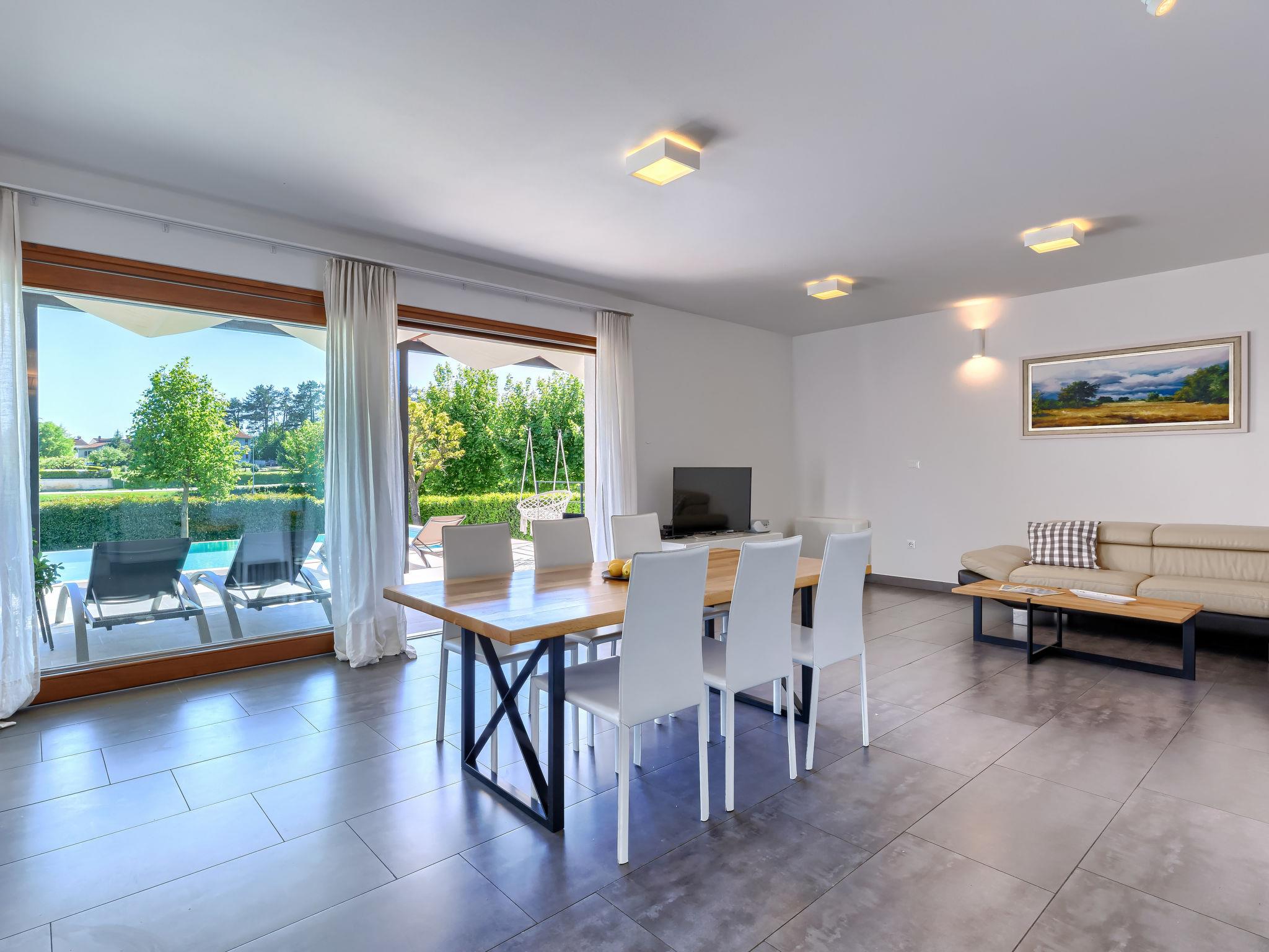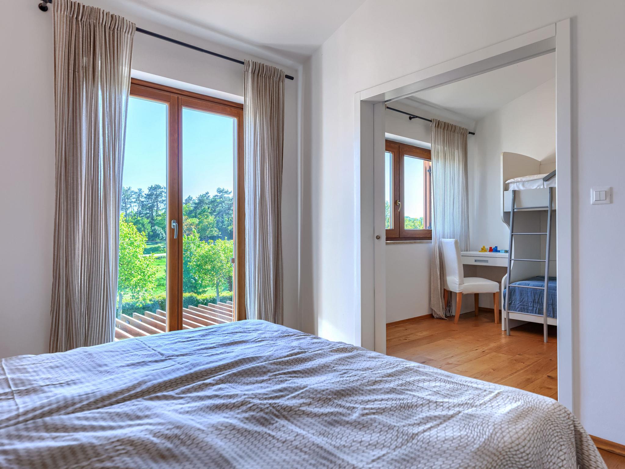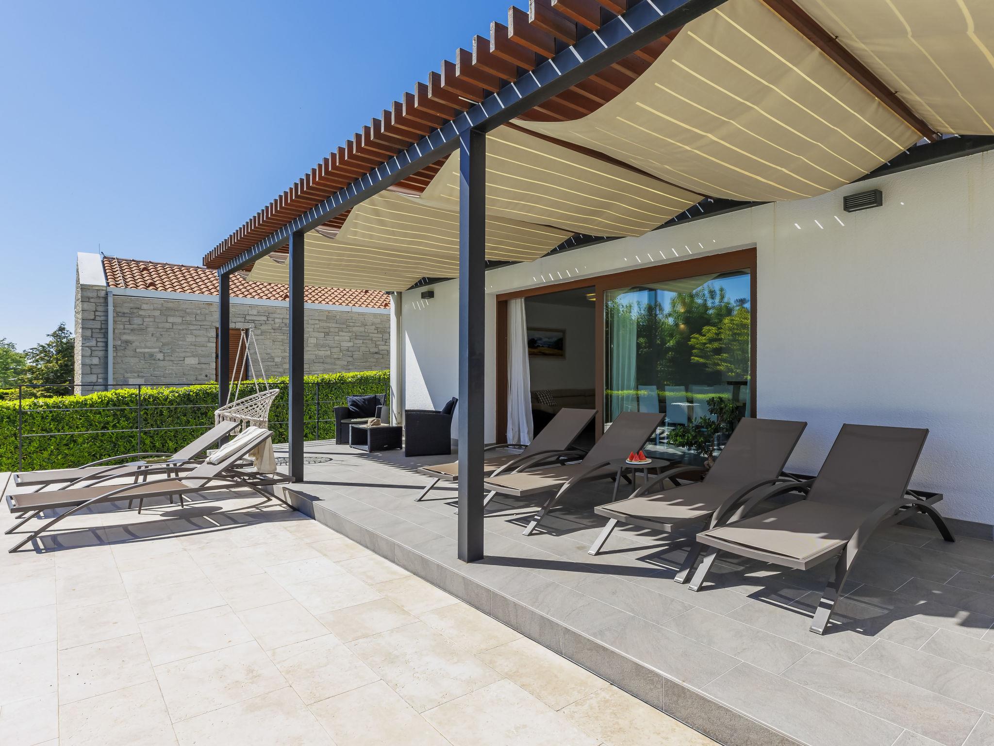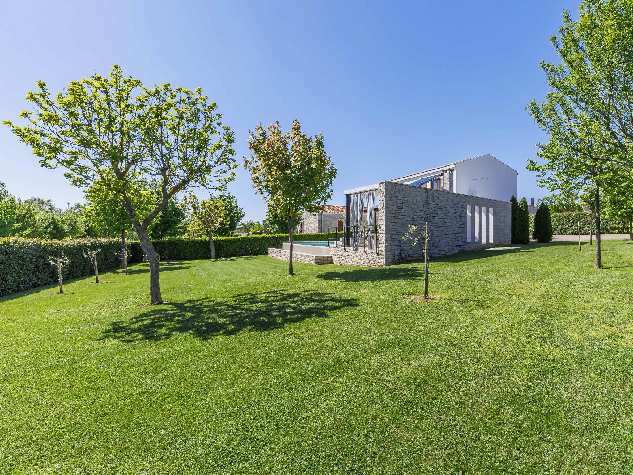 Modern villa "Terra Gialla", 2 storeys. 4 km from the centre of Žminj, 13 km from the centre of Pazin, in a quiet, sunny position, 27 km from the sea. Private: property 1'465 m2, beautiful, well-kept garden with lawn, swimming pool angular (10 x 4 m, depth 140 cm, seasonal availability: 01.Jan. - 31.Dec.) with internal staircase. Outdoor shower, terrace (18 m2), garden furniture, barbecue. In the house: internet access, washing machine, tumble dryer. Roofed, parking (for 2 cars) at the house on the premises. Shop 100 m, supermarket 6 km, restaurant 1 km, café 500 m, bus stop 6.9 km, railway station 500 m, pebble beach 27 km. Riding stable 2 km, walking paths from the house 1 km, cycle lane 1 km. Groups of teenagers on request only. Massage 500 m.