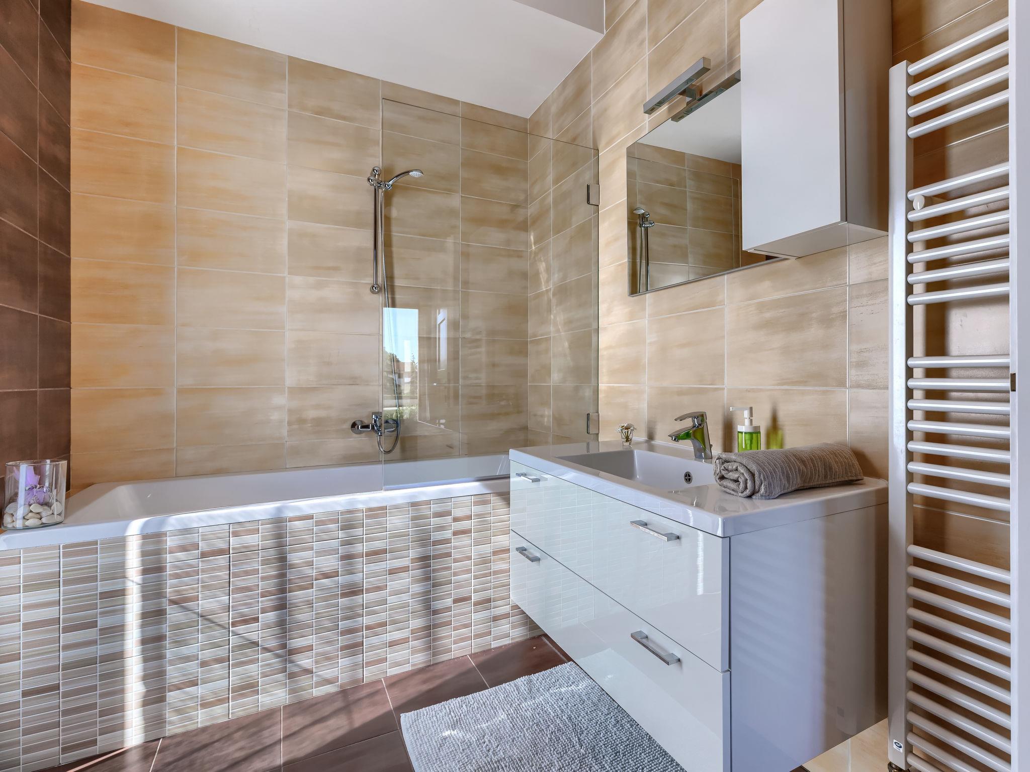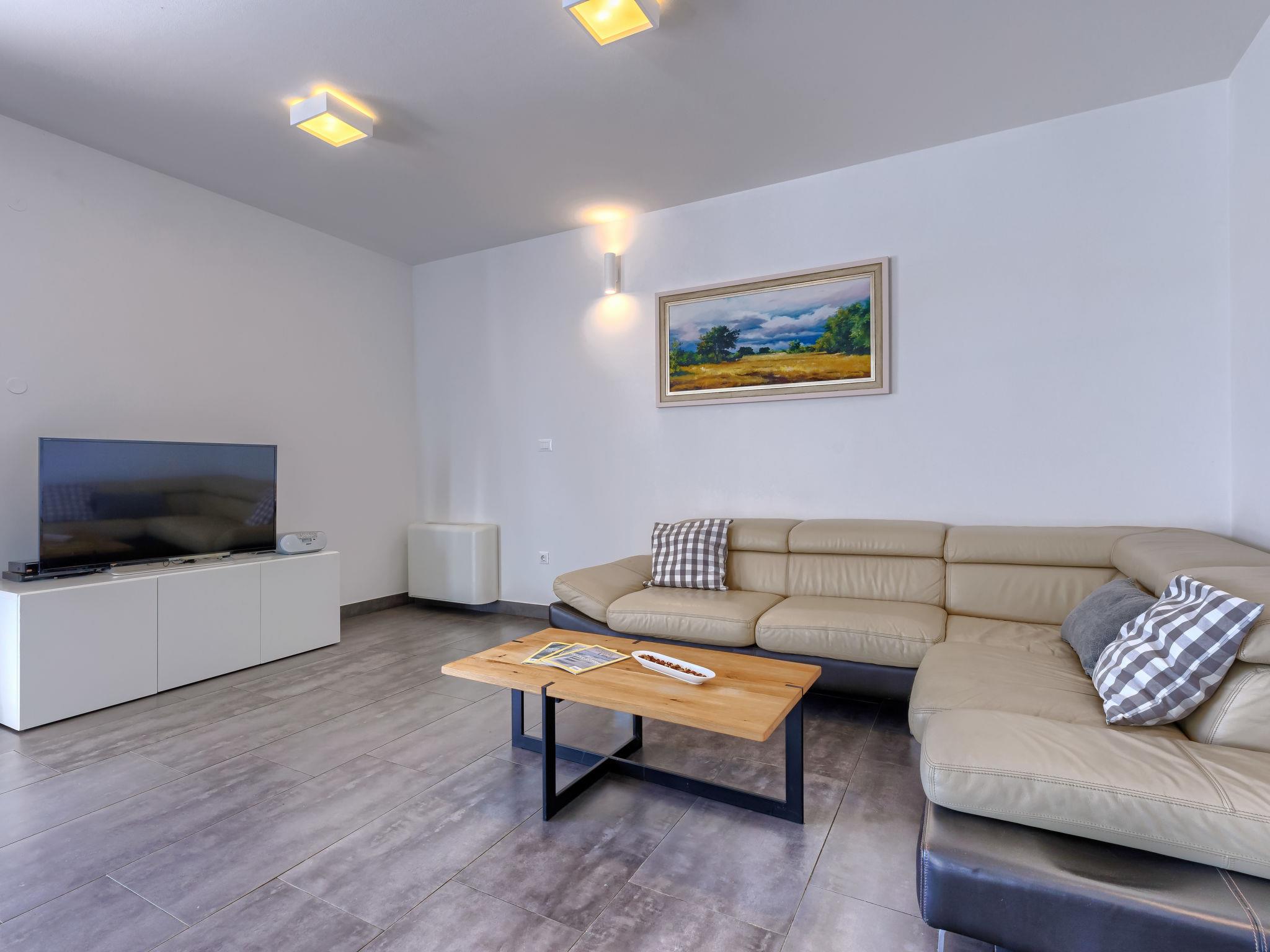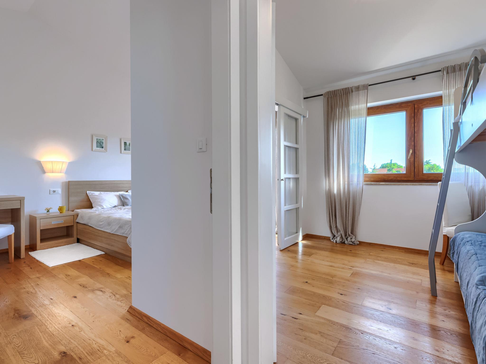 4-room villa 154 m2 on 2 levels. Beautiful furnishings: living/dining room with open-hearth fireplace (only for decoration), satellite TV (flat screen), hi-fi system, DVD and air conditioning. Exit to the terrace, to the swimming pool. Open kitchen (oven, dishwasher, 4 ceramic glass hob hotplates, microwave, freezer). Sep. WC. Upper floor: 1 room with 1 french bed (180 cm, length 200 cm), bath/bidet/WC and air conditioning. 1 room with 1 french bed (180 cm, length 190 cm), bath/bidet/WC. 1 room with 1 x 2 bunk beds (90 cm, length 200 cm). Heating. Deck chairs. Facilities: safe, children's high chair, baby cot. Internet (WiFi, free). Maximum 1 pet/ dog allowed. UP/I-335-02/14-01/41