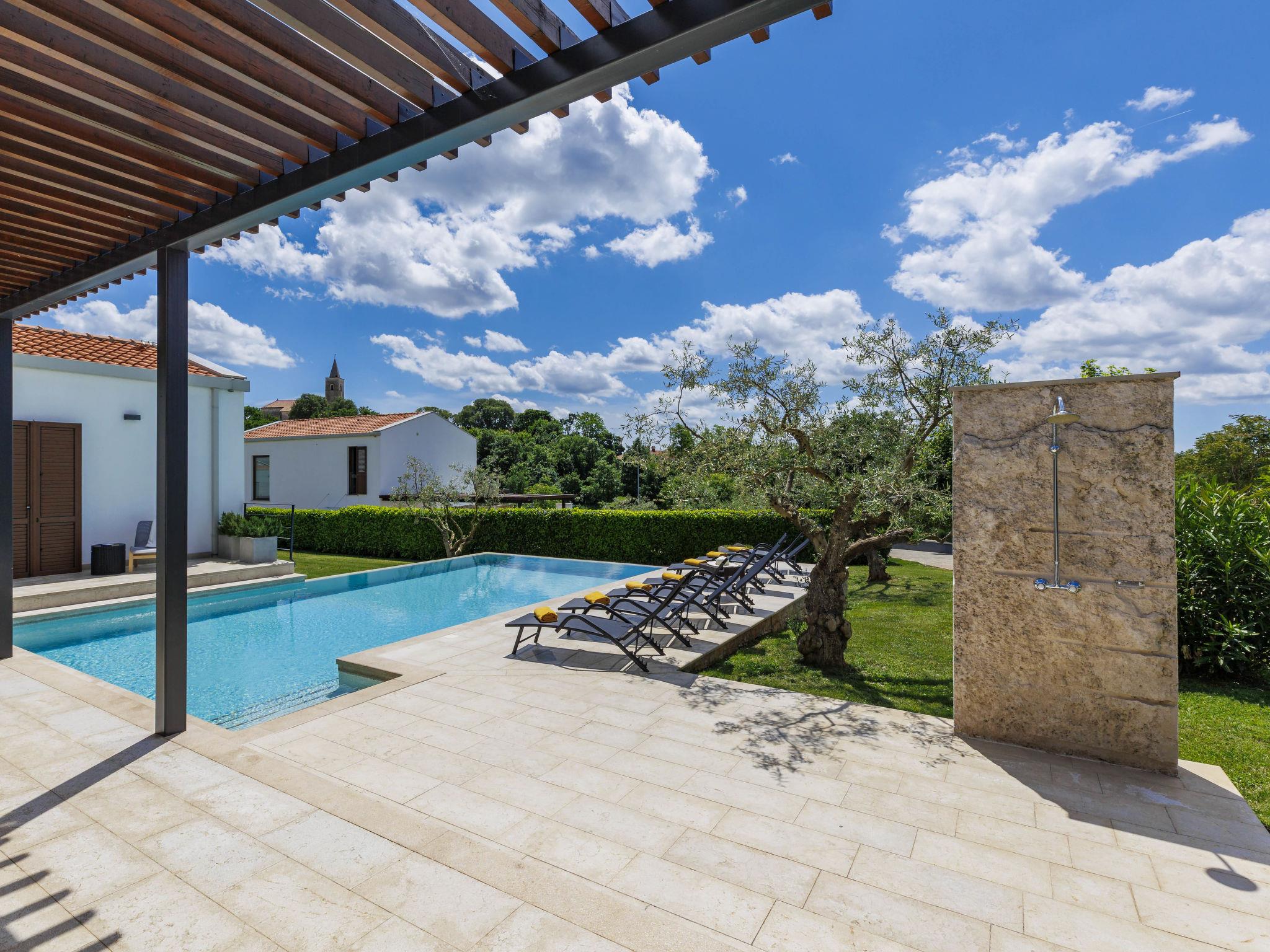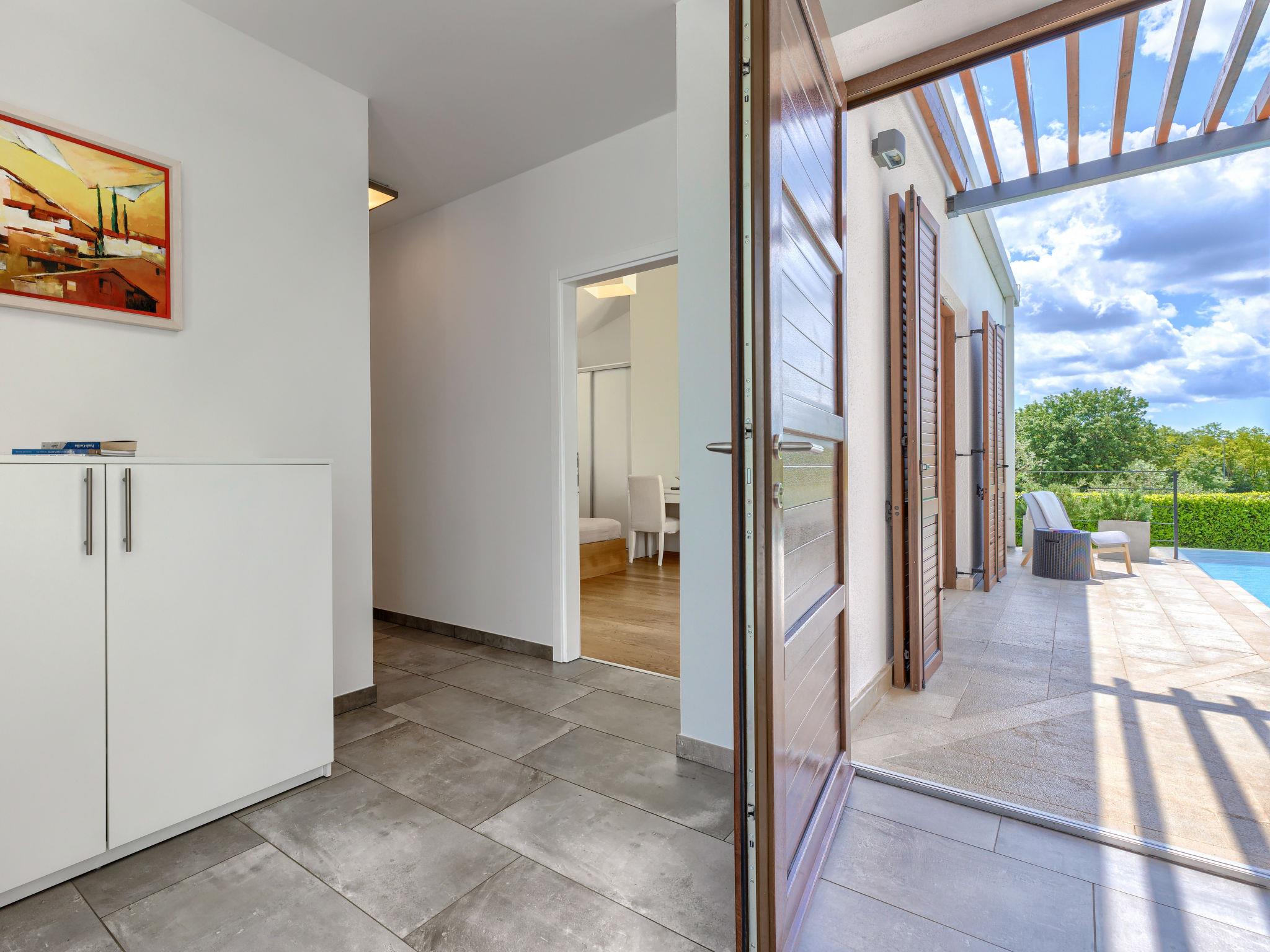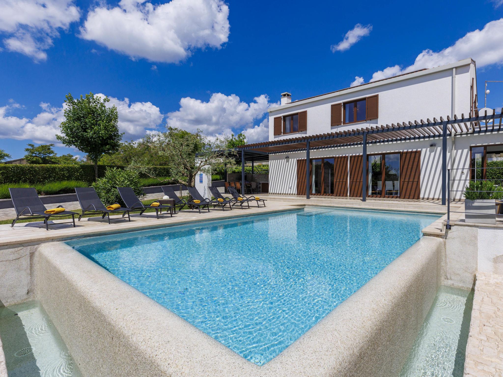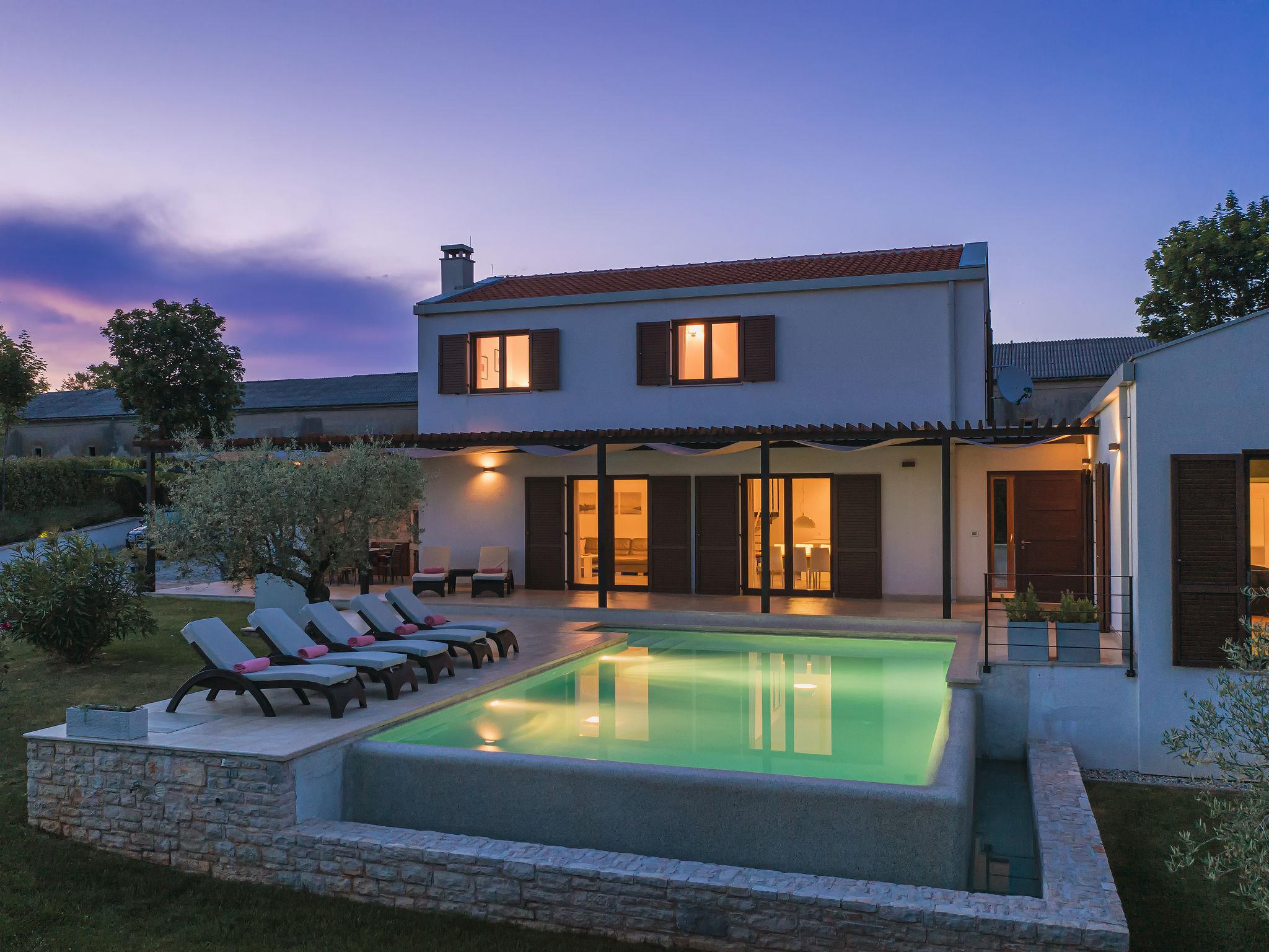 Modern villa "Luna Rossa", 2 storeys. 6 km from the centre of Žminj, 13 km from the centre of Pazin, in a quiet, sunny position, 27 km from the sea. Private: property 600 m2, beautiful, well-kept garden, swimming pool angular (5 x 10 m, depth 140 cm, seasonal availability: 01.Jan. - 31.Dec.) with internal staircase. Outdoor shower, terrace (20 m2), garden furniture, barbecue. In the house: internet access, washing machine, tumble dryer. Roofed, parking (for 3 cars) at the house on the premises. Shop 600 m, supermarket 6 km, restaurant 1 km, café 400 m, bus stop 7 km, railway station 500 m, pebble beach 27 km. Riding stable 7 km, walking paths from the house 1 km, cycle lane 1 km. Groups of teenagers on request only.