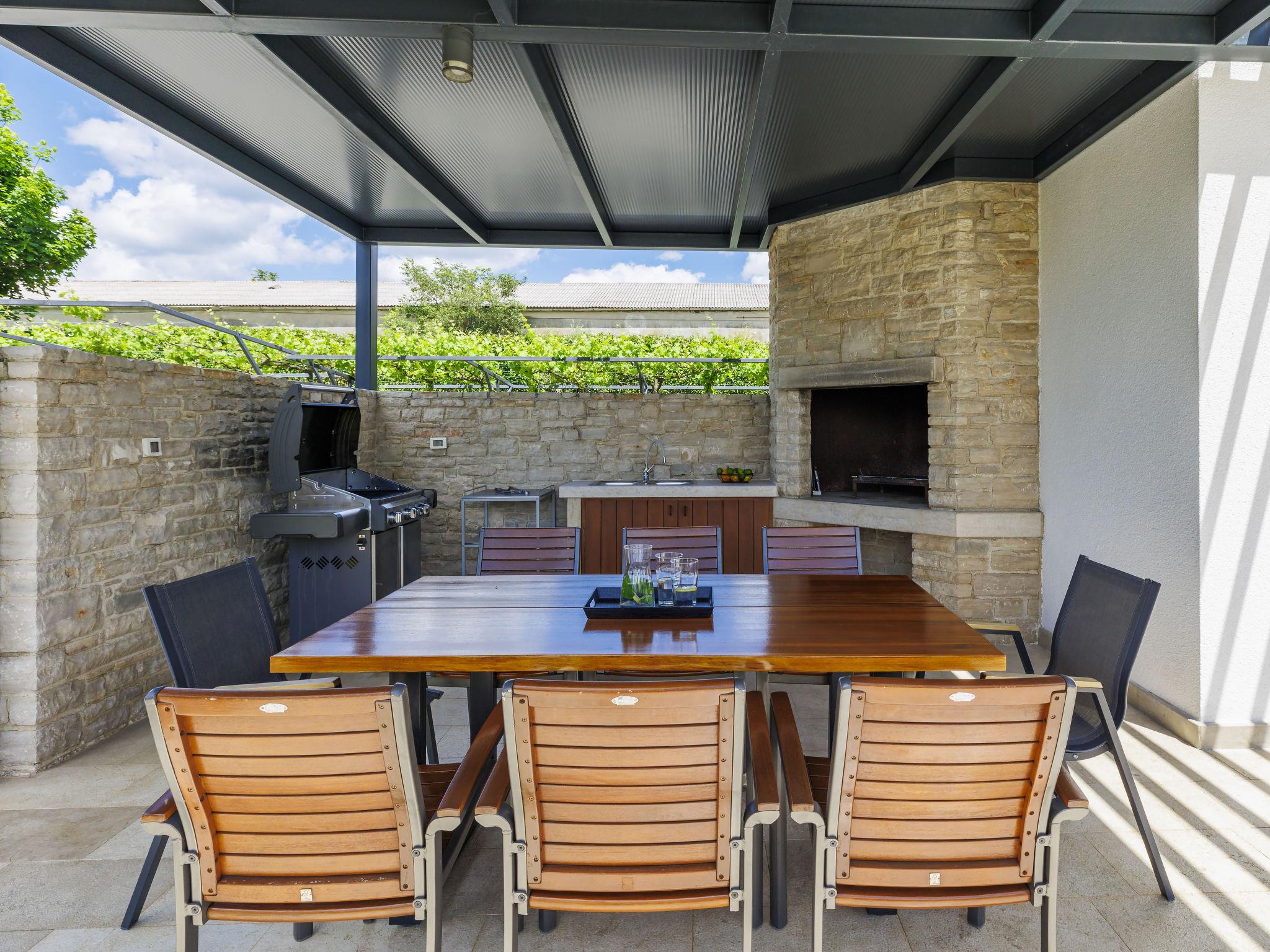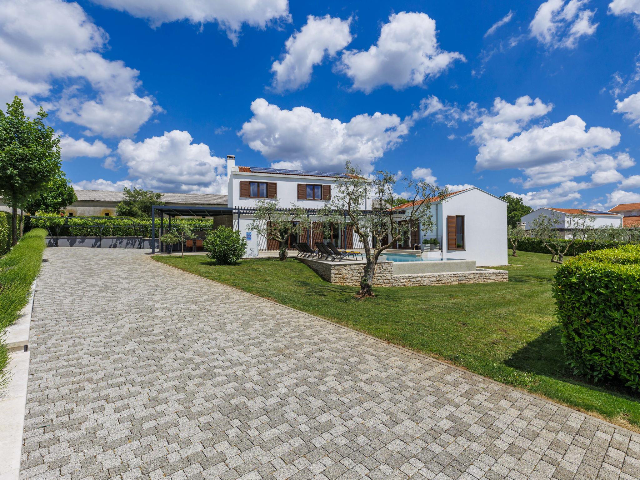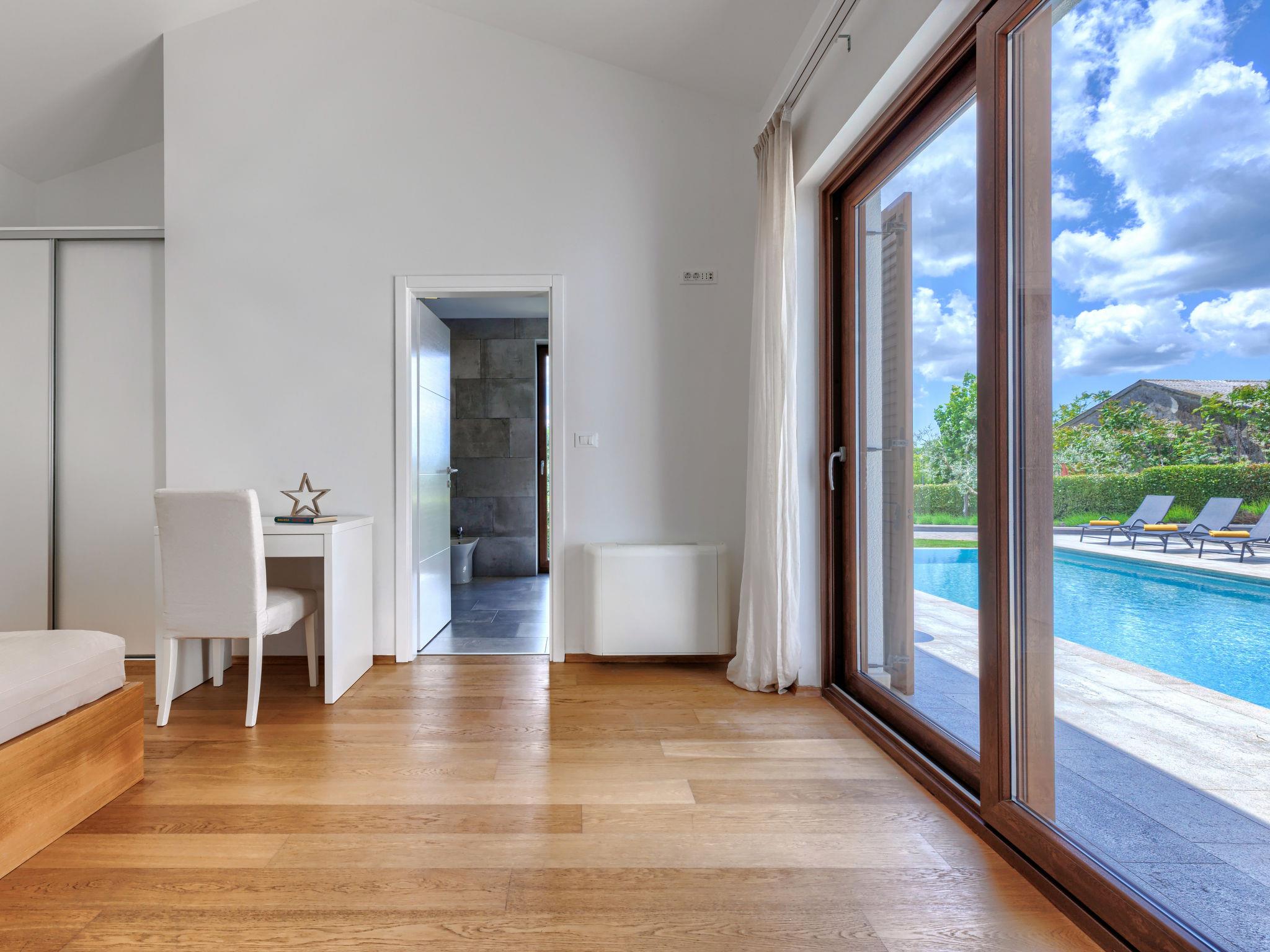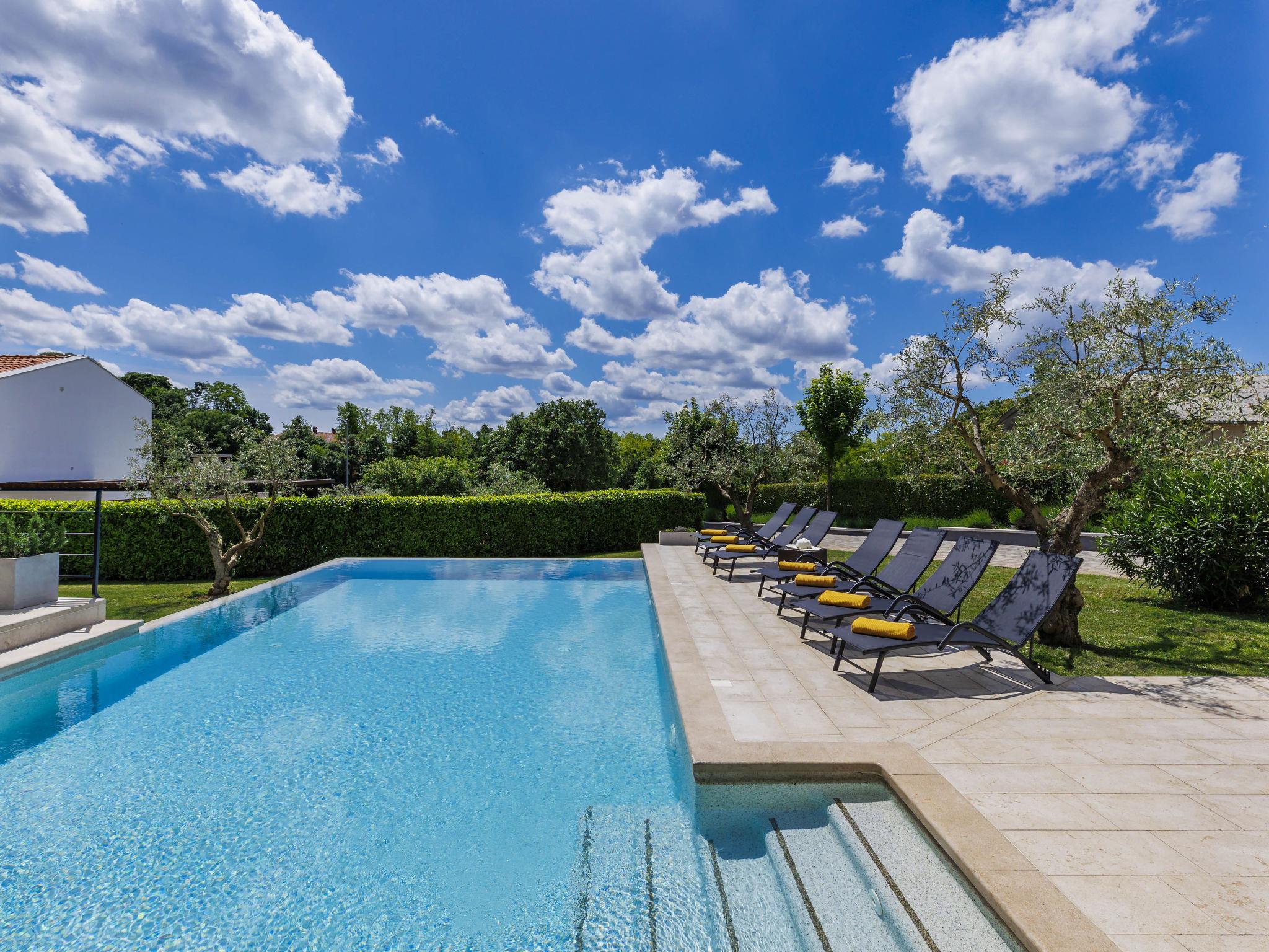 Modern villa "Luna Rossa", 2 storeys. 6 km from the centre of Žminj, 13 km from the centre of Pazin, in a quiet, sunny position, 27 km from the sea. Private: property 600 m2, beautiful, well-kept garden, swimming pool angular (5 x 10 m, depth 140 cm, seasonal availability: 01.Jan. - 31.Dec.) with internal staircase. Outdoor shower, terrace (20 m2), garden furniture, barbecue. In the house: internet access, washing machine, tumble dryer. Roofed, parking (for 3 cars) at the house on the premises. Shop 600 m, supermarket 6 km, restaurant 1 km, café 400 m, bus stop 7 km, railway station 500 m, pebble beach 27 km. Riding stable 7 km, walking paths from the house 1 km, cycle lane 1 km. Groups of teenagers on request only.