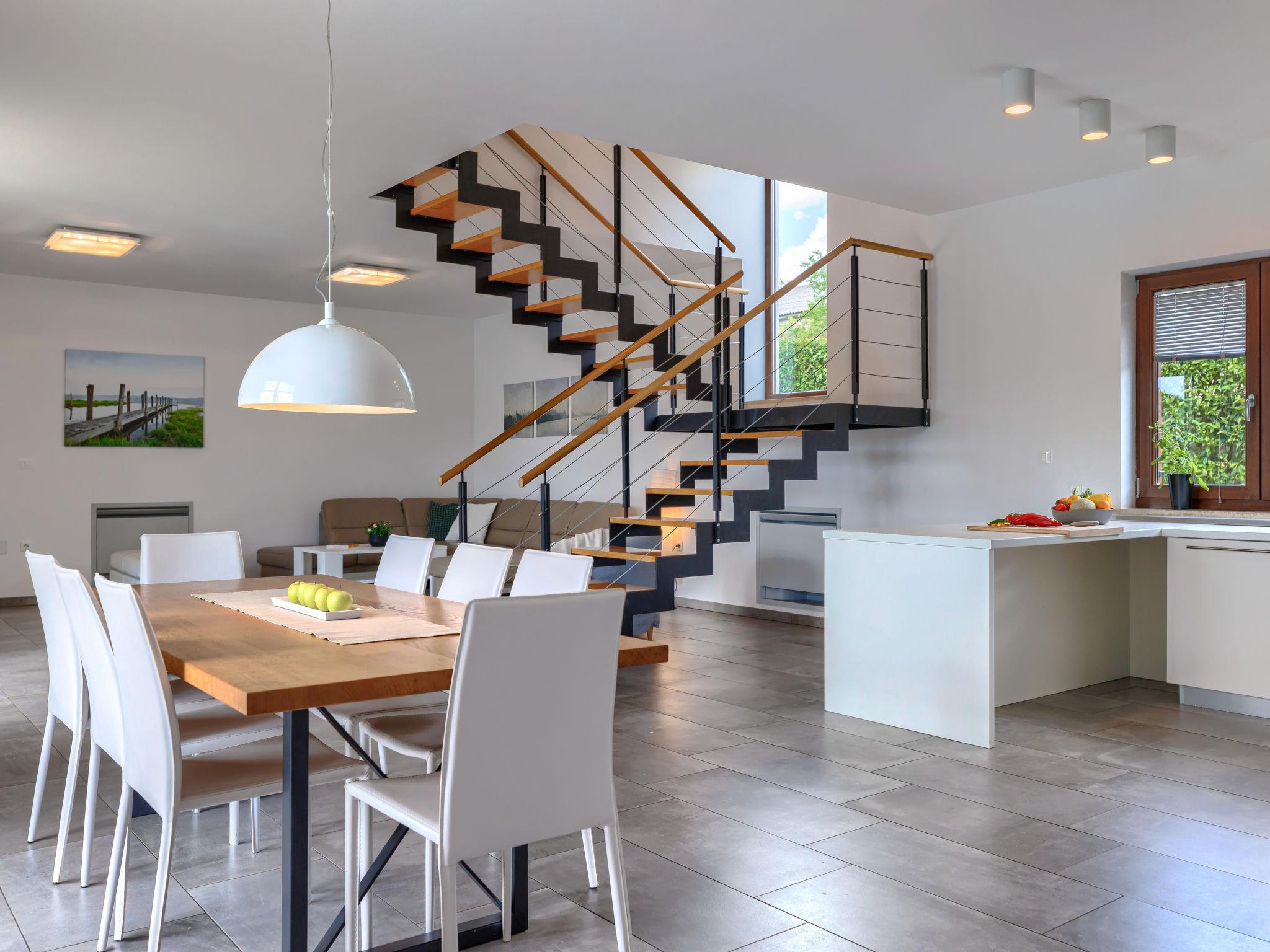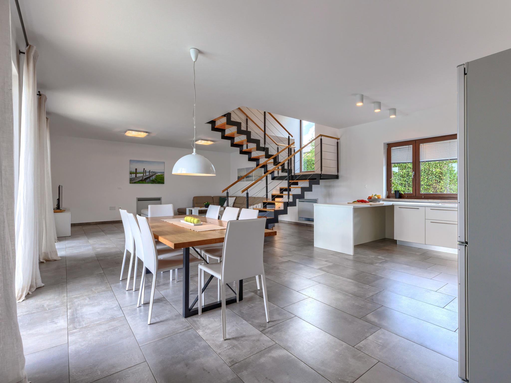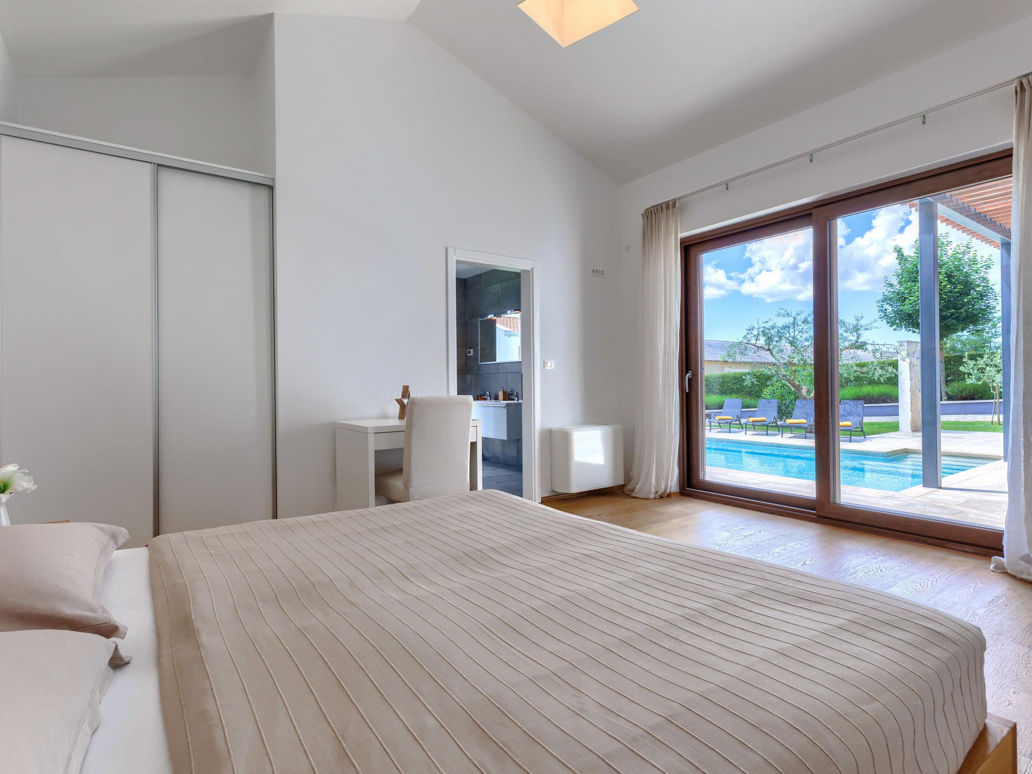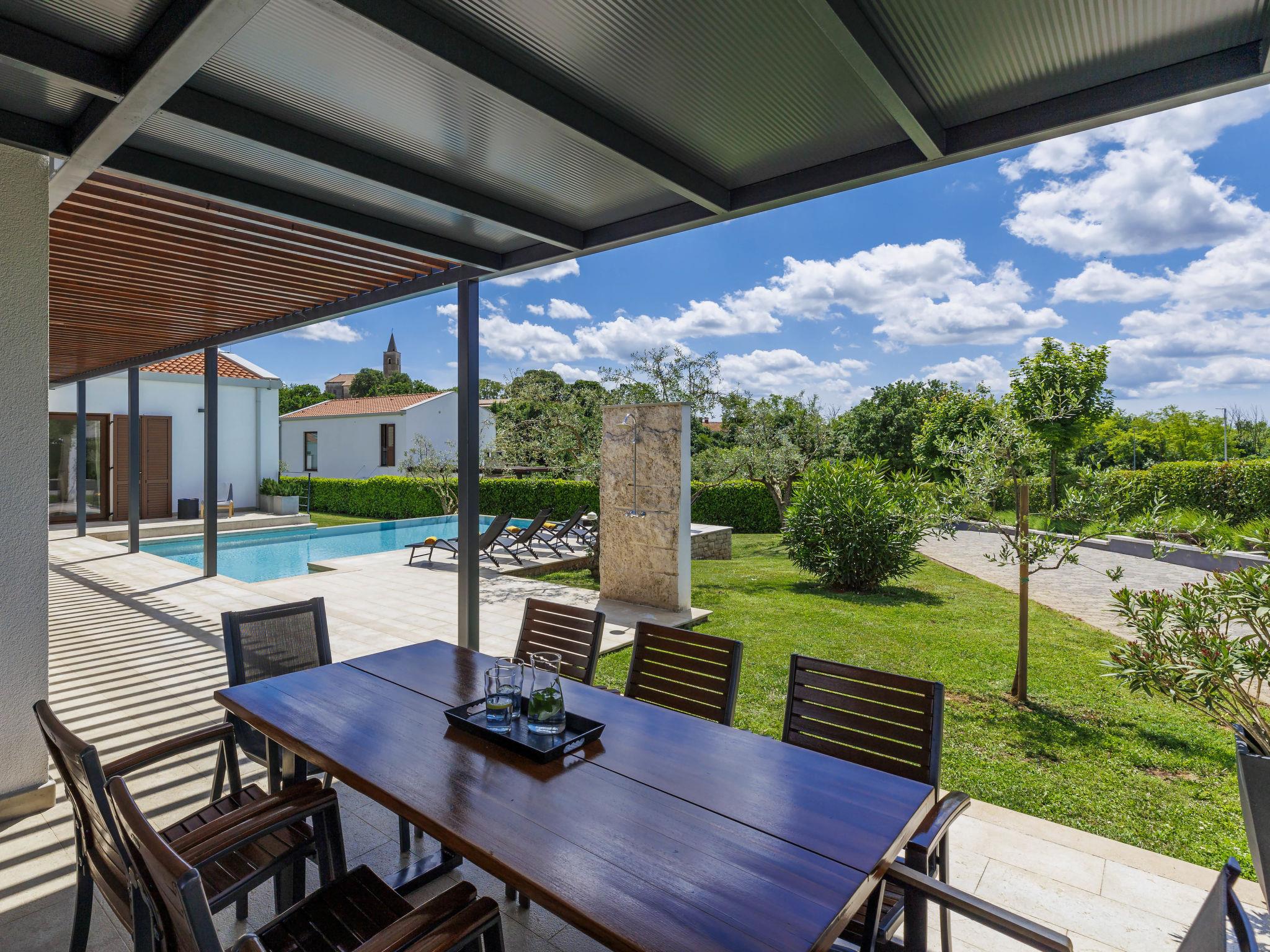 Modern villa "Luna Rossa", 2 storeys. 6 km from the centre of Žminj, 13 km from the centre of Pazin, in a quiet, sunny position, 27 km from the sea. Private: property 600 m2, beautiful, well-kept garden, swimming pool angular (5 x 10 m, depth 140 cm, seasonal availability: 01.Jan. - 31.Dec.) with internal staircase. Outdoor shower, terrace (20 m2), garden furniture, barbecue. In the house: internet access, washing machine, tumble dryer. Roofed, parking (for 3 cars) at the house on the premises. Shop 600 m, supermarket 6 km, restaurant 1 km, café 400 m, bus stop 7 km, railway station 500 m, pebble beach 27 km. Riding stable 7 km, walking paths from the house 1 km, cycle lane 1 km. Groups of teenagers on request only.