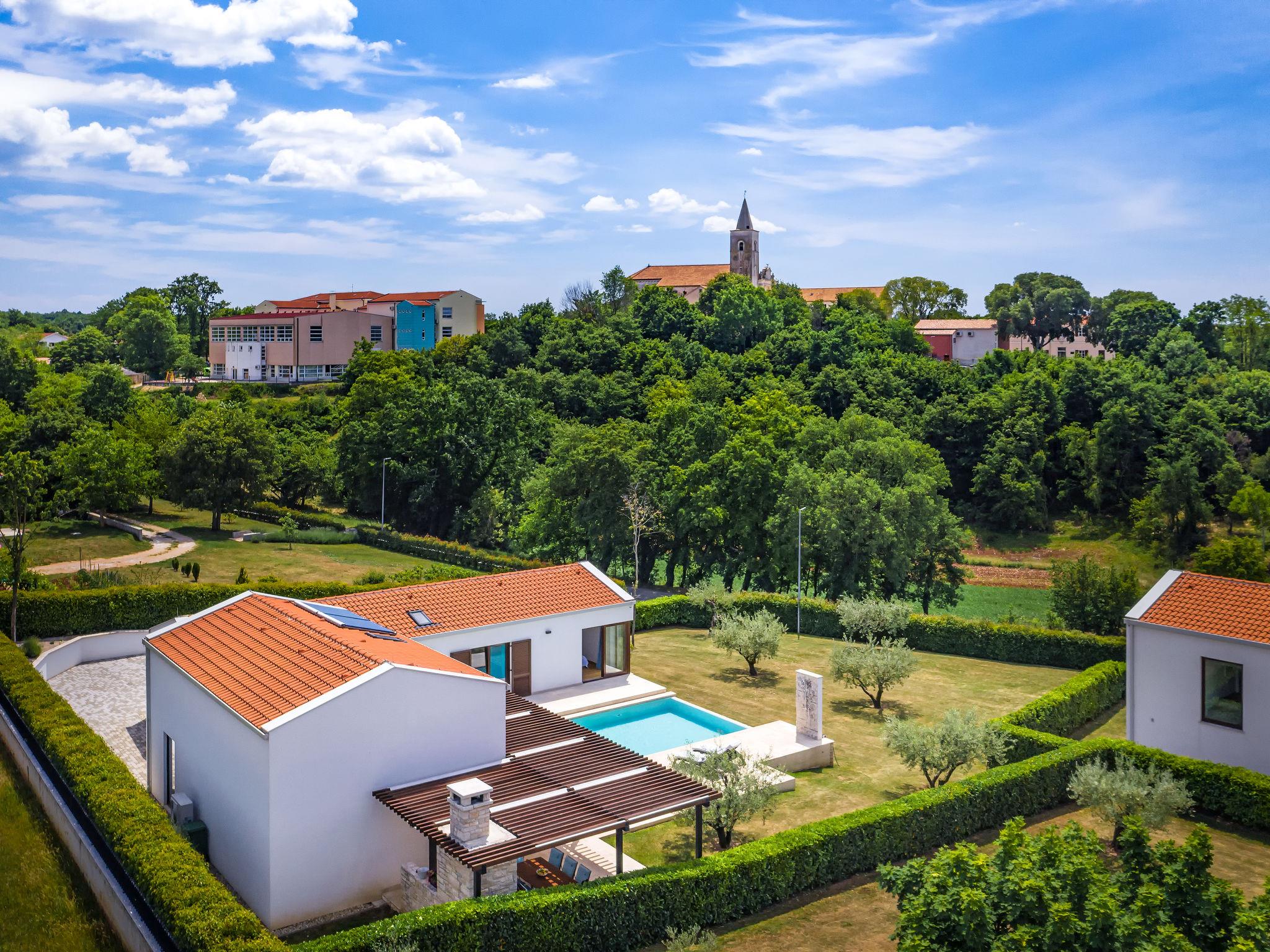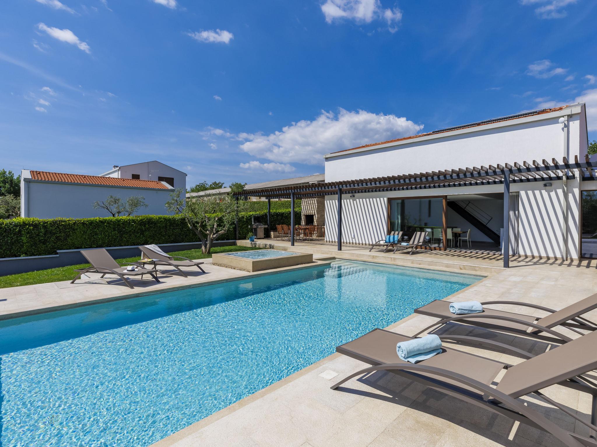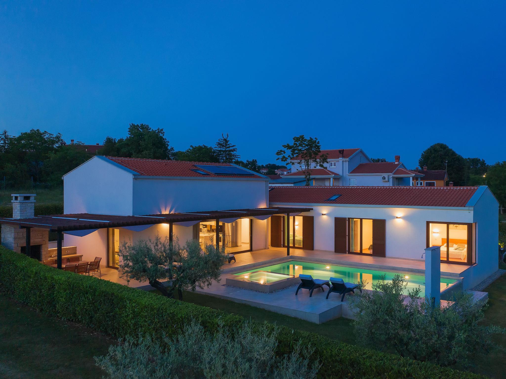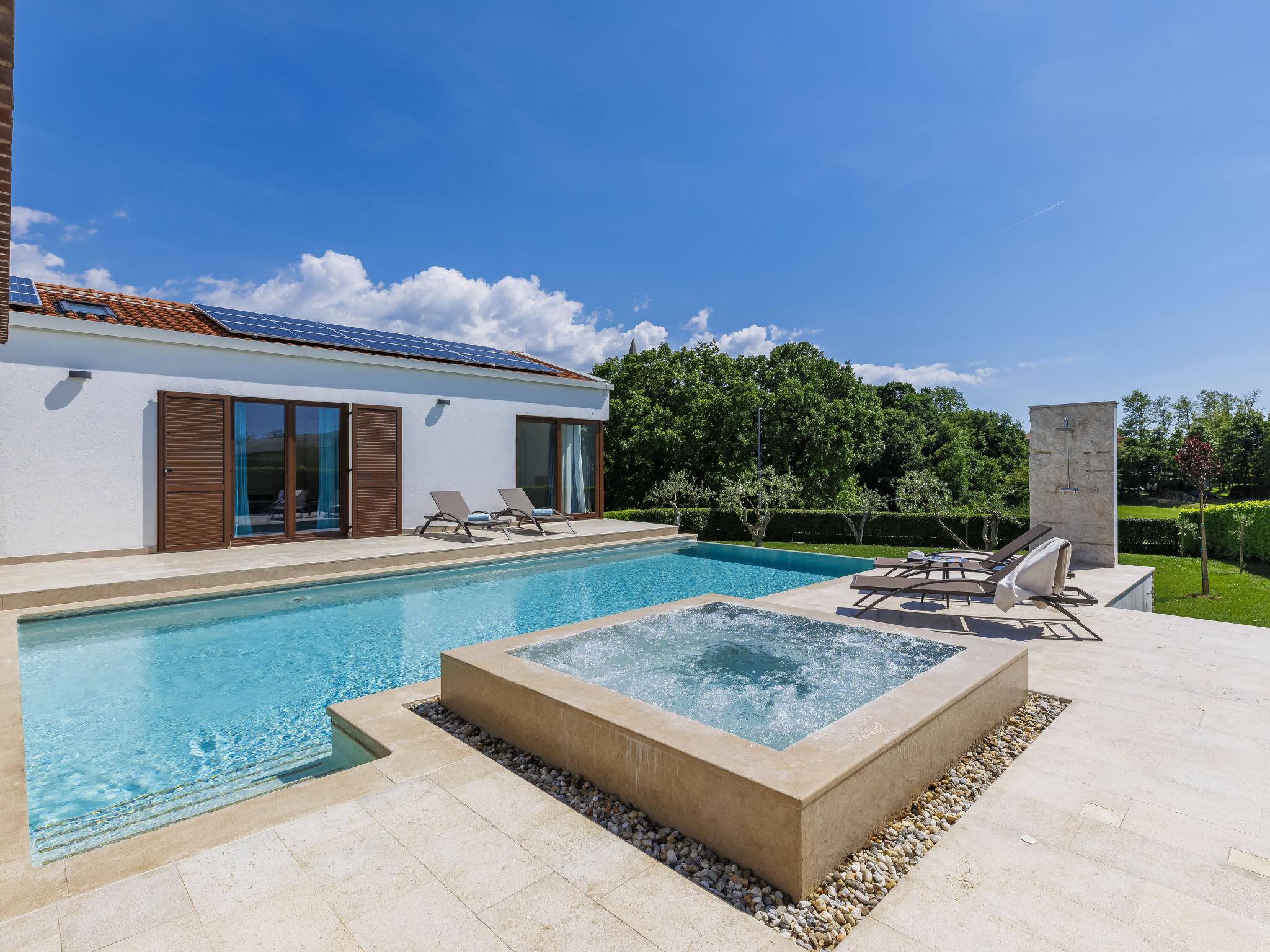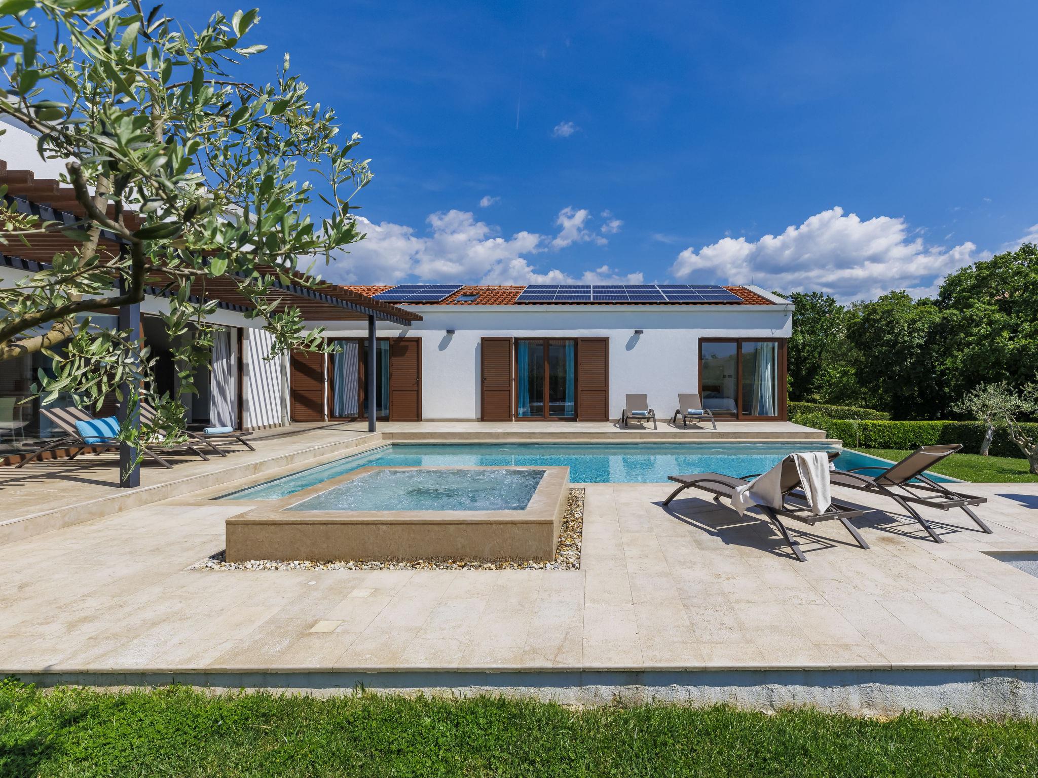 Modern villa "Luna Bianca", built in 2016. 6 km from the centre of Žminj, 13 km from the centre of Pazin, in a quiet, sunny position, 27 km from the sea. Private: property 900 m2, beautiful, well-kept garden with lawn, swimming pool angular (9 x 4 m, depth 140 cm, seasonal availability: 01.Jan. - 31.Dec.) with internal staircase. Outdoor shower, hot tub, terrace (18 m2), garden furniture, barbecue. In the house: internet access, washing machine, tumble dryer. Parking (for 2 cars) at the house on the premises. Shop 600 m, supermarket 6 km, restaurant 1 km, café 400 m, bus stop 6.7 km, railway station 500 m, pebble beach 27 km. Riding stable 7 km, walking paths from the house 1 km, cycle lane 1 km. Groups of teenagers on request only.