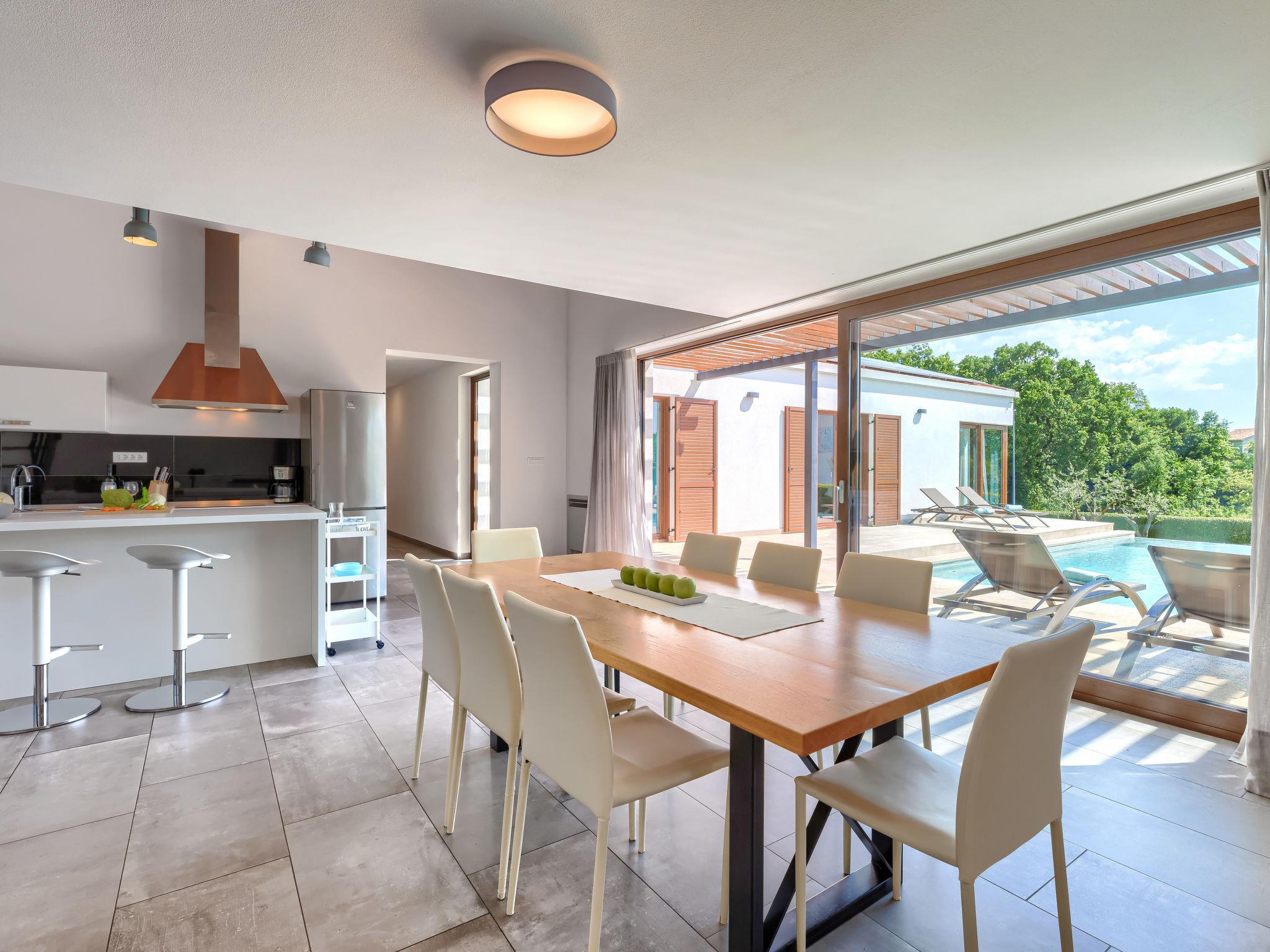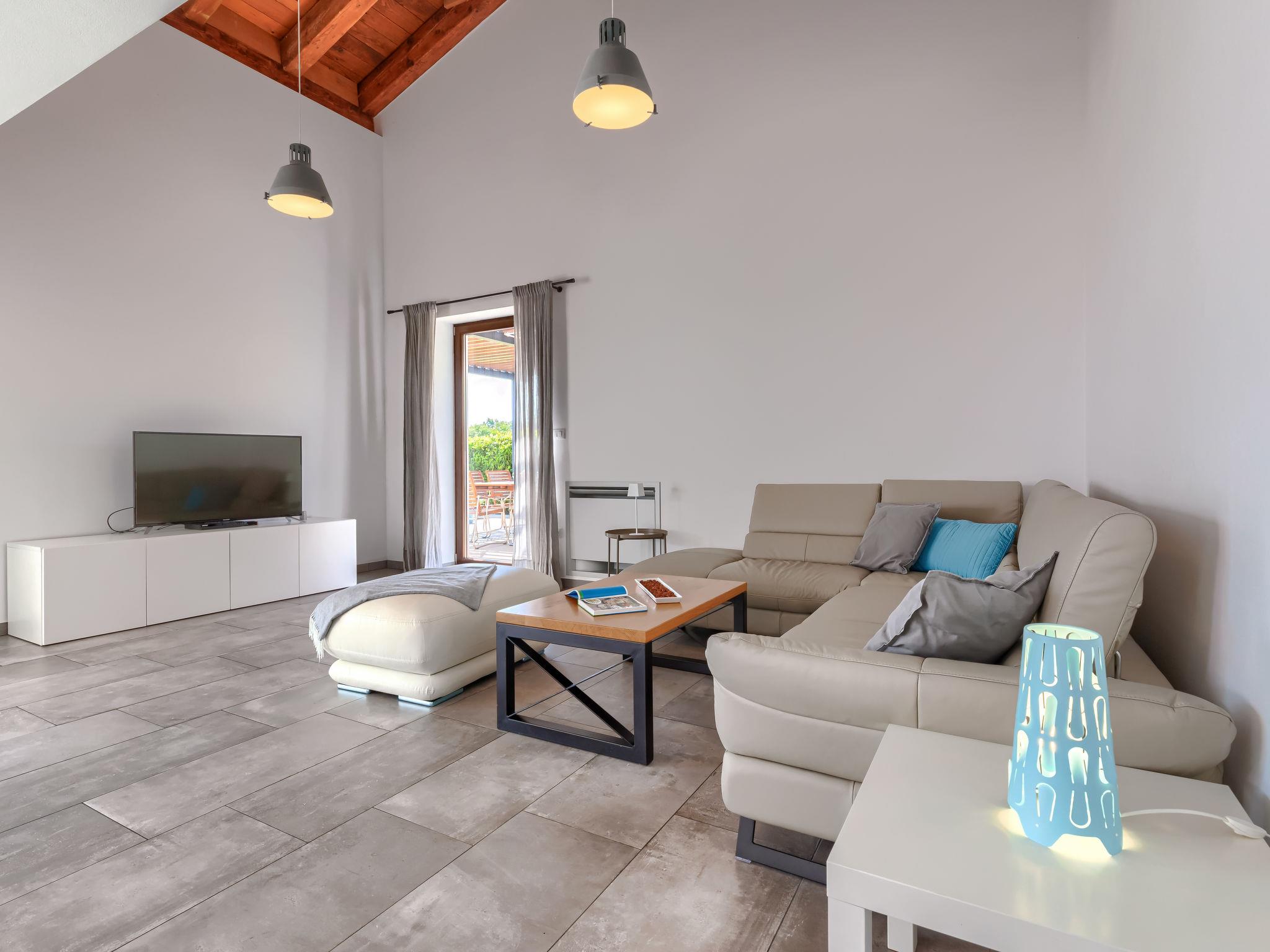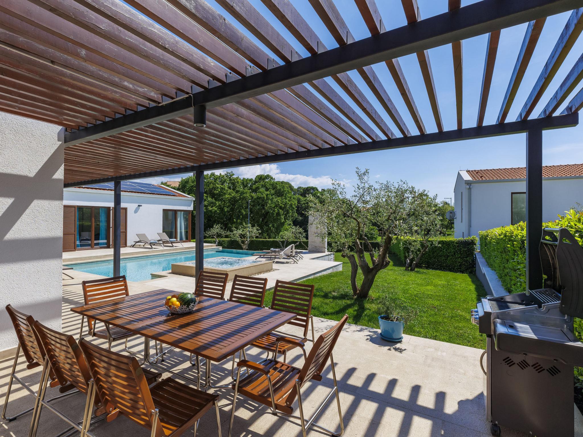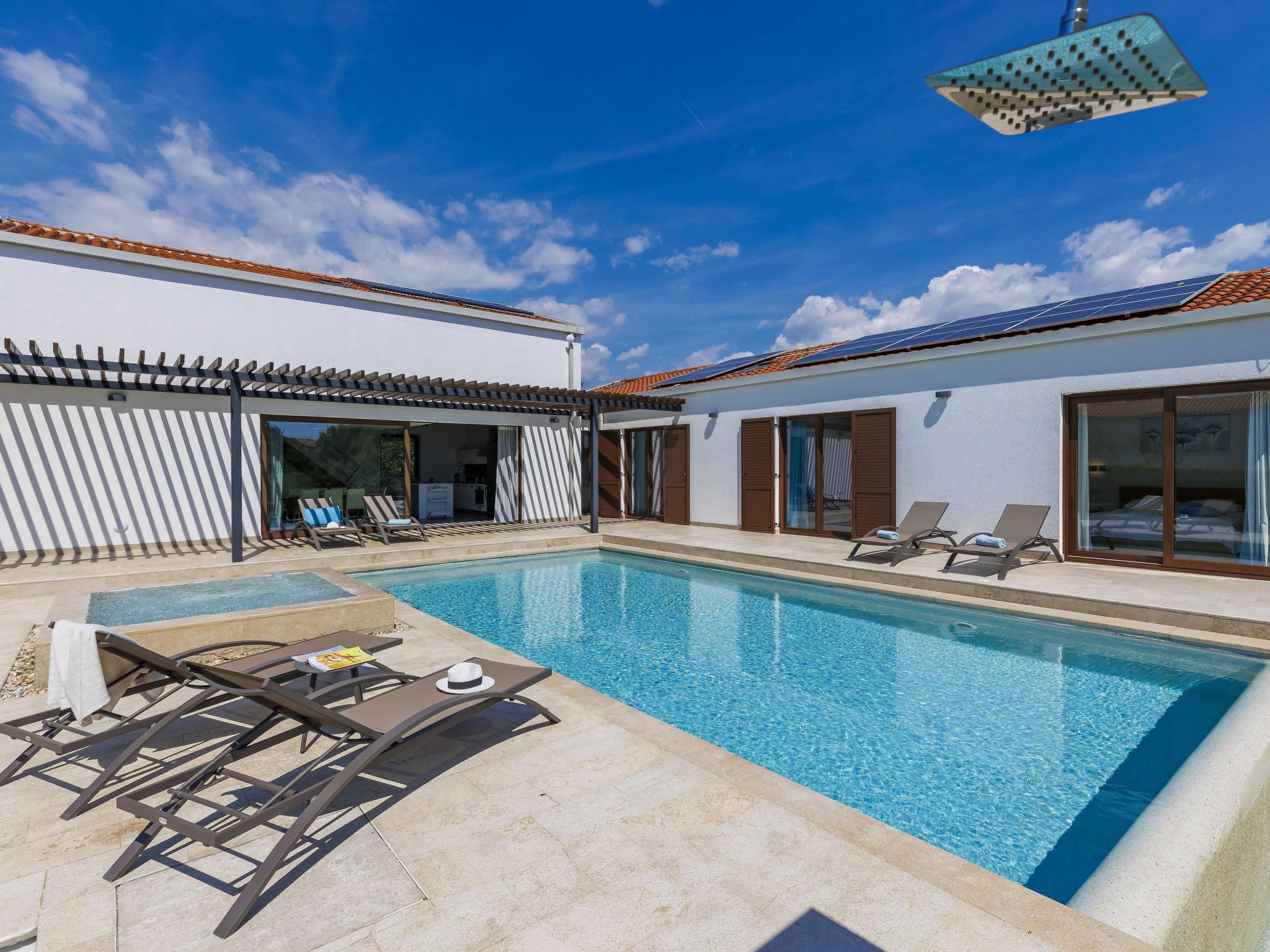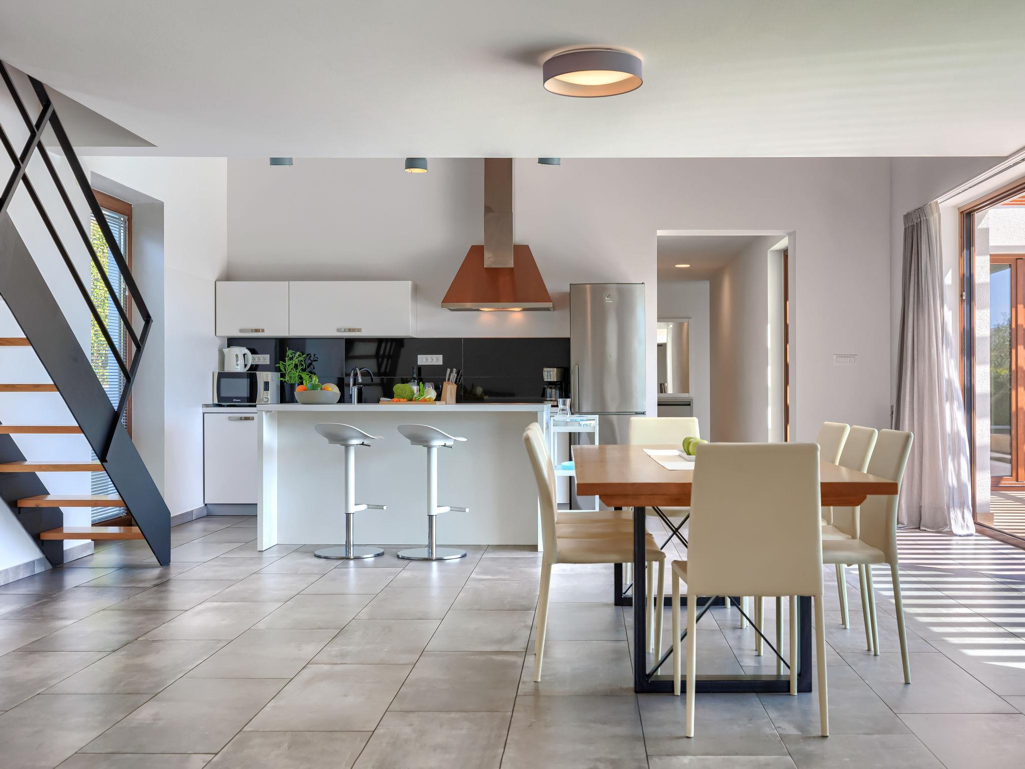 Modern villa "Luna Bianca", built in 2016. 6 km from the centre of Žminj, 13 km from the centre of Pazin, in a quiet, sunny position, 27 km from the sea. Private: property 900 m2, beautiful, well-kept garden with lawn, swimming pool angular (9 x 4 m, depth 140 cm, seasonal availability: 01.Jan. - 31.Dec.) with internal staircase. Outdoor shower, hot tub, terrace (18 m2), garden furniture, barbecue. In the house: internet access, washing machine, tumble dryer. Parking (for 2 cars) at the house on the premises. Shop 600 m, supermarket 6 km, restaurant 1 km, café 400 m, bus stop 6.7 km, railway station 500 m, pebble beach 27 km. Riding stable 7 km, walking paths from the house 1 km, cycle lane 1 km. Groups of teenagers on request only.