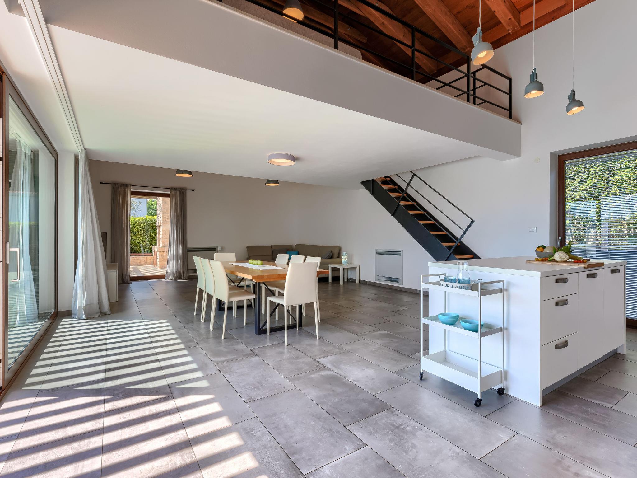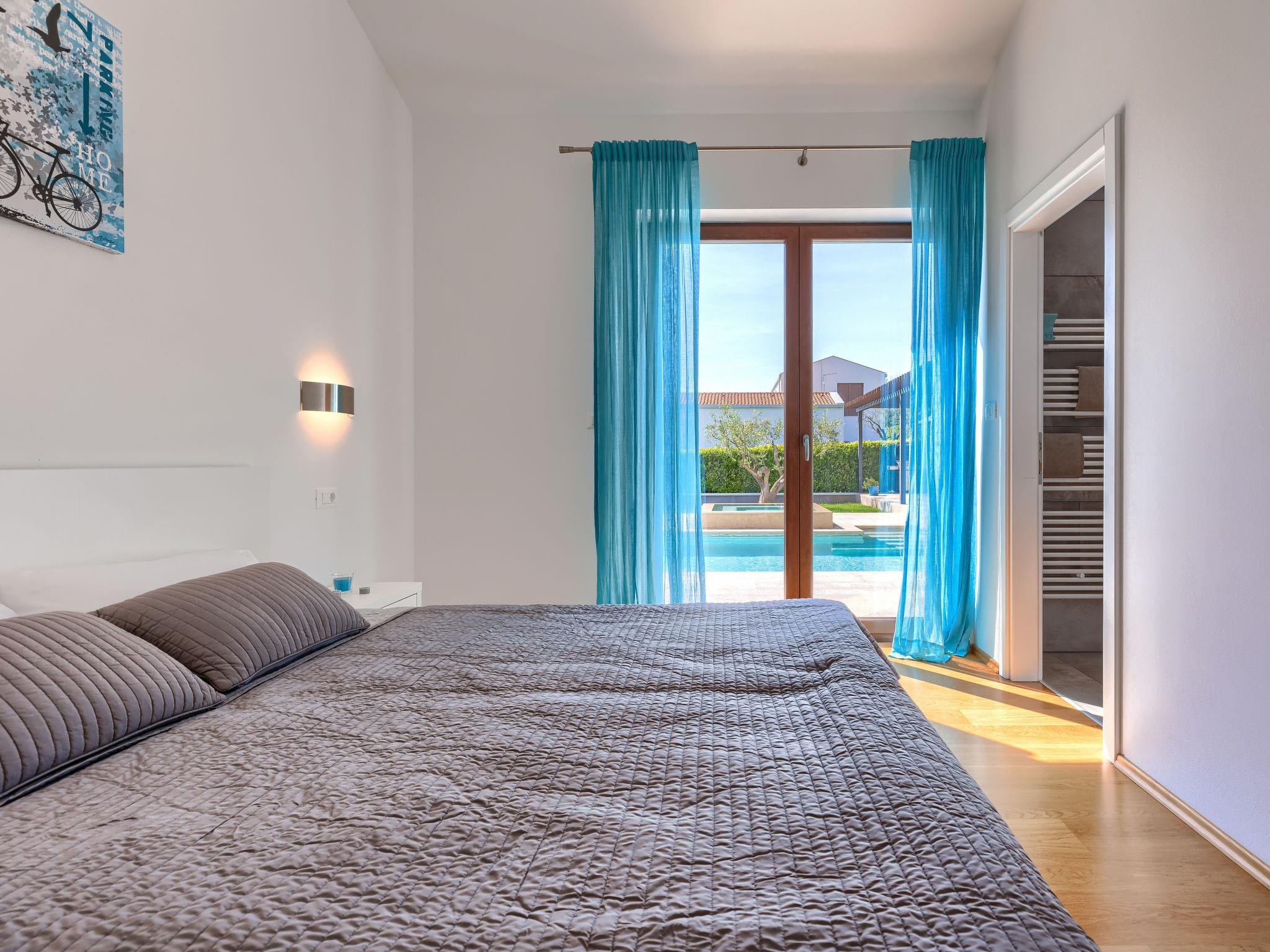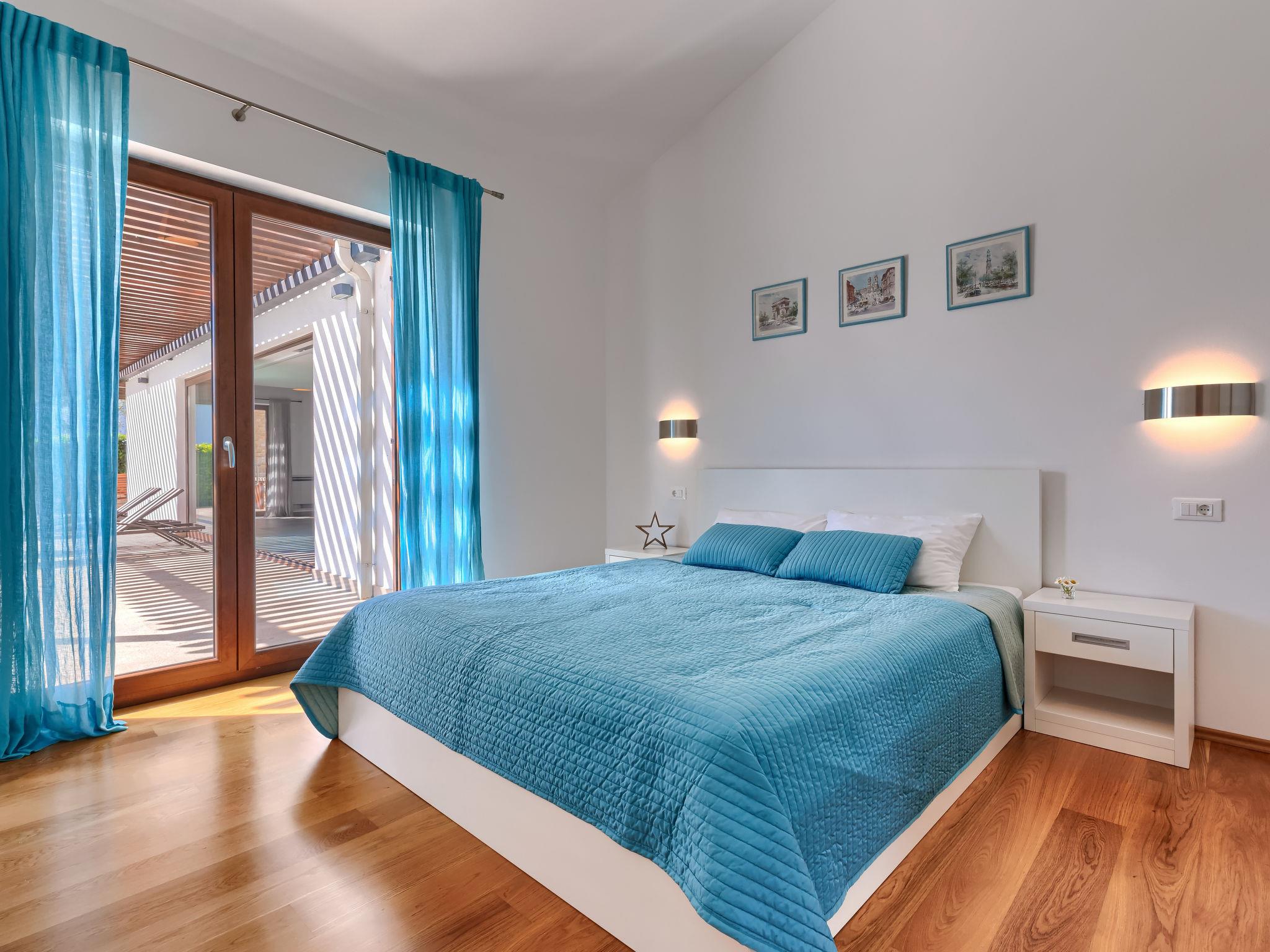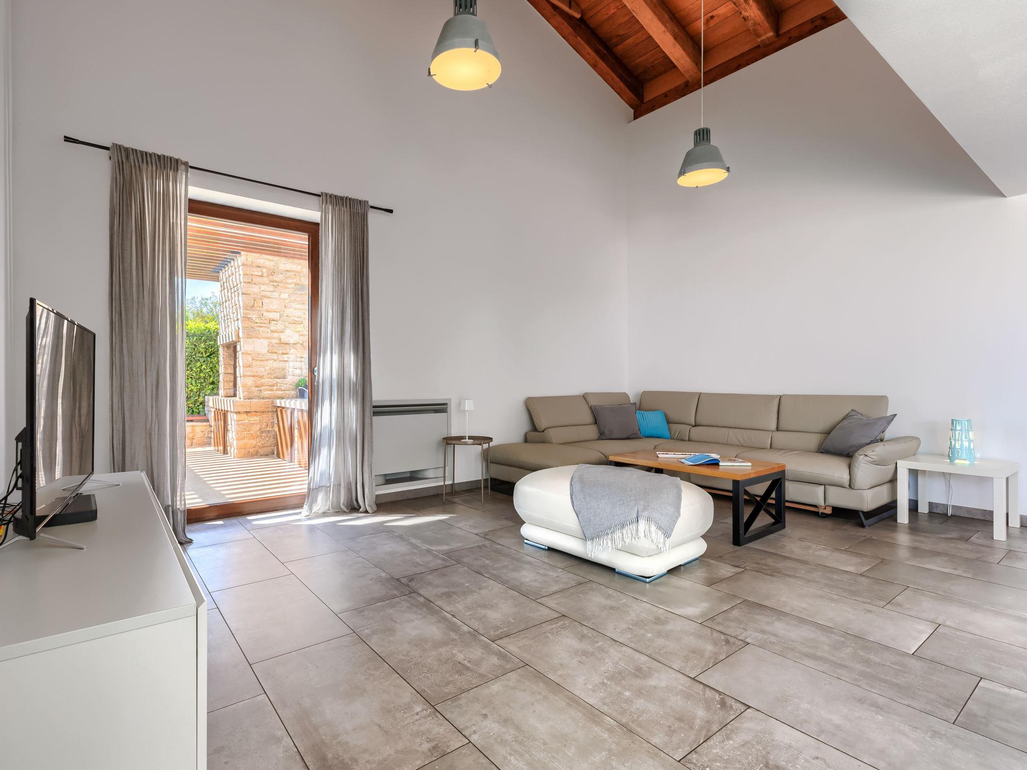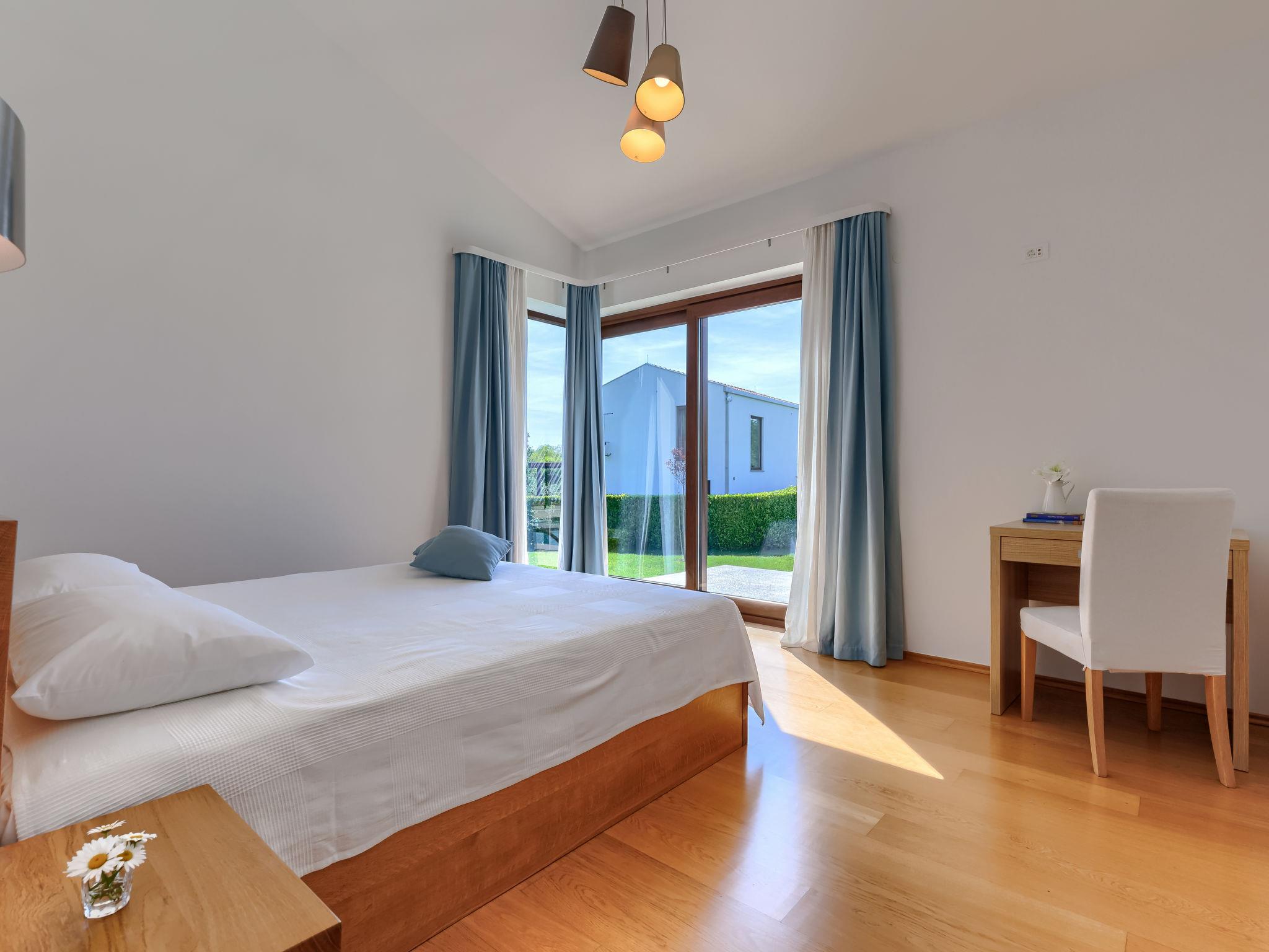 Modern villa "Luna Bianca", built in 2016. 6 km from the centre of Žminj, 13 km from the centre of Pazin, in a quiet, sunny position, 27 km from the sea. Private: property 900 m2, beautiful, well-kept garden with lawn, swimming pool angular (9 x 4 m, depth 140 cm, seasonal availability: 01.Jan. - 31.Dec.) with internal staircase. Outdoor shower, hot tub, terrace (18 m2), garden furniture, barbecue. In the house: internet access, washing machine, tumble dryer. Parking (for 2 cars) at the house on the premises. Shop 600 m, supermarket 6 km, restaurant 1 km, café 400 m, bus stop 6.7 km, railway station 500 m, pebble beach 27 km. Riding stable 7 km, walking paths from the house 1 km, cycle lane 1 km. Groups of teenagers on request only.