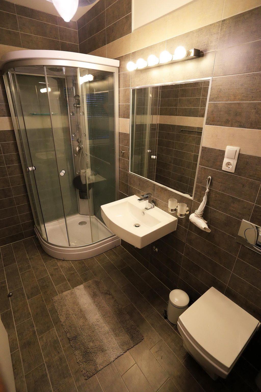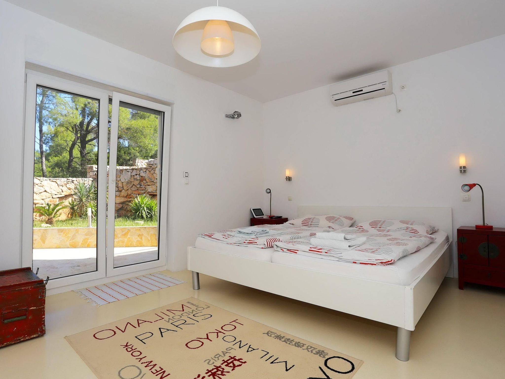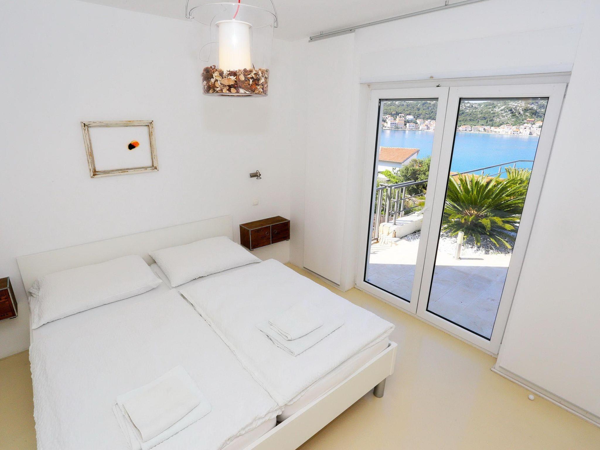 This spacious 140m² holiday apartment occupies the entire ground floor of the villa. It has a living and dining room flooded with daylight, with an integrated, open, built-in kitchen, as well as two bedrooms, two very modern bathrooms and a separate guest toilet. The living room has a comfortable white leather sofa and matching armchairs, an elegant solid wood coffee table, a wide flatscreen TV mounted to the wall with cable and satellite channels and a USB port, a radio and an open fireplace. Plenty of firewood is provided. From the living room you go through to the dining space with an elegant stainless steel dining table and four chairs, separated from the white and glossy kitchen by a stylish breakfast bar. The fully-equipped kitchen has only the latest appliances, including a ceramic hob with a tube-shaped, stainless steel extractor fan, an electric oven, fridge with freezer compartment, kettle and toaster. One of the two bedrooms has a double bed measuring 220 x 200cm, while the other has a double bed measuring 180 x 210cm. Both bedrooms have bedside tables with reading lamps and cupboards with ample storage space for your clothing and luggage. You can admire the extensive view over the bay and sea from the beds. The sofa in the living room can be converted into an additional single bed. Of the two bathrooms, one has a spacious shower cubicle and one has a bath with a shower attachment. Both also have a wide washbasin with a wall mirror, and a toilet. A washing machine is available. A supplementary bed can be provided on request and the reliable wireless Internet connection in the apartment can be used free of charge.