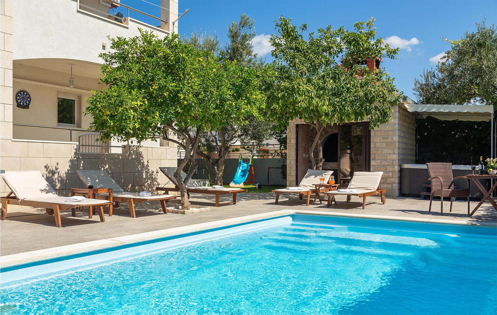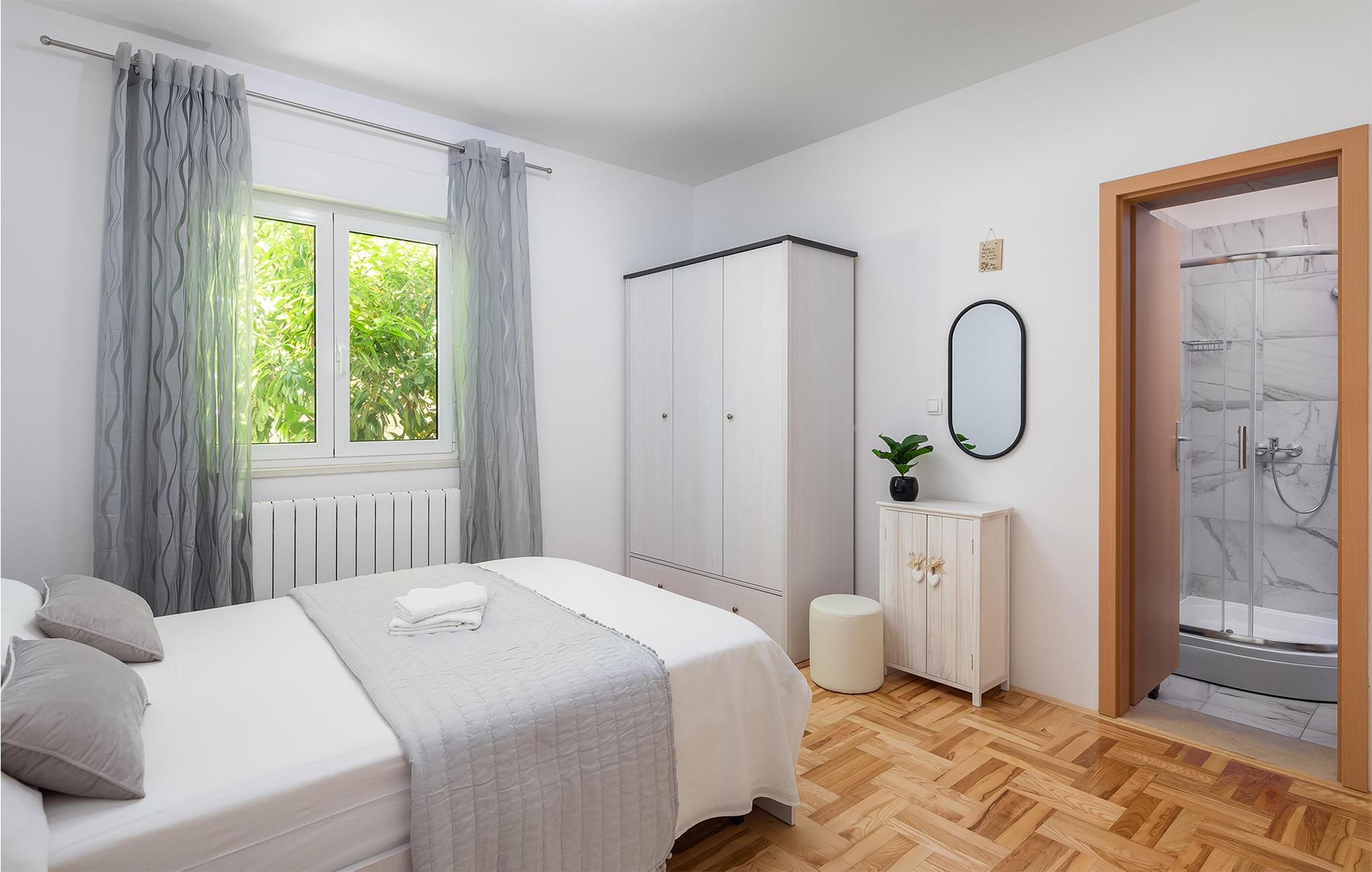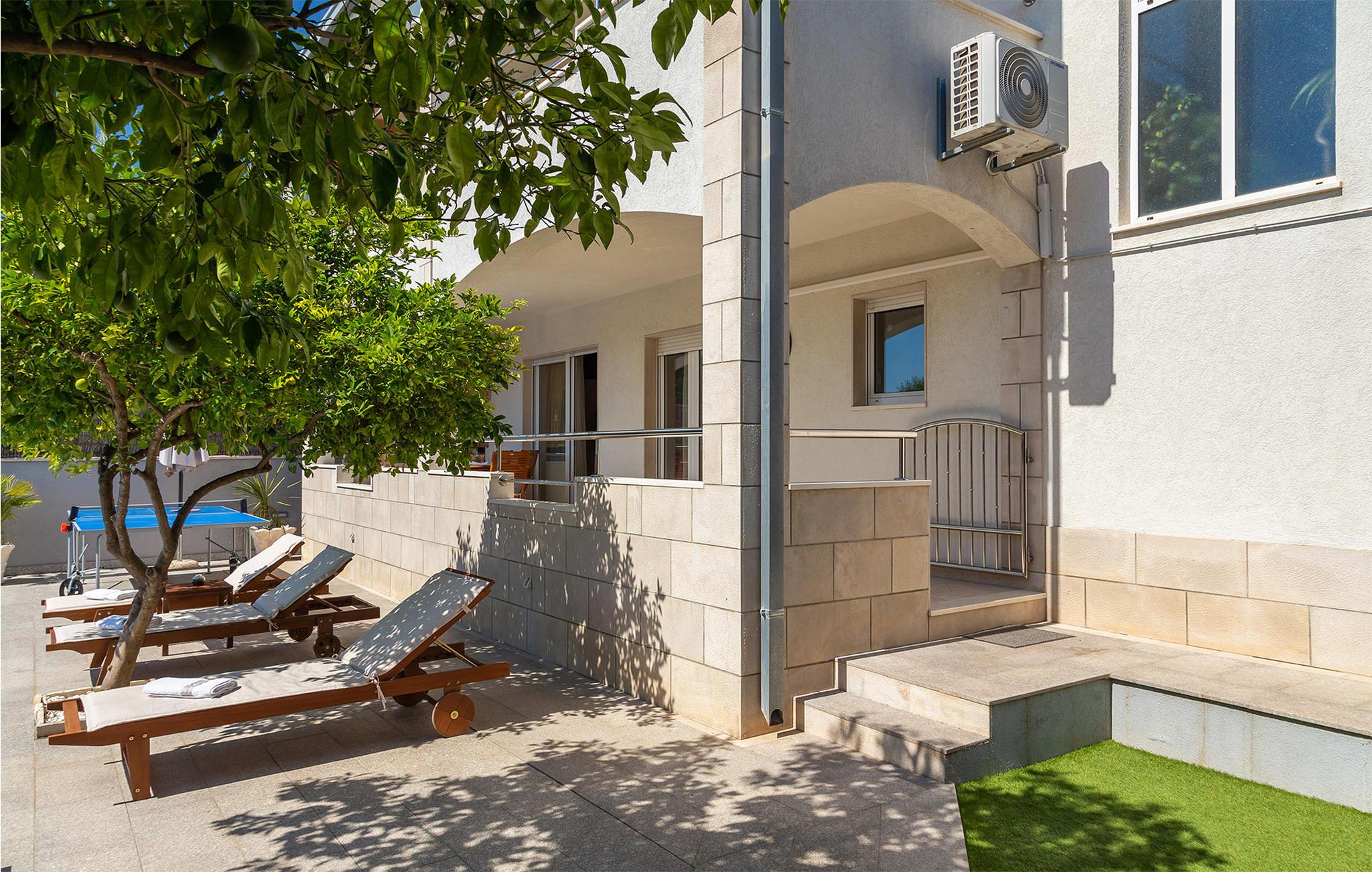 Nicht weit entfernt finden Sie den nächstgelegenen Kiesstrand, der ideal für einen erholsamen Tag am Meer ist. Erkunden Sie die historische Umgebung von Kastel Novi und bestaunen Sie die Architektur des nahe gelegenen Kastel Stari. Besuchen Sie auch die UNESCO-geschützte Altstadt von Trogir, die nur eine kurze Fahrt entfernt liegt. Schlendern Sie durch die engen Gassen, genießen Sie lokale Spezialitäten in einem der charmanten Restaurants und erleben Sie die mediterrane Lebensfreude.