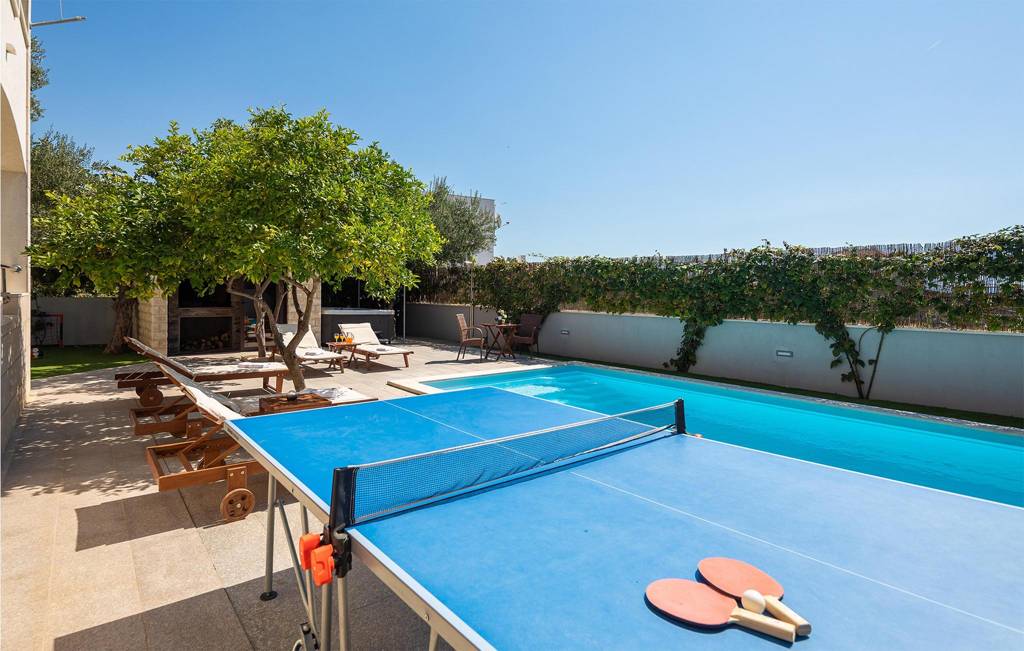 Erfrischen Sie sich im einladenden Pool im Garten, entspannen Sie im luxuriösen Whirlpool oder nutzen Sie die zahlreichen Unterhaltungsmöglichkeiten: Billard, Tischfußball und Outdoor-Tischtennis. Die Kleinsten können sich in der liebevoll gestalteten Spielecke im Außenbereich austoben. Auf der überdachten Terrasse mit Blick auf den Pool können Sie köstliche Mahlzeiten genießen, die Sie am Grill zubereitet haben.