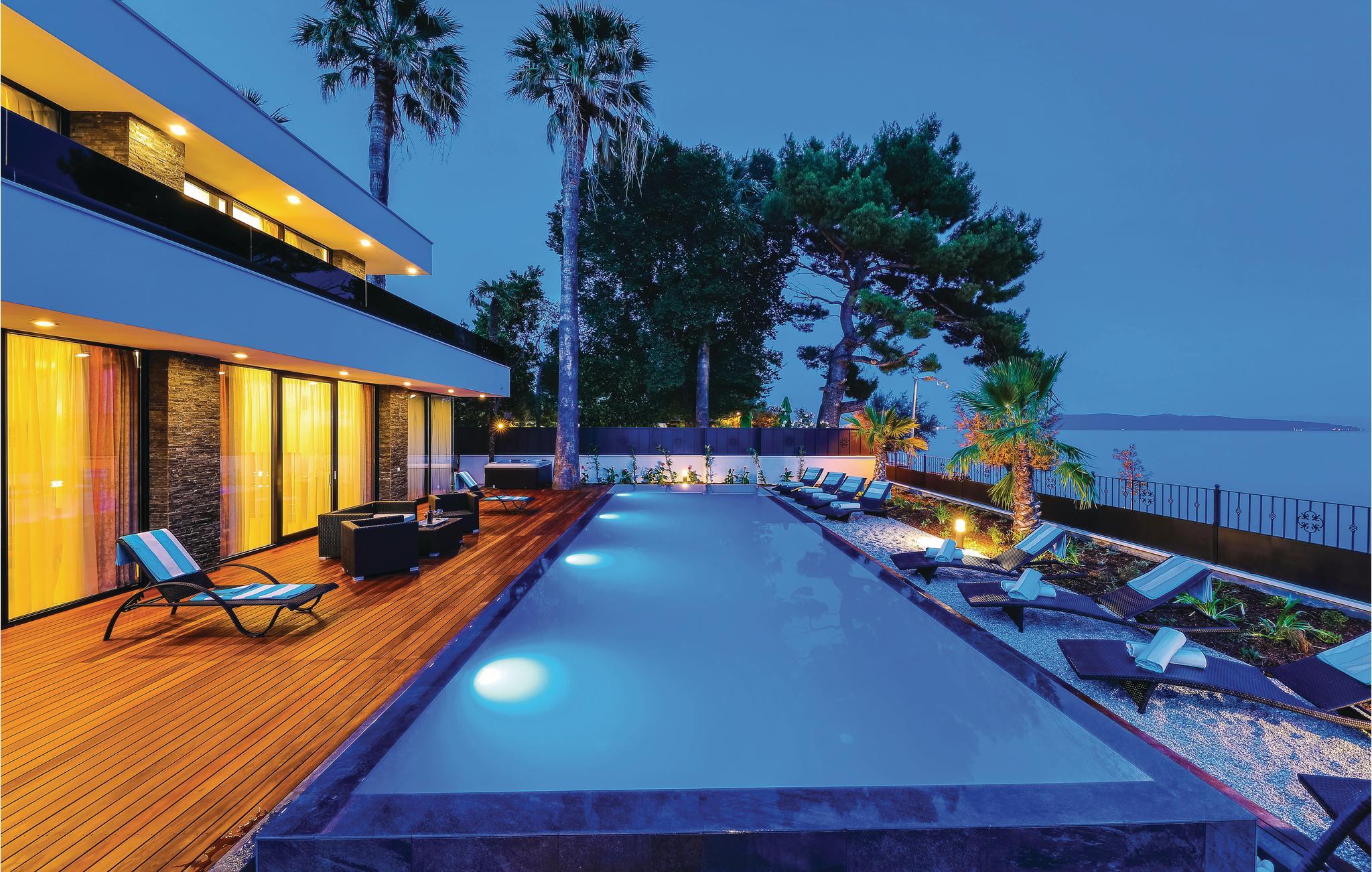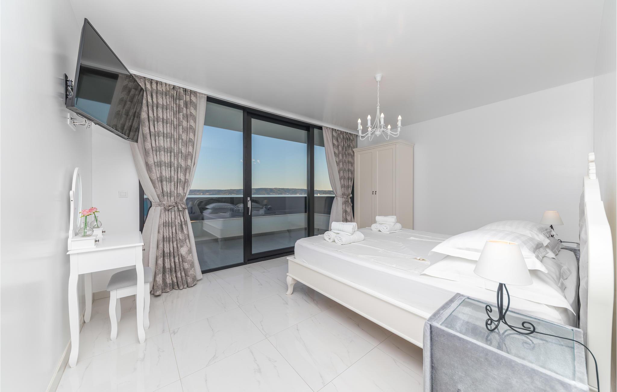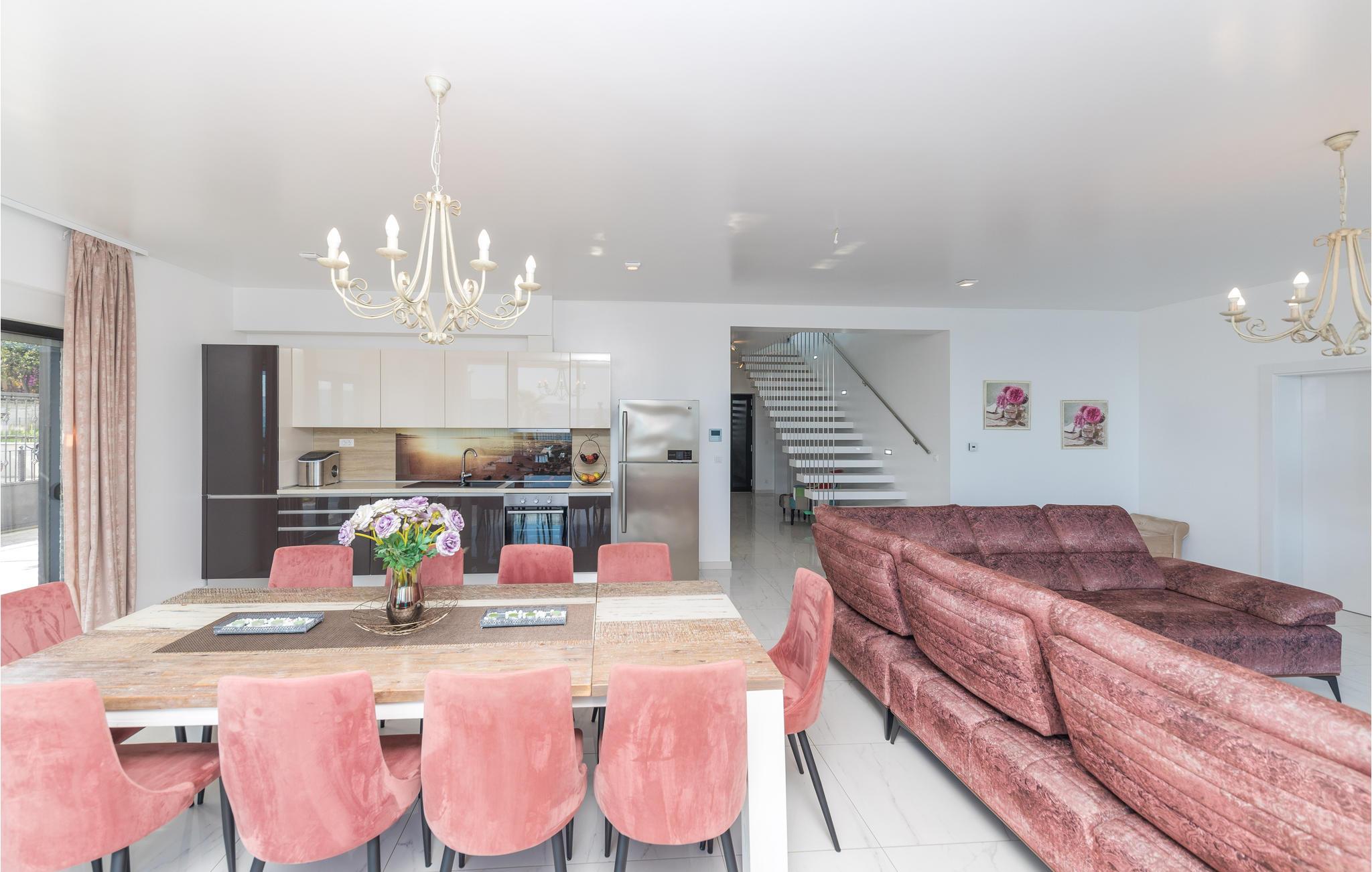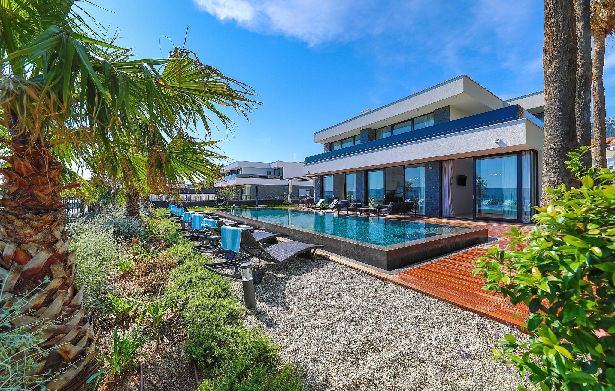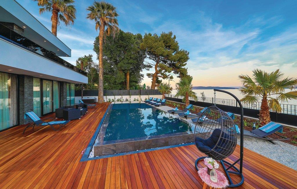 Im Ort Kastel Stari, nahe der Stadt Trogir, steht dieses modern eingerichtete Ferienhaus direkt am Meer. Dieses Feriendomizil bietet alles, was für einen erholsamen Urlaub notwendig ist. Große Fensterscheiben bringen viel Licht ins Innere und ermöglichen einen wunderschönen Meerblick. Im Gartenbereich steht Ihnen ein Außenpool zur Verfügung, der den Aufenthalt ebenfalls bereichert. Alle Aktivurlauber werden besonders am Fitnessraum Freude finden. Zur Erholung steht Ihnen nach einem Training dann der Whirlpool und lädt Sie ein, zu entspannen. Besuchen Sie die Stadt Trogir und erkunden Sie das schöne Kulturerbe. Das reiche Gastronomieangebot dieser Stadt wartet auf Sie und bietet traditionelle Köstlichkeiten, die Sie sich auf keinen Fall entgehen lassen sollten.