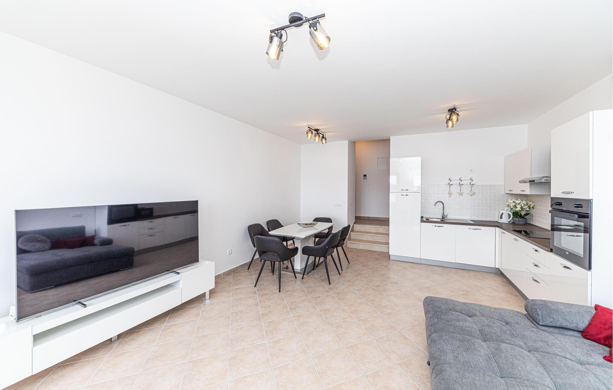 Erleben Sie ein unvergessliches Urlaubsgefühl in dieser modernen und stilvollen Ferienwohnung, die sowohl für einen aktiven Urlaub als auch für entspannte Urlaubsstunden bestens geeignet ist. Setzen Sie sich mit Ihrer morgendlichen Tasse Kaffee auf Ihren Balkon und genießen Sie die Aussicht auf das tiefblaue Meer und den Blick auf die umliegenden weichen Hügel. Das Herzstück der Wohnung ist der geräumige Wohnbereich mit einem gemütlichen Sofa und dem praktischen Esstisch. Kommen Sie mit der Familie zusammen und spielen Sie Karten, lösen Sie ein Puzzle oder lesen Sie Ihren Kindern ein Buch vor. Abends können Sie hier nach einem ereignisreichen Tag bei einem guten Film zur Ruhe kommen.