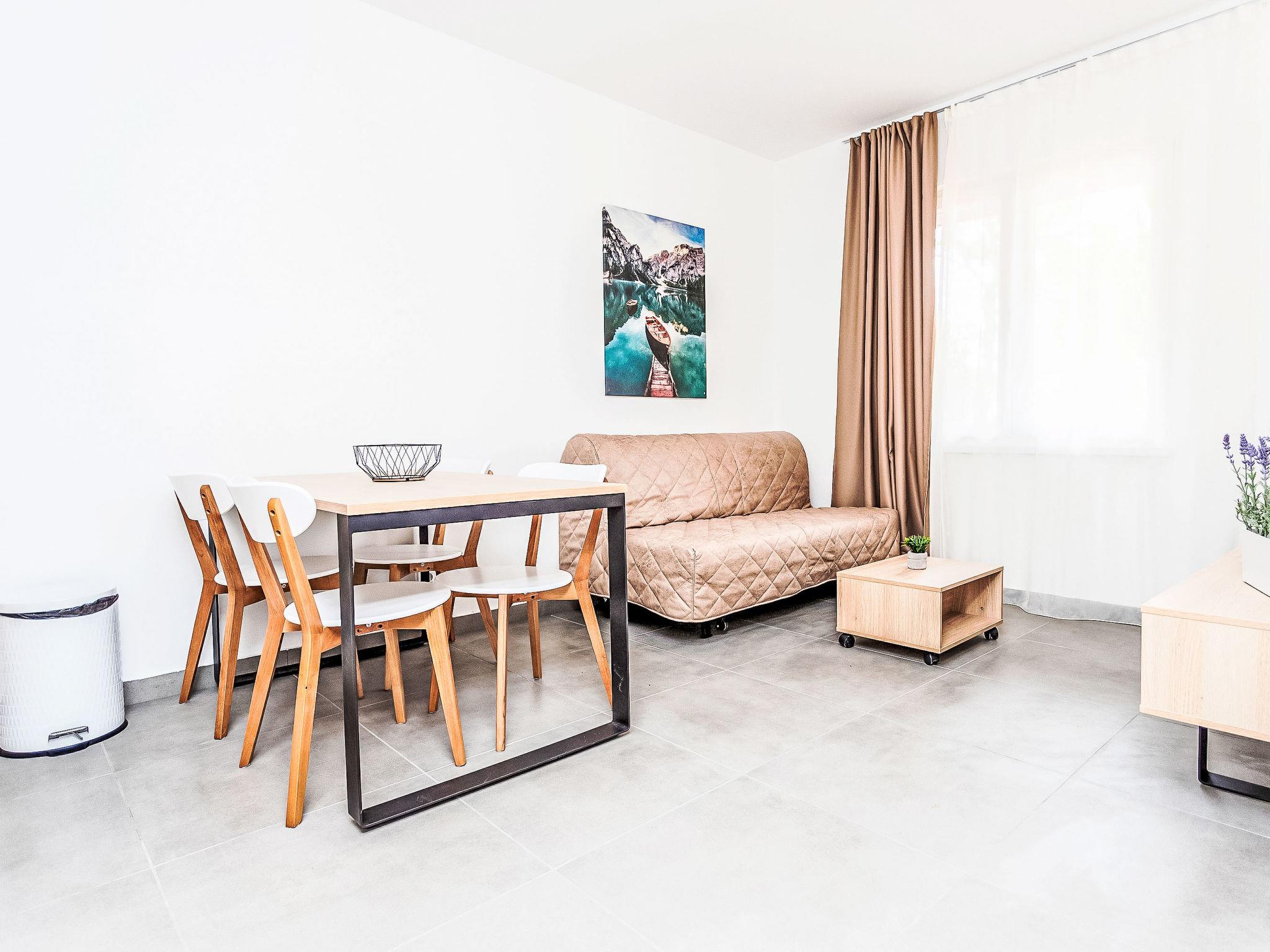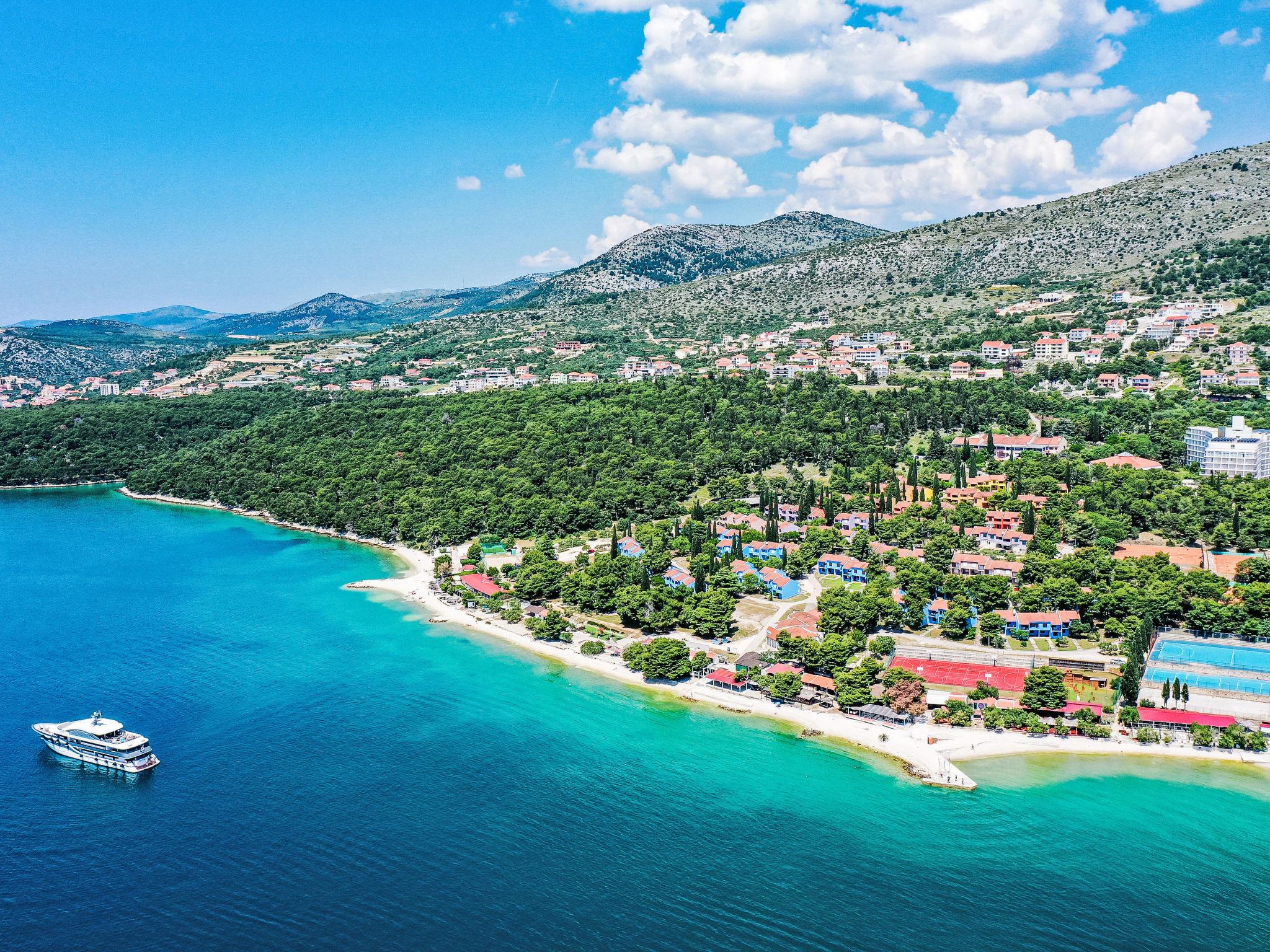 Resort "Medena". In the district of Seget Donji 3 km from the centre of Trogir, 30 km from the centre of Split, at the seaside. For shared use: property with plants and trees, 3 swimming pools (31 m2, depth 140 cm, seasonal availability: 01.Apr. - 01.Nov.) with internal staircase. Children's pool, outdoor shower, tennis (extra), basketball (extra), children's playground. In the complex: reception, restaurant, internet access, laundry. Available: bicycles (extra). Breakfast full board half board possible on request (extra). Airport transfer (extra). Parking (extra) on the premises. Bus stop 650 m. Object suitable for 2 adults + 2 children. Please note: airfield 8 km from the property. The photograph shows a typical example. 1 double sofabed in living/dining area is only for 2 children up to 12 years old. For shared use mini golf and cageball court (on request, extra).