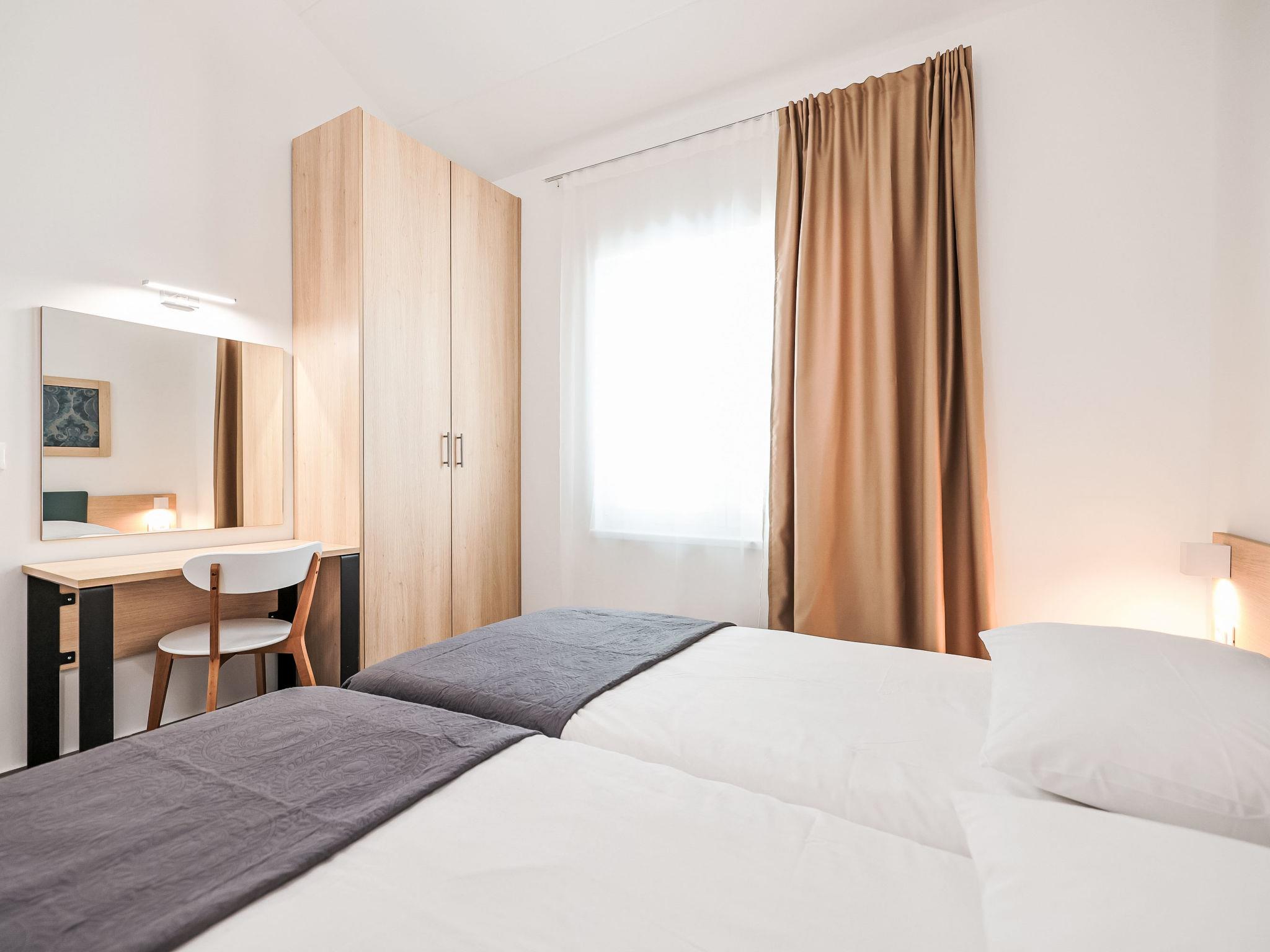 3-room apartment 46 m2 on 1st floor, south facing position. Living/dining room with 1 sofabed (80 cm, length 180 cm), satellite TV (flat screen), air conditioning. Exit to the terrace. 2 rooms, each room with 2 beds (90 cm, length 200 cm). Open kitchen (2 ceramic glass hob hotplates, microwave, electric coffee machine). Shower/WC, sep. WC. No heating option. Terrace 13 m2, roofed. Terrace furniture. Facilities: baby cot (extra). Internet (WiFi, free). Maximum 1 small pet/ dog allowed. The houses are situated 160-250 m from the sea and the beach.