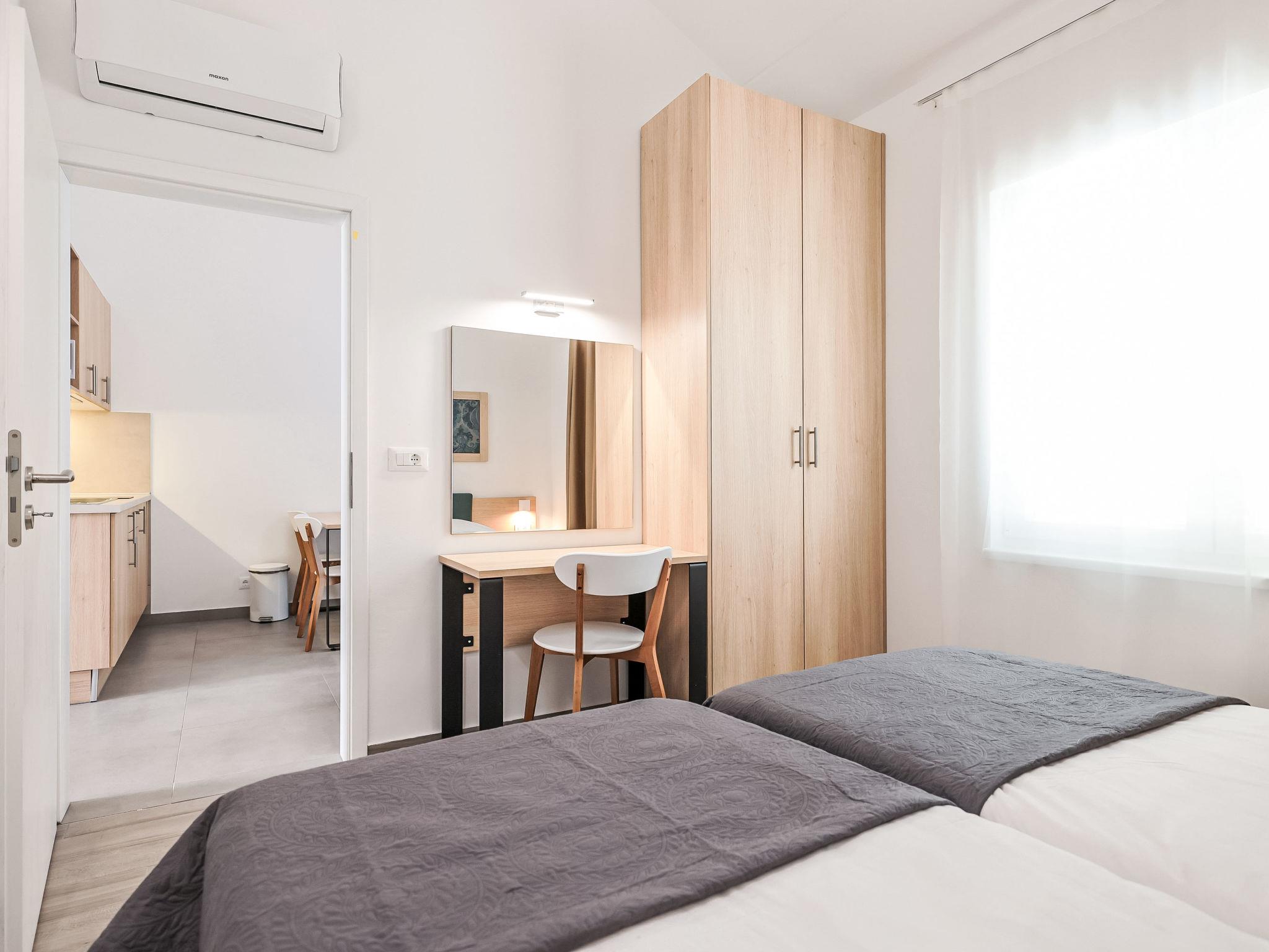 3-room apartment 46 m2 on 1st floor, south facing position. Living/dining room with 1 sofabed (80 cm, length 180 cm), satellite TV (flat screen), air conditioning. Exit to the terrace. 2 rooms, each room with 2 beds (90 cm, length 200 cm). Open kitchen (2 ceramic glass hob hotplates, microwave, electric coffee machine). Shower/WC, sep. WC. No heating option. Terrace 13 m2, roofed. Terrace furniture. Facilities: baby cot (extra). Internet (WiFi, free). Maximum 1 small pet/ dog allowed. The houses are situated 160-250 m from the sea and the beach.
