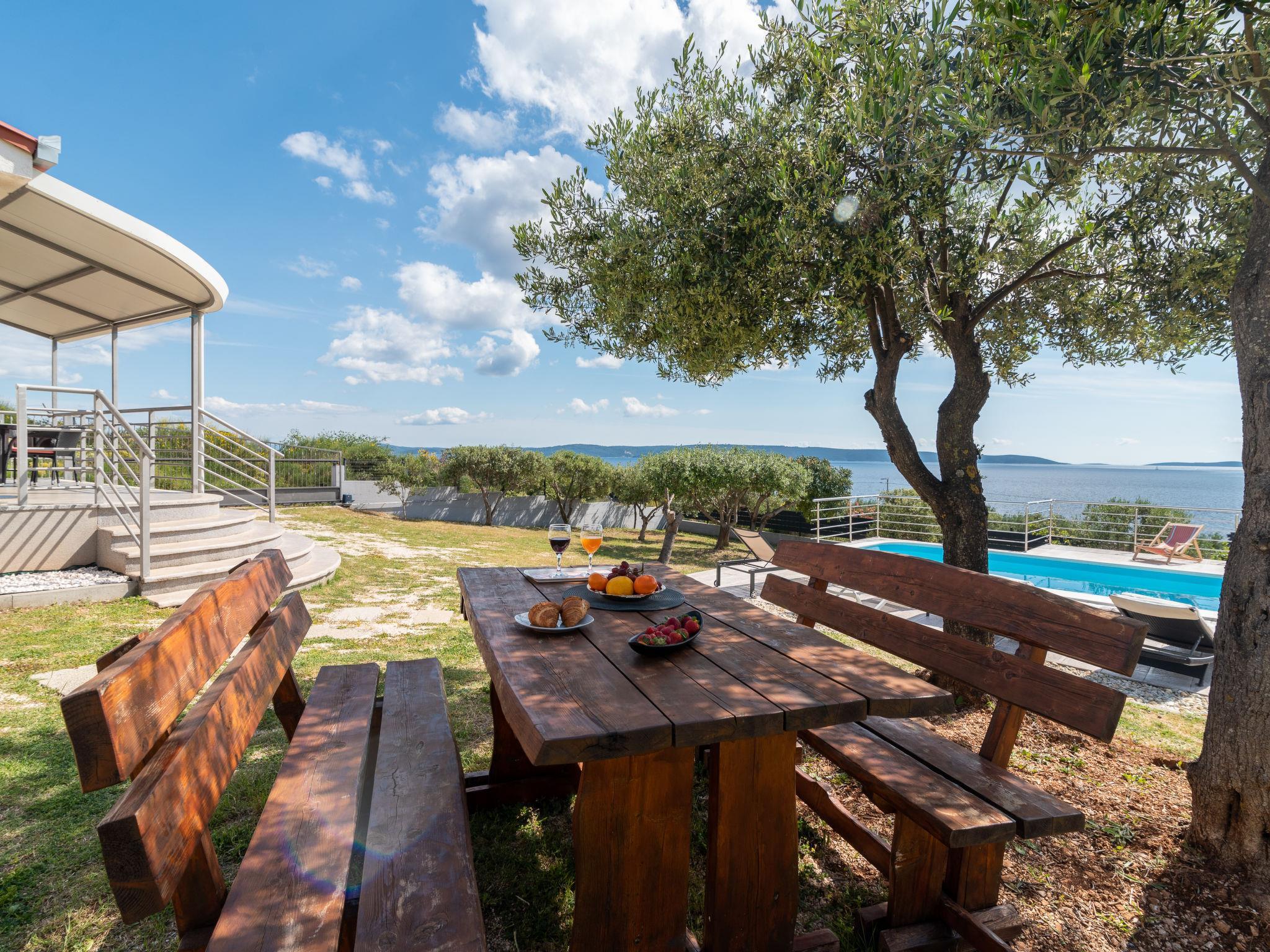 Okrug Gornji (Ciovo): House "Ria with heated pool". 1.5 km from the centre of Okrug Gornji, 5 km from the centre of Trogir, in a quiet, sunny position, 180 m from the sea, 180 m from the beach. Private: property 1'200 m2 (fenced), trees, swimming pool heated (26 m2, depth 150 cm, seasonal availability: 04.Apr. - 06.Nov.). Outdoor shower, garden furniture, barbecue. In the house: internet access, roof terrace, washing machine. Motor access to the house (50 m via unmade road). Parking (for 3 cars) at the house on the premises. Shop 500 m, supermarket 1.5 km, restaurant 1.5 km, bus stop 500 m, pebble beach 180 m. Please note: airfield 10 km from the property. The unit consists of a big house (100 m2) and a smaller house (46 m2), rented as one unit.
