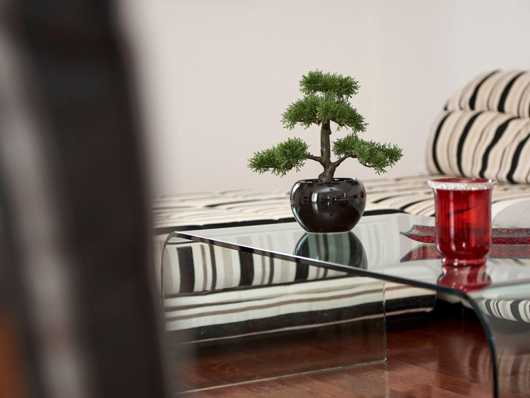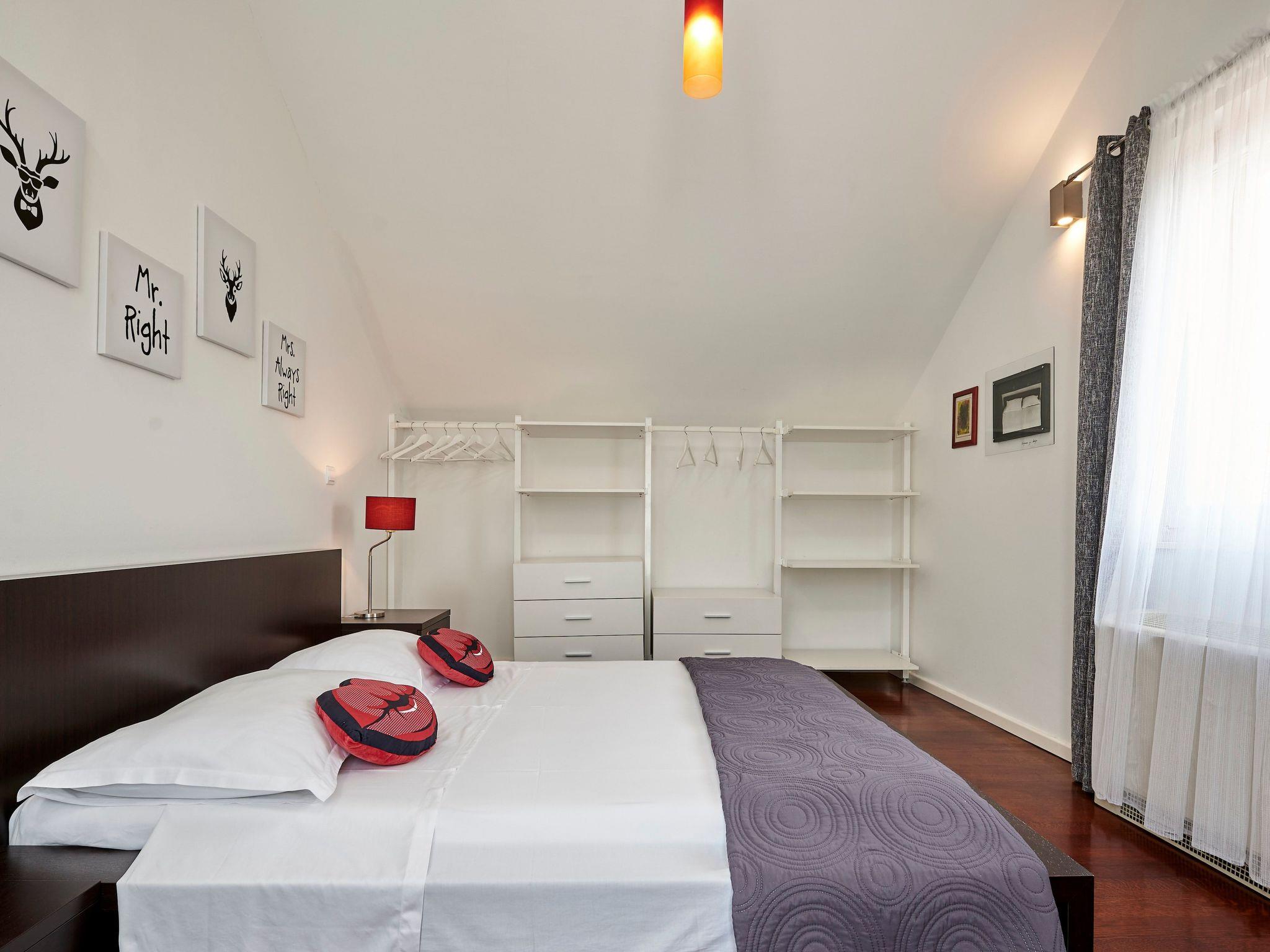 The penthouse consists of three double bedrooms with one bathroom. This sleeping area is connected by a private hall with a sitting area, to a spacious living room with a vaulted ceiling. In addition to a well-equipped kitchen there is a second luxurious bathroom, and balcony that has a peek-a-boo view of Trogir harbor and ancient church steeples and rooftops.