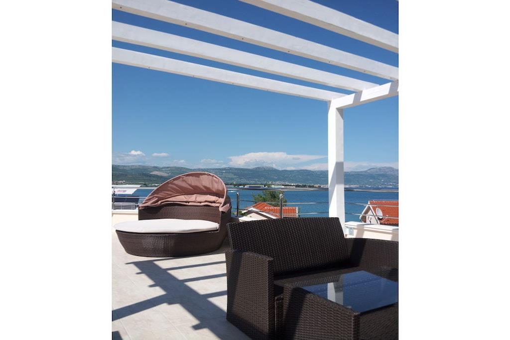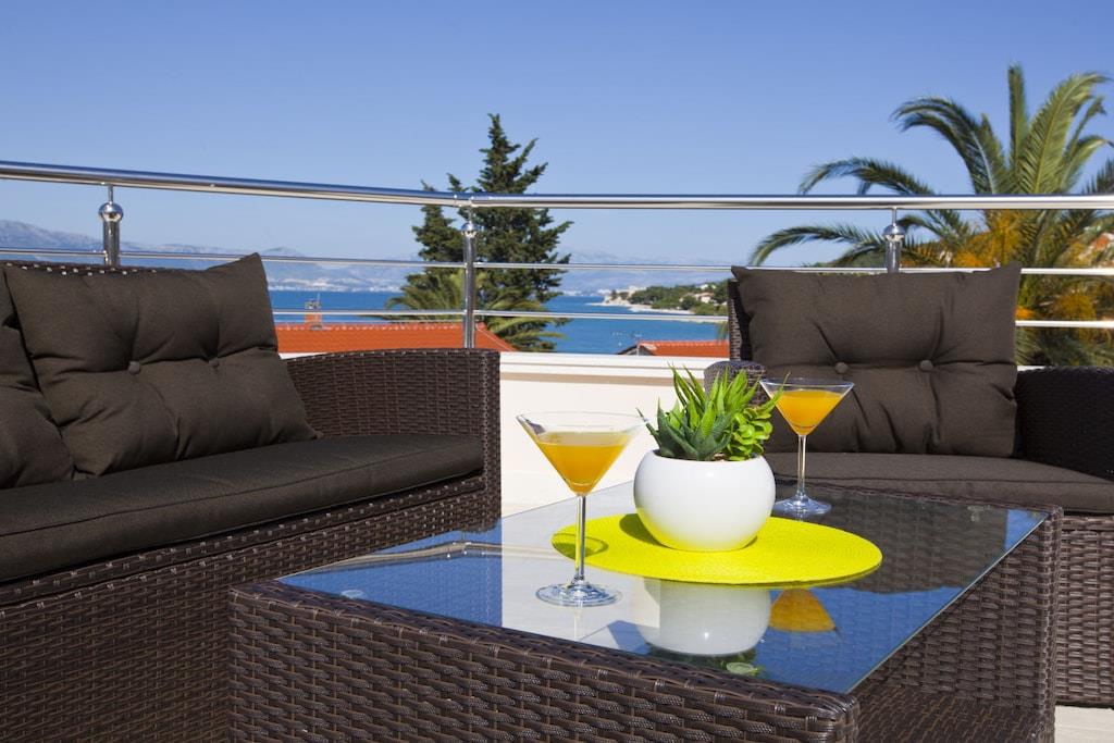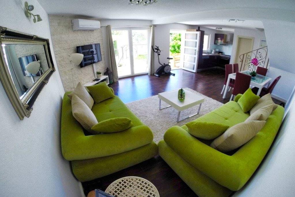 You're renting a modern villa with everything you need, right by the sea and offering plenty of opportunities. The villa has three bedrooms: two with double beds and one with twin beds, designed to accommodate 6-8 people. There's a terrace on the top floor where you can enjoy beautiful sea views. In the garden, you can enjoy the greenery, various fruit trees, and a barbecue. The kitchen is open-plan and somewhat separate from the living and dining room. The bedrooms, bathroom, and toilet are located on the upper floor.
