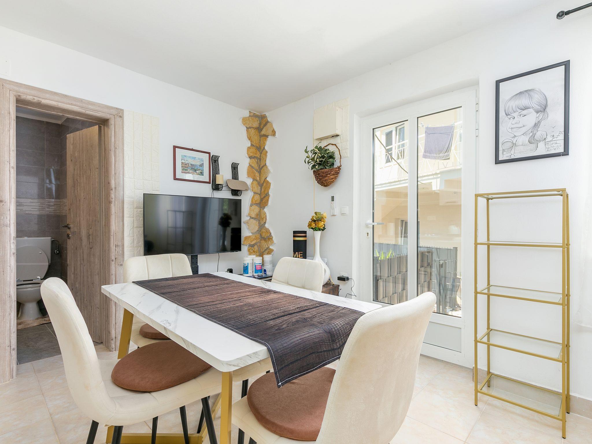 Haus bietet Platz für 5 Gäste. Die Betten sind in Schlafzimmern, die es 2 gibt, und in Wohnzimmer, innerhalb einer Gesamtfläche von 47m2, angeordnet. Die Gäste haben eine eigene Terrasse zur Verfügung, auf der sie in warmen Sommernächten genießen können. Es ist erlaubt, Speisen auf dem Gemeinschafts-Grill vorzubereiten. Während ihres Aufenthalts können sich Gäste im privaten Schwimmbad entspannen. IM PREIS INBEGRIFFEN: Kurtaxe, Endreinigung, Klimatisierung, Pool, Parkplatz, Internet, Bügeleisen, Bügelbrett, Föhn, tragbarer Grill. VERBINDLICHE ZUSÄTZLICHE KOSTEN: Aufzahlung für Kurzaufenthalte (prozentualer Zuschlag pro Nächtigungsanzahl: 30% - 1, 20% - 2, 10% - 3). UNVERBINDLICHE ZUSÄTZLICHE KOSTEN: Fahrrad (10,00 € täglich (pro Stück)). Die Verfügbarkeit zusätzlicher Dienstleistungen in Ihrem reservierten Termin und die Preise derselben (falls nicht aufgeführt) müssen im Voraus überprüft werden. Zusätzliche Dienstleistungen die in der Zahlungsaufforderung nicht aufgeführt sind werden direkt beim Vermieter bezahlt, angenommen der Gast nutzt auch diese.