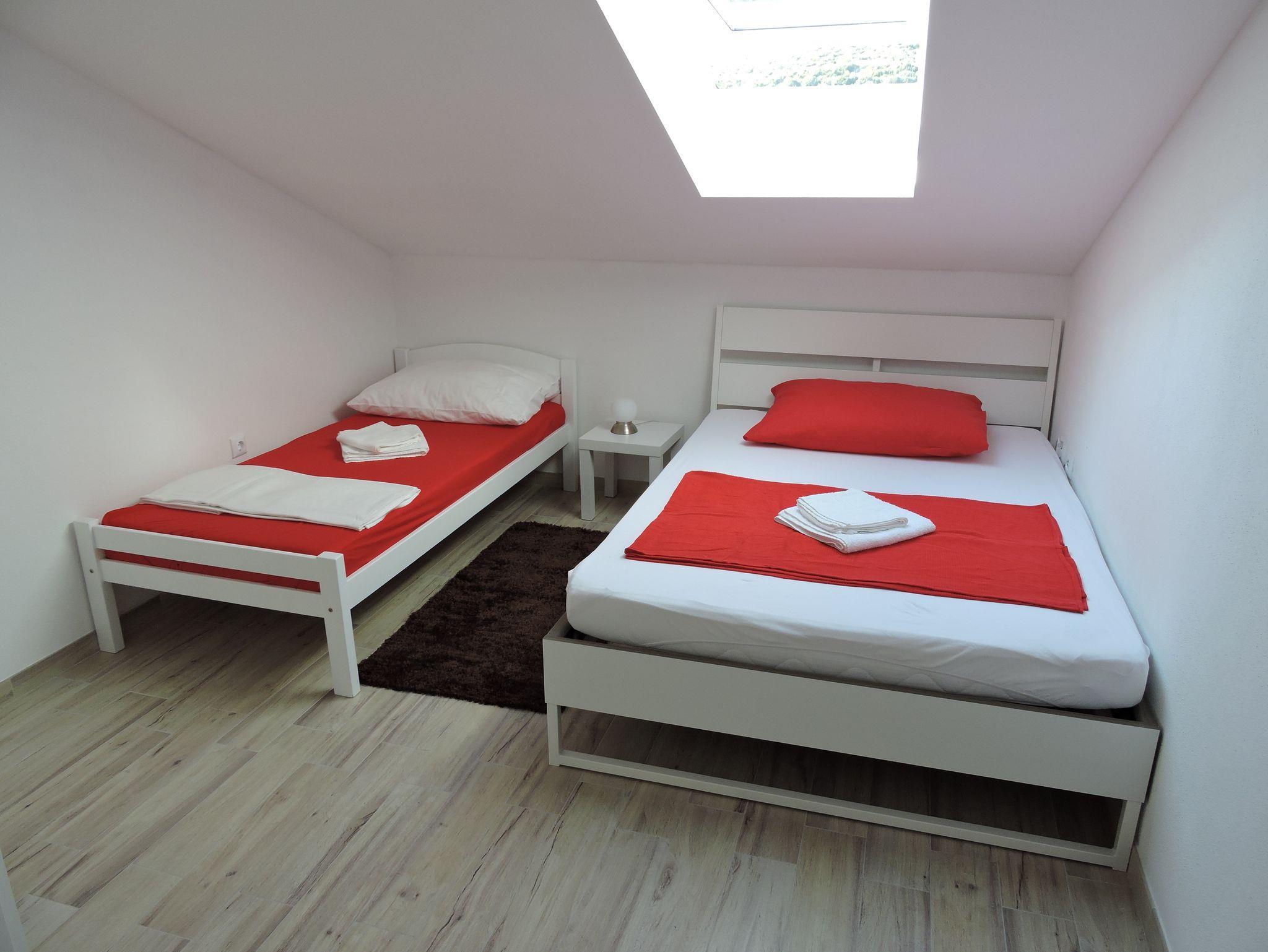 Ferienwohnung bietet Platz für 5 Gäste. Die Betten sind in Schlafzimmern, die es 2 gibt, und in Wohnzimmer, innerhalb einer Gesamtfläche von 54m2, angeordnet. Die Gäste haben einen eigenen Balkon zur Verfügung, auf der sie in warmen Sommernächten genießen können. Das Apartment bietet Meerblick. Es ist erlaubt, Speisen auf dem Gemeinschafts-Grill vorzubereiten. IM PREIS INBEGRIFFEN: Kurtaxe, Endreinigung, Klimatisierung, Parkplatz, Internet, Bügeleisen, Bügelbrett, Föhn. VERBINDLICHE ZUSÄTZLICHE KOSTEN: Aufzahlung für Kurzaufenthalte (prozentualer Zuschlag pro Nächtigungsanzahl: 30% - 1, 20% - 2, 10% - 3). UNVERBINDLICHE ZUSÄTZLICHE KOSTEN: Wäschewaschen (5,00 € Waschen). Die Verfügbarkeit zusätzlicher Dienstleistungen in Ihrem reservierten Termin und die Preise derselben (falls nicht aufgeführt) müssen im Voraus überprüft werden. Zusätzliche Dienstleistungen die in der Zahlungsaufforderung nicht aufgeführt sind werden direkt beim Vermieter bezahlt, angenommen der Gast nutzt auch diese. Ermäßigung auf den Grundpreis: Gratistag 21=19 (bei einem Aufenthalt von 21 Tagen oder mehr erhalten Sie 2 Gratistage für den Aufenthalt bis 31.12.26).