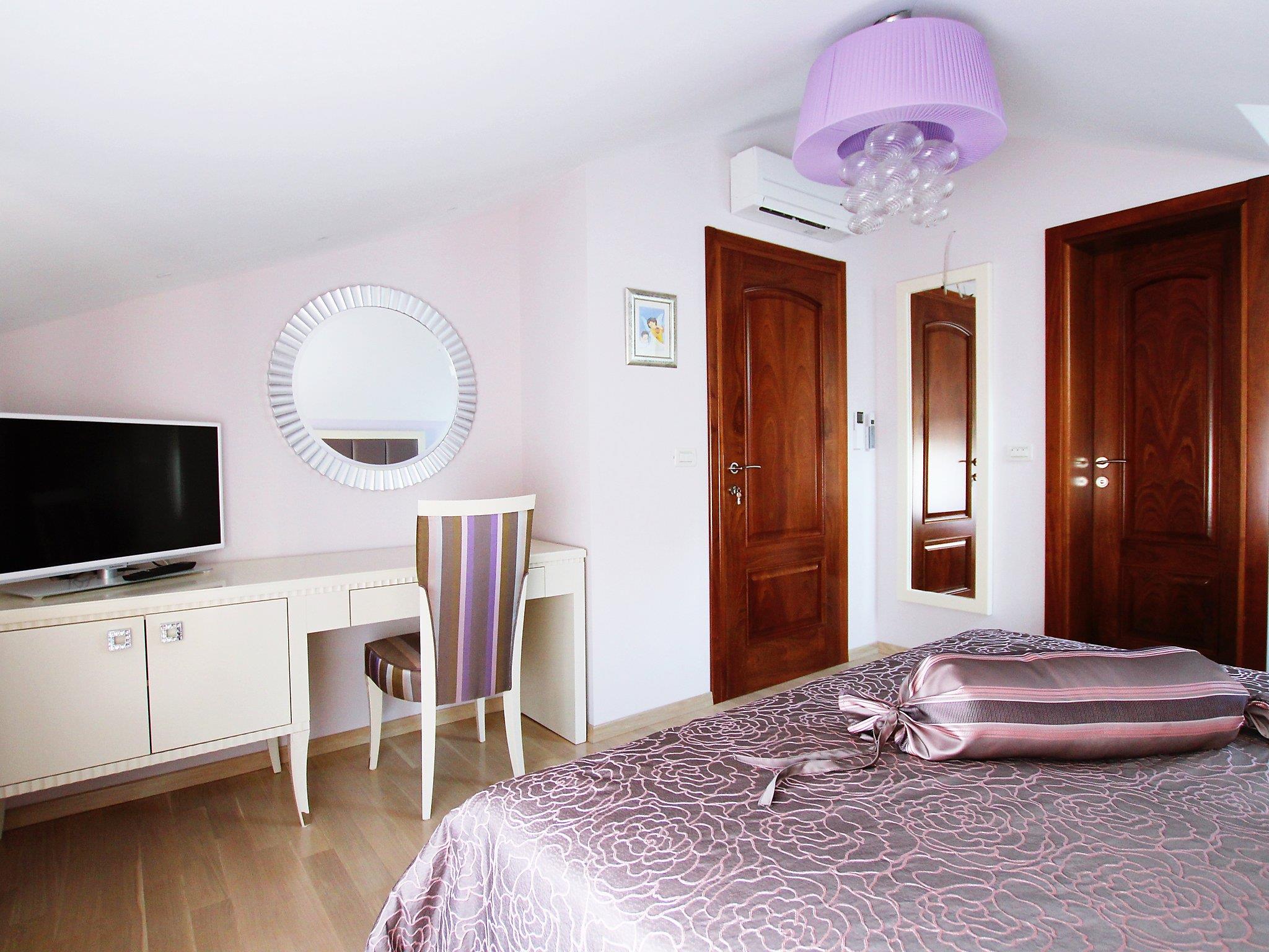 7-room house 400 m2 on 4 levels, south-west facing position. Living/dining room 50 m2 with satellite TV (flat screen), air conditioning. Exit to the balcony. 1 room with 1 french bed (160 cm, length 200 cm), shower/WC and satellite TV (flat screen), air conditioning. 1 room with 1 double bed (2 x 90 cm, length 200 cm), bath/bidet/WC and satellite TV (flat screen), air conditioning. Open kitchen (oven, dishwasher, 4 ceramic glass hob hotplates, microwave, freezer, electric coffee machine). 2nd upper floor: living/dining room 50 m2 with open-hearth fireplace and satellite TV (flat screen), air conditioning. Exit to the balcony, to the terrace. Kitchen (oven, dishwasher, 4 ceramic glass hob hotplates, microwave, freezer, electric coffee machine). Shower/WC. Top floor: 1 room with sloping ceilings, ceiling height 145 - 290 cm with rooflight with 1 double bed (2 x 90 cm, length 200 cm), shower/WC and TV (flat screen), air conditioning. 1 room with sloping ceilings, ceiling height 145 - 290 cm with rooflight with 1 double bed (2 x 90 cm, length 210 cm), bath/bidet/WC and air conditioning. Exit to the terrace. 1 room 20 m2, with sloping ceilings, ceiling height 145 - 290 cm with rooflight with 1 double bed (2 x 90 cm, length 200 cm), bath/bidet/WC, with corner bath and air conditioning. Exit to the terrace. 2 balconies 7 m2, 2 balconies 3 m2, terrace 20 m2 partly roofed, terrace 15 m2 partly roofed. Terrace furniture, deck chairs. Marvellous view of the sea. Facilities: safe, baby cot. Internet (WiFi, free). On the ground floor:billiard room, TV (flat screen), sep. WC. 1 apartment on the 1 st floor with living/dining area, open kitchen and 2 bedrooms. 1 apartment on 2 levels with separate entrance, living/dining area and kitchen on the second floor and 3 bedrooms on the top floor.