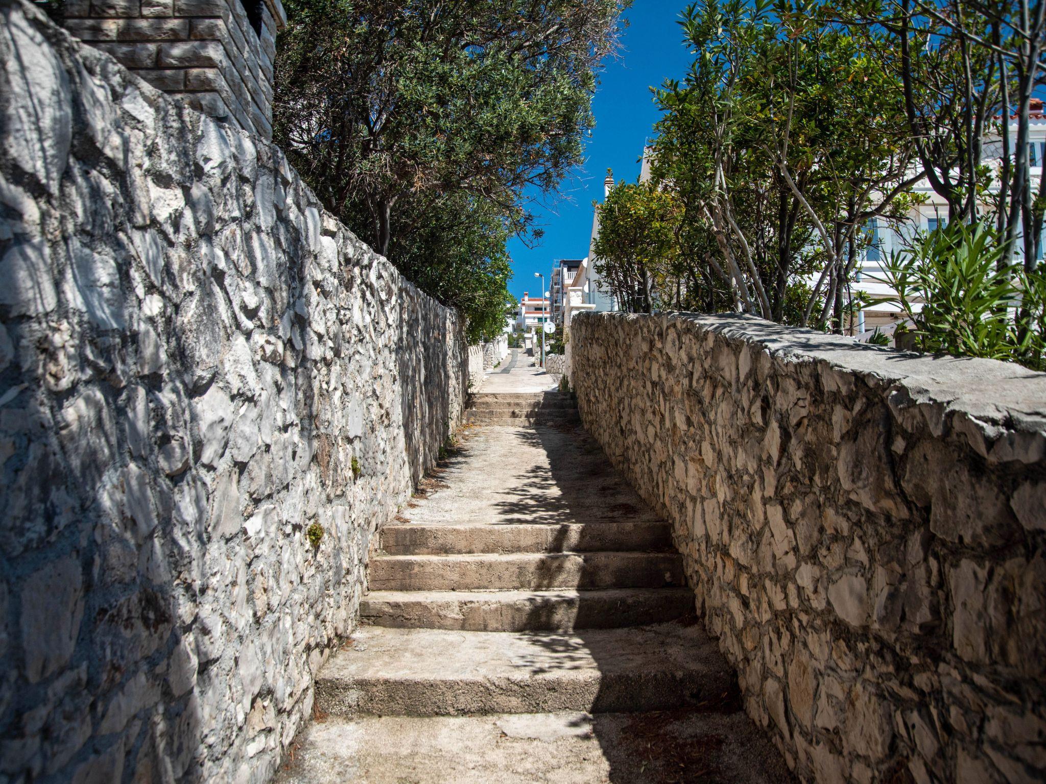 Your holiday apartment is only about 100 metres from the sea with crystal clear water. A narrow path leads right past the apartment, leading to a little boat jetty just a few minutes away. The nearest café is just 50 metres away. There is a sandy beach about 1km away. It is about 3km to the village centre of Okrug Gornji with a good selection of shops, colourful markets, cafés and restaurants.