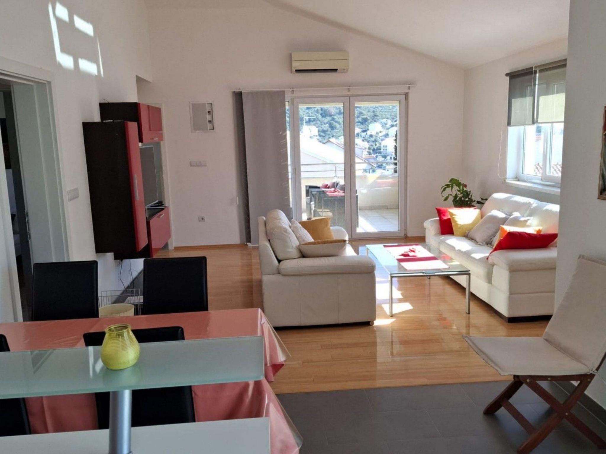 Spanning 90 m², Apartment More comfortably accommodates up to 4 guests. It features two bedrooms, a bathroom with a shower, and a spacious, open-concept living area that combines the kitchen and dining space. One bedroom is furnished with a queen-size double bed, while the second bedroom offers two single beds that can be joined or separated to suit guests preferences. To ensure maximum comfort during the warm summer days, all bedrooms and the living room are air-conditioned.