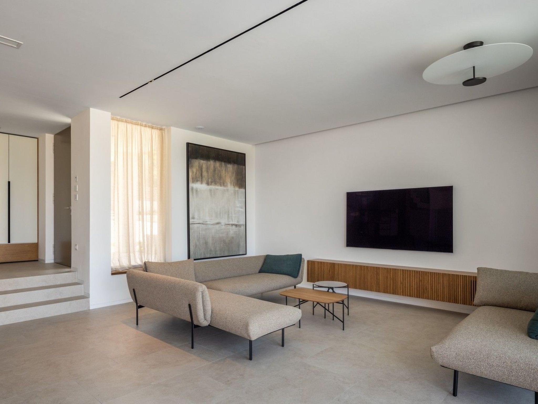 In the basement, you can find a laundry room, a small gym, a Turkish sauna, and half bath. On the ground floor, you’ll find a spacious living room adorned with high-quality furniture, a dining area boasting a large table and chairs for 8 persons, complemented by a well-equipped, luxurious open-concept kitchen. Large sliding glass doors lead from the living room and kitchen to the terrace. This inviting space is furnished with outdoor furniture providing views of the sea and the garden.