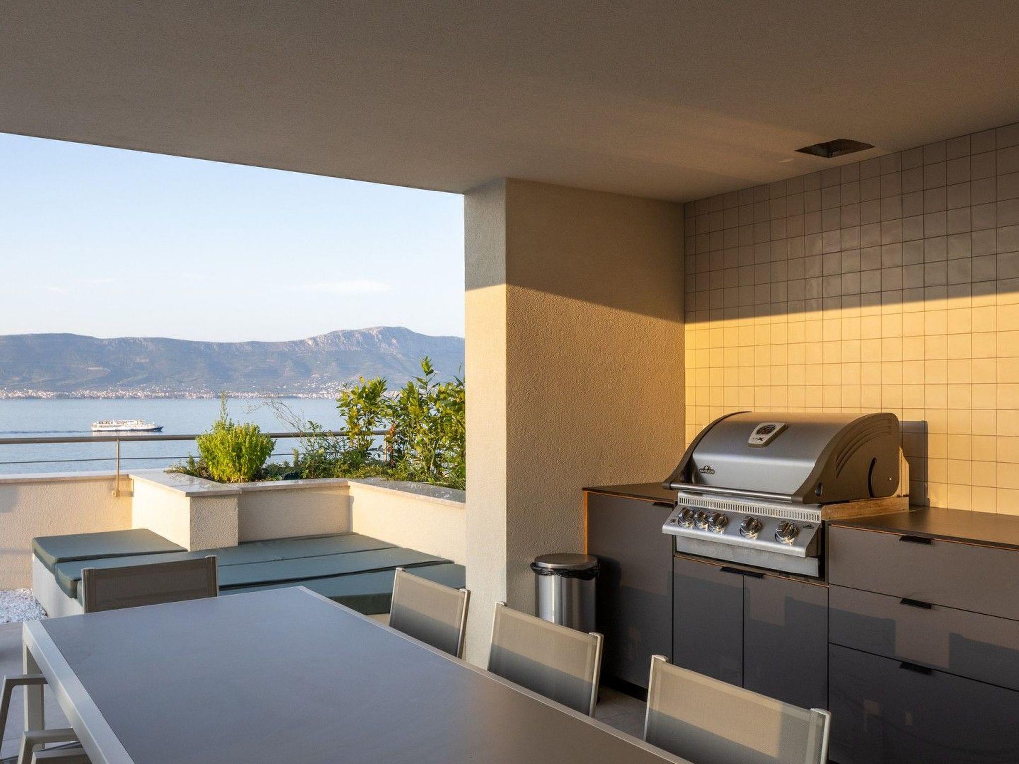 This superbly furnished villa is part of the beachfront complex, Golden. It blends elegance, luxury, and functionality. Situated just 30 meters from a stunning pebble beach and crystal-clear sea, the villa offers an awe-inspiring panoramic view of the coast, mountains, and Split.