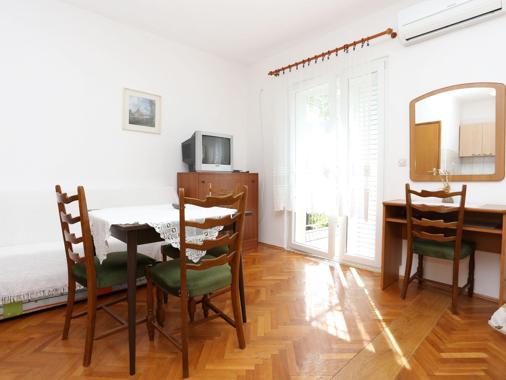 Studio bietet Platz für 3 Gäste. Die Betten sind in Schlafzimmern, die es 1 gibt, und in Esszimmer, innerhalb einer Gesamtfläche von 24m2, angeordnet. Die Gäste haben eine eigene Terrasse zur Verfügung, auf der sie in warmen Sommernächten genießen können. IM PREIS INBEGRIFFEN: Kurtaxe, Endreinigung, Parkplatz, Internet, Bügeleisen, Bügelbrett, Föhn. VERBINDLICHE ZUSÄTZLICHE KOSTEN: Aufzahlung für Kurzaufenthalte (prozentualer Zuschlag pro Nächtigungsanzahl: 30% - 1, 20% - 2, 10% - 3). UNVERBINDLICHE ZUSÄTZLICHE KOSTEN: Klimatisierung (3,00 € pro Nacht). Die Verfügbarkeit zusätzlicher Dienstleistungen in Ihrem reservierten Termin und die Preise derselben (falls nicht aufgeführt) müssen im Voraus überprüft werden. Zusätzliche Dienstleistungen die in der Zahlungsaufforderung nicht aufgeführt sind werden direkt beim Vermieter bezahlt, angenommen der Gast nutzt auch diese.