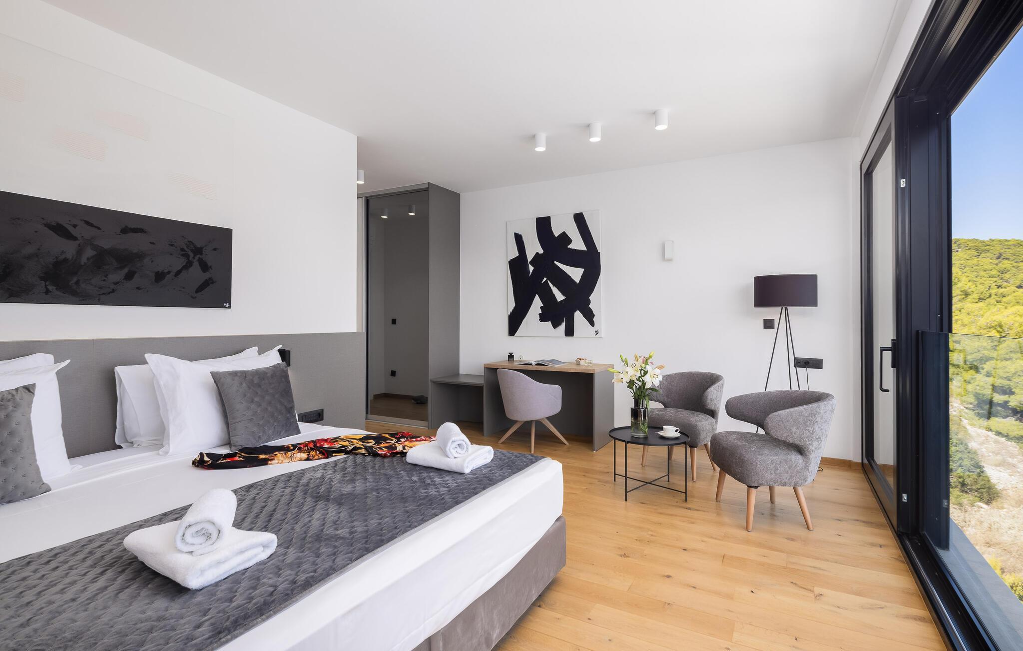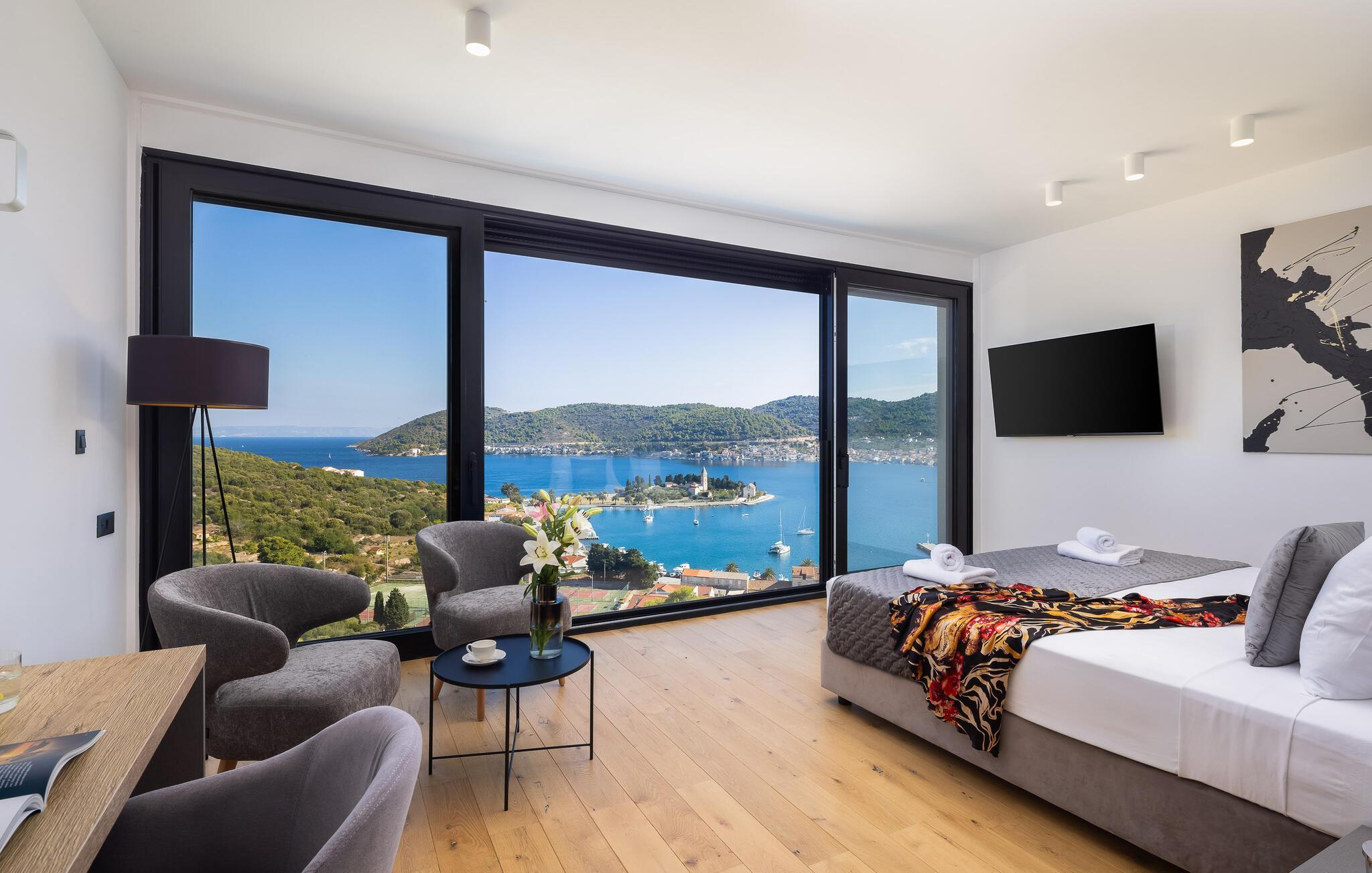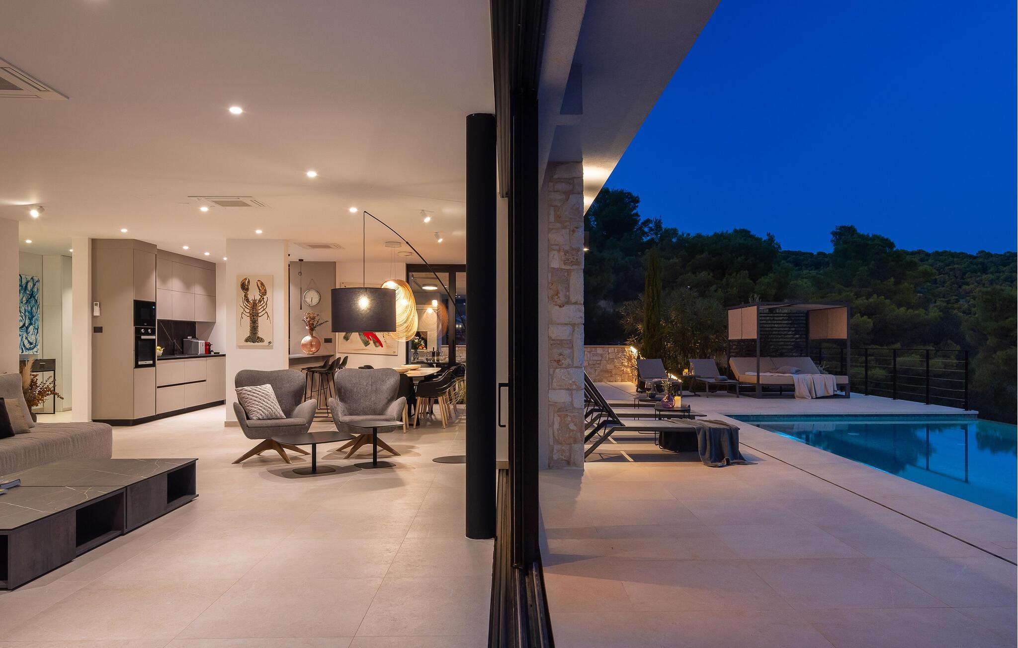 In der Villa Divine View erwartet Sie eine helle, stilvolle Atmosphäre mit einem atemberaubenden Blick auf das Meer und die umliegende Landschaft. Sie können auf dem Sofa entspannen und den weiten Ausblick genießen oder den Abend bei einem guten Film verbringen. Für gesellige Stunden bietet sich ein Spieleabend mit Familie oder Freunden an, während im Hintergrund die Sonne langsam über dem Wasser versinkt.