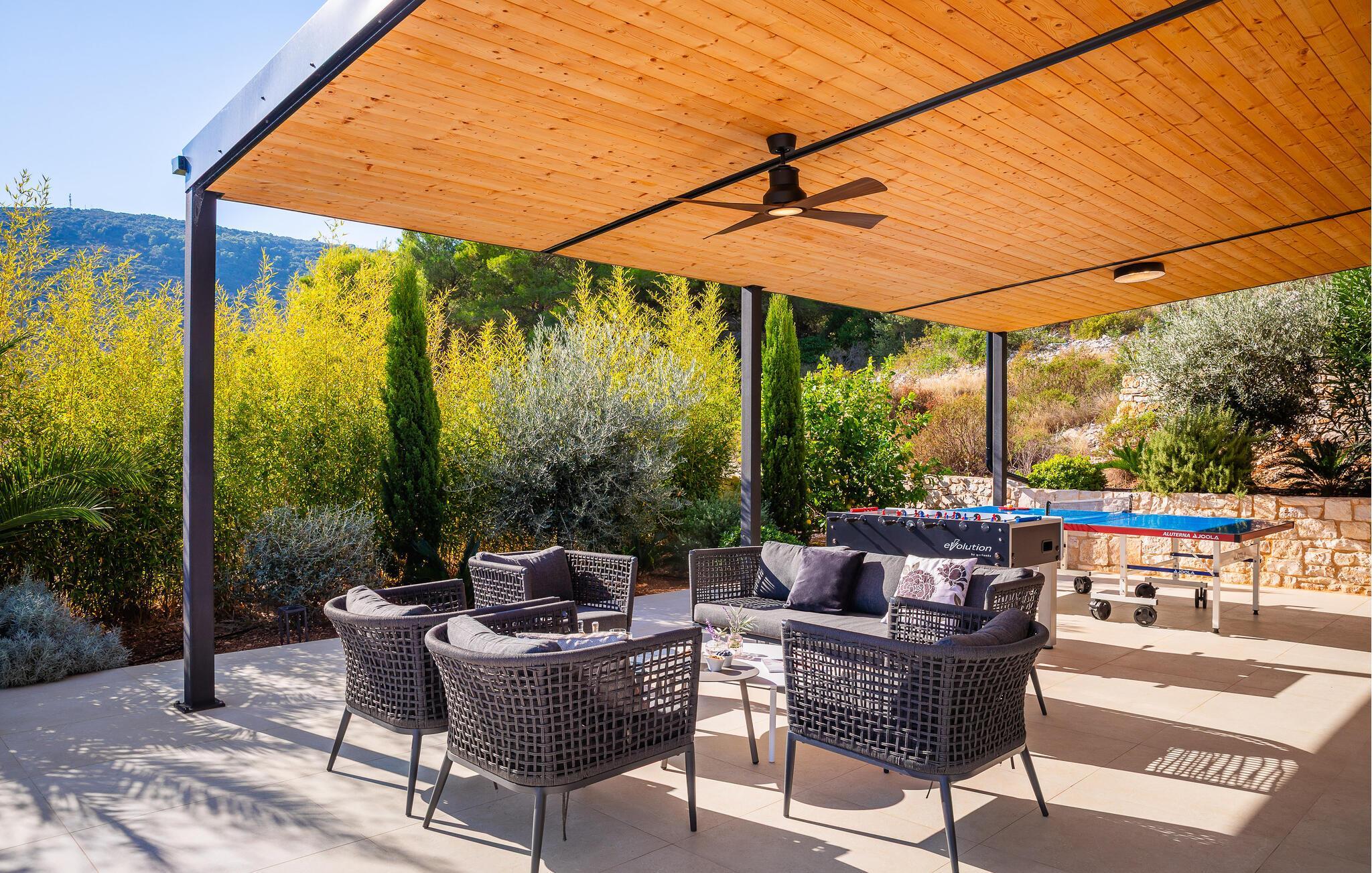 Tagsüber lädt die Terrasse mit Pool dazu ein, die Ruhe und das mediterrane Lebensgefühl in vollen Zügen zu genießen. Zwischen erfrischenden Schwimmrunden können Sie auf den Liegen entspannen oder im Schatten gemütlich etwas lesen. Für aktive Stunden stehen Tischtennis und Billard bereit, ideal für kleine Turniere und fröhliche Runden mit Familie oder Freunden.