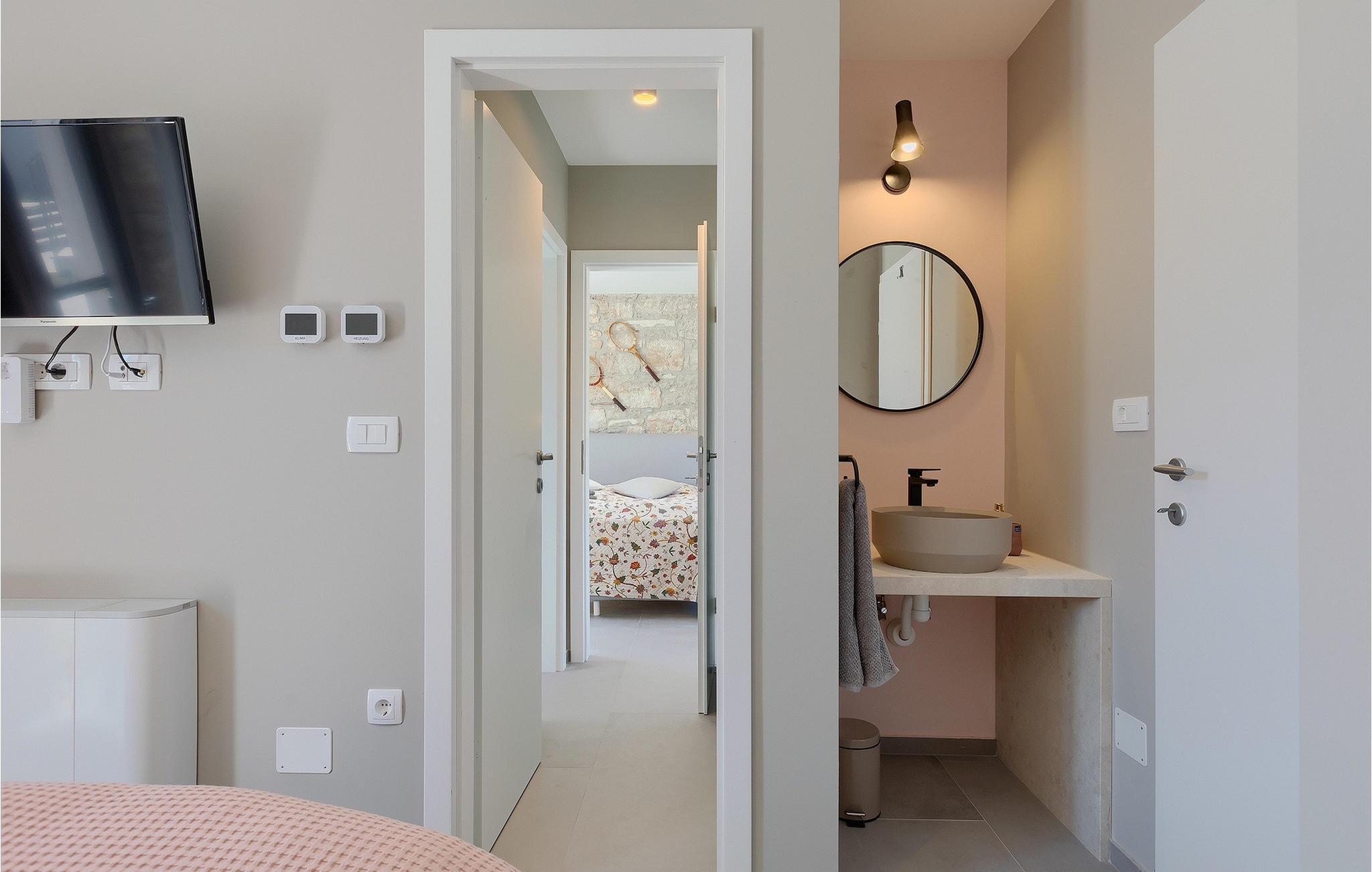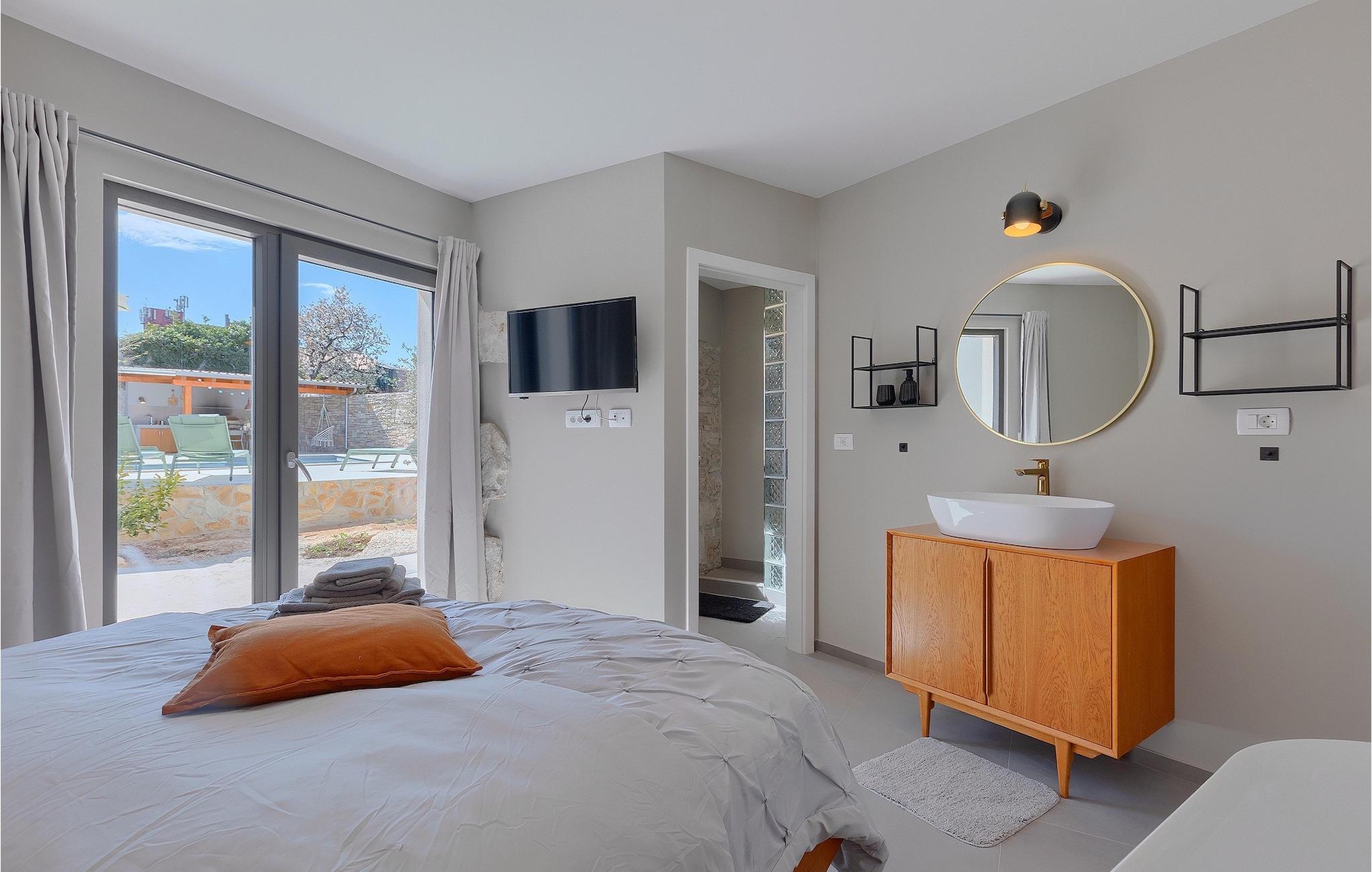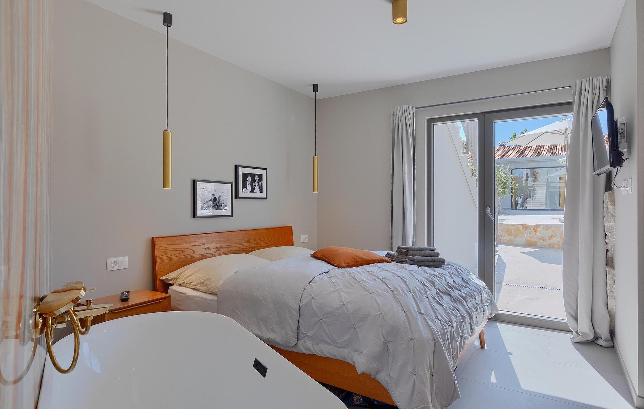 Von hier aus gelangen Sie auch direkt zu den 3 komfortablen Schlafzimmern im Ergeschoss des Hauses. Alle Schlafzimmer haben bequeme Doppelbetten, TV und sind klimatisiert. Eines der Schlafzimmer hat ein eigenes Badezimmer aber auch eine freistehende Badewanne im Zimmer, während sich die beiden anderen Schlafzimmer ein Bad mit Dusche teilen.