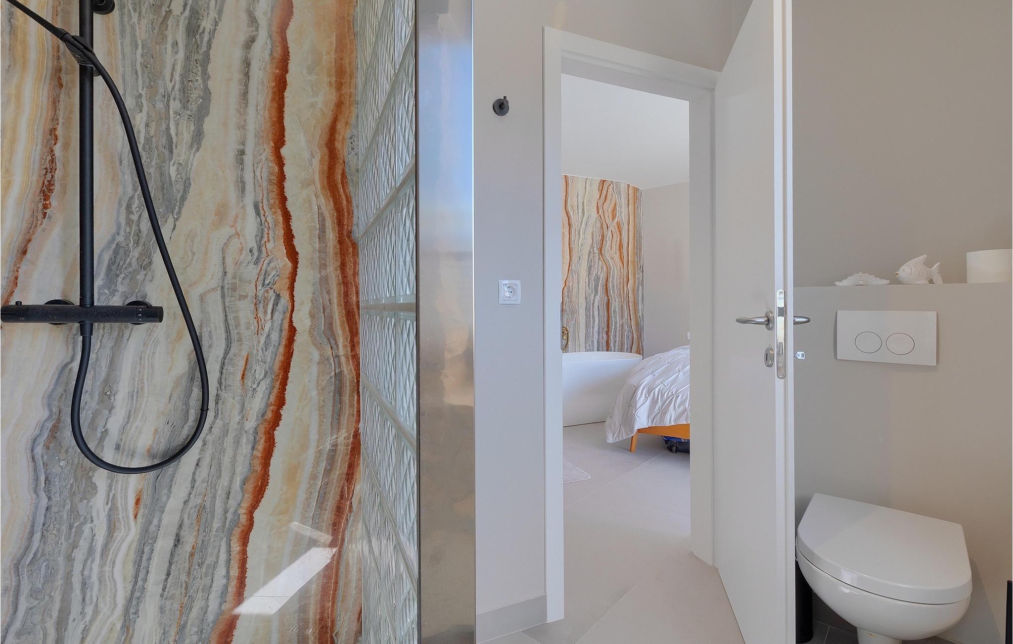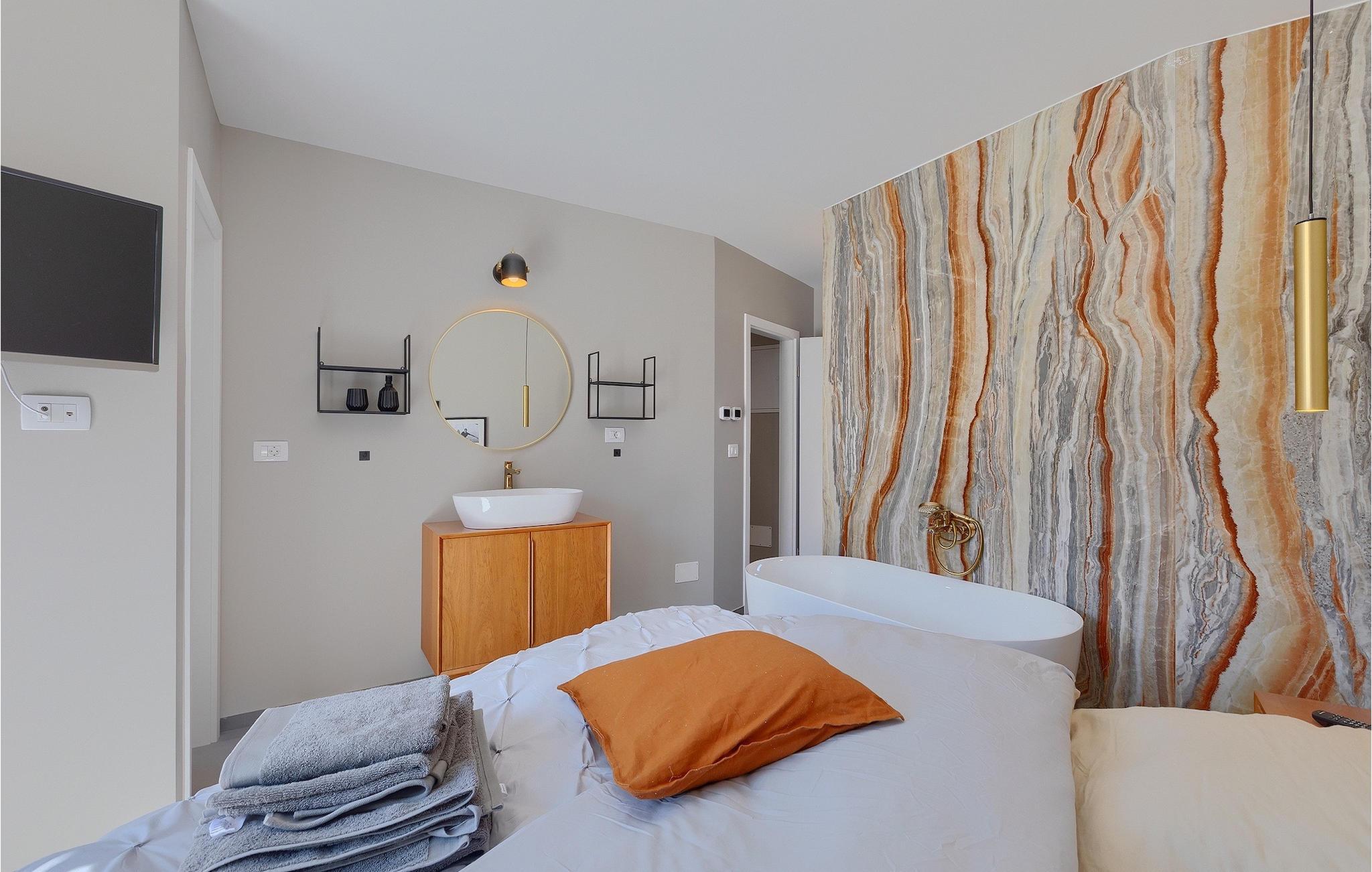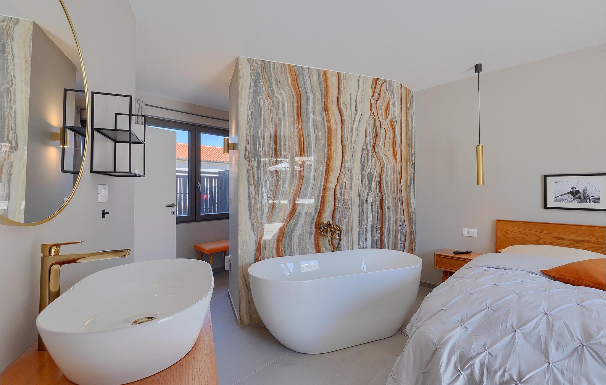 Von hier aus gelangen Sie auch direkt zu den 3 komfortablen Schlafzimmern im Ergeschoss des Hauses. Alle Schlafzimmer haben bequeme Doppelbetten, TV und sind klimatisiert. Eines der Schlafzimmer hat ein eigenes Badezimmer aber auch eine freistehende Badewanne im Zimmer, während sich die beiden anderen Schlafzimmer ein Bad mit Dusche teilen.