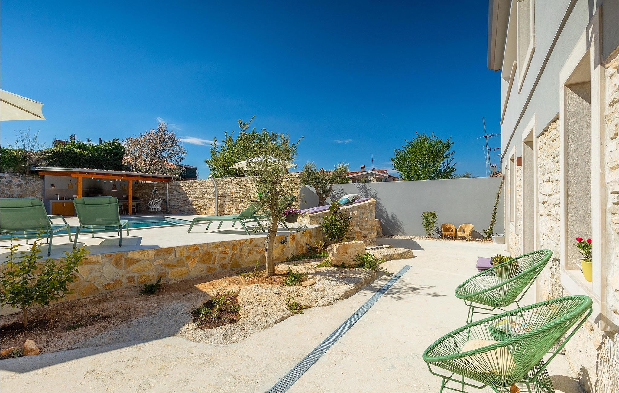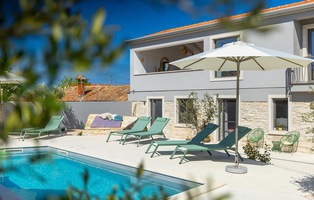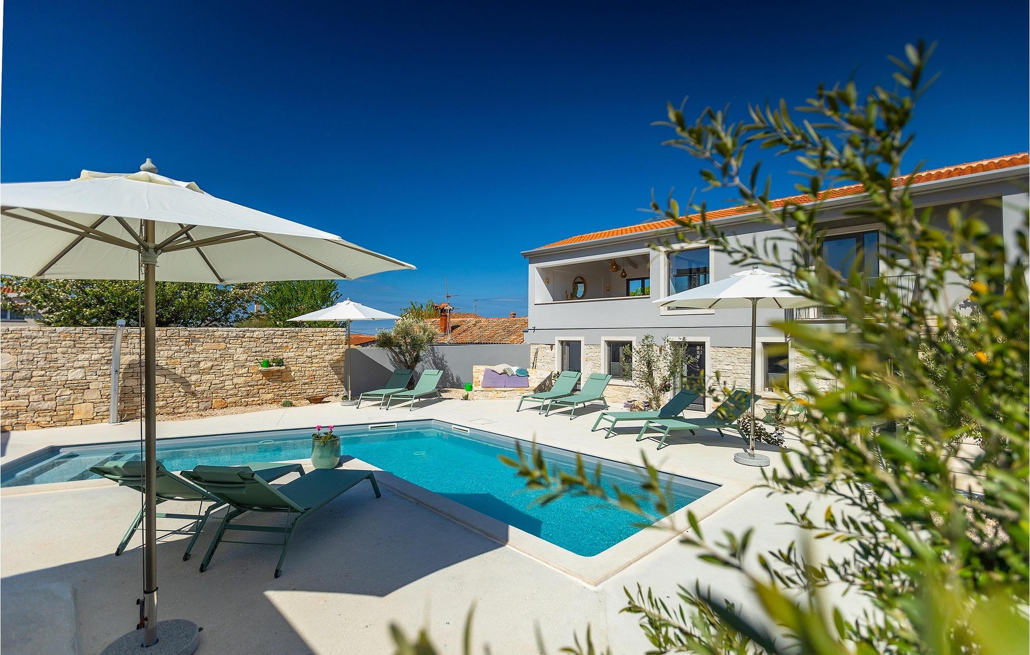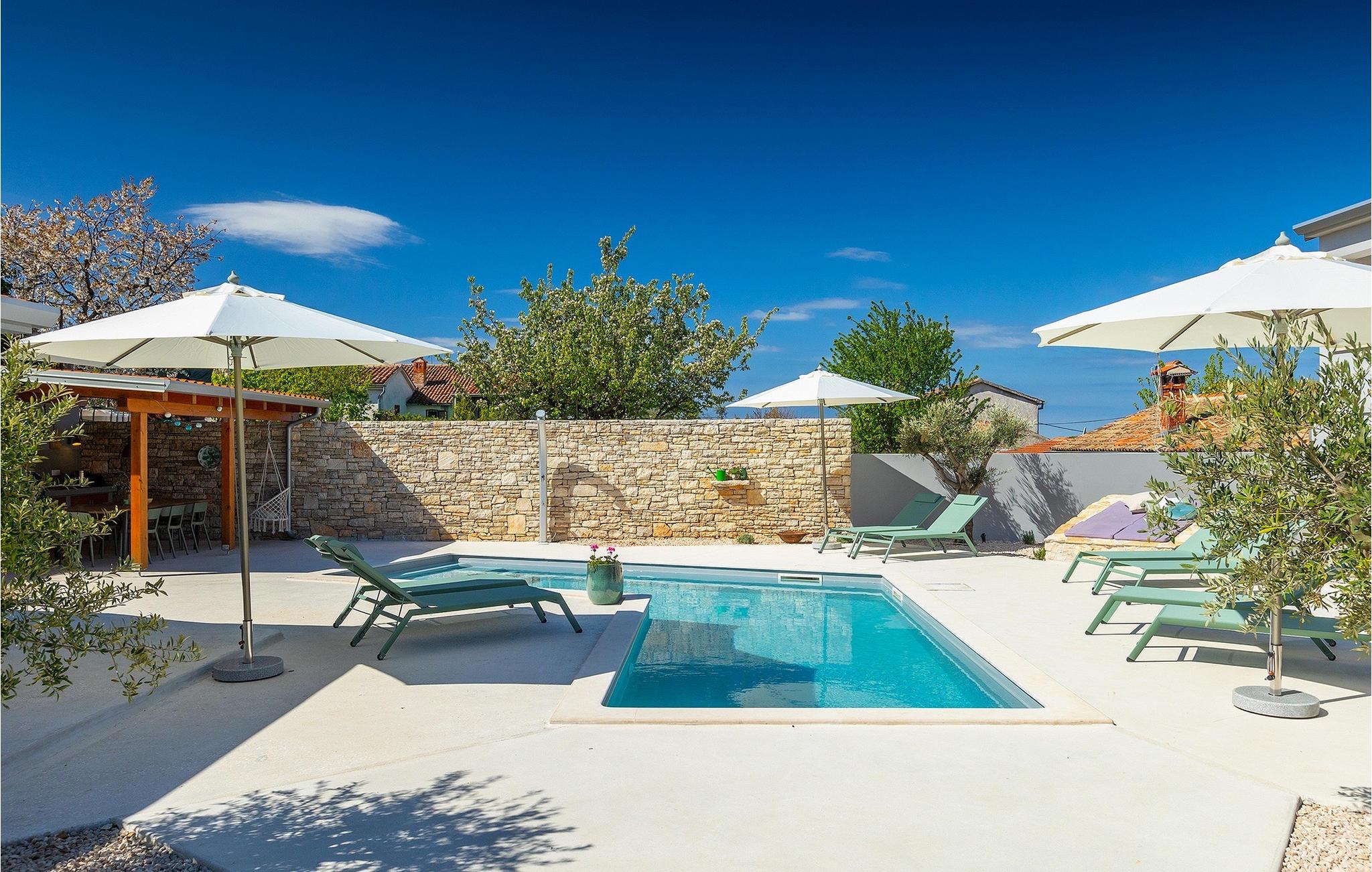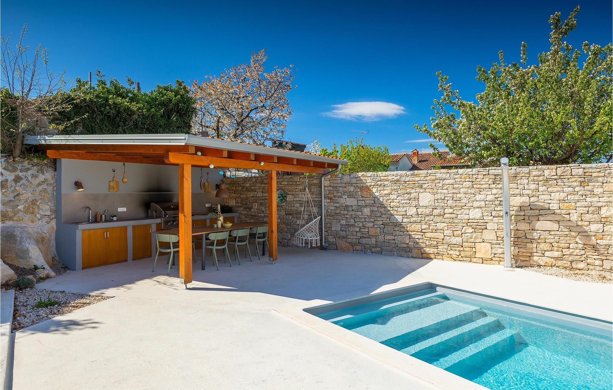 Schon der Pool allein mit seiner außergewöhnlichen Form ist ein Blickfang. Hier finden Sie die nötige Erfrischung an heißen Sommertagen. Die überdachte Sommerküche mit Grill und Esstisch ist der ideale Ort, um Familie und Freunde zu versammeln und Ausflüge zu planen oder gemütliche Abende zu verbringen. Genießen Sie die istrische Sonne auf einer der Sonnenliegen am Pool oder spielen Sie eine Runde Basketball. Hier wird jeder seinen Lieblingsplatz finden.