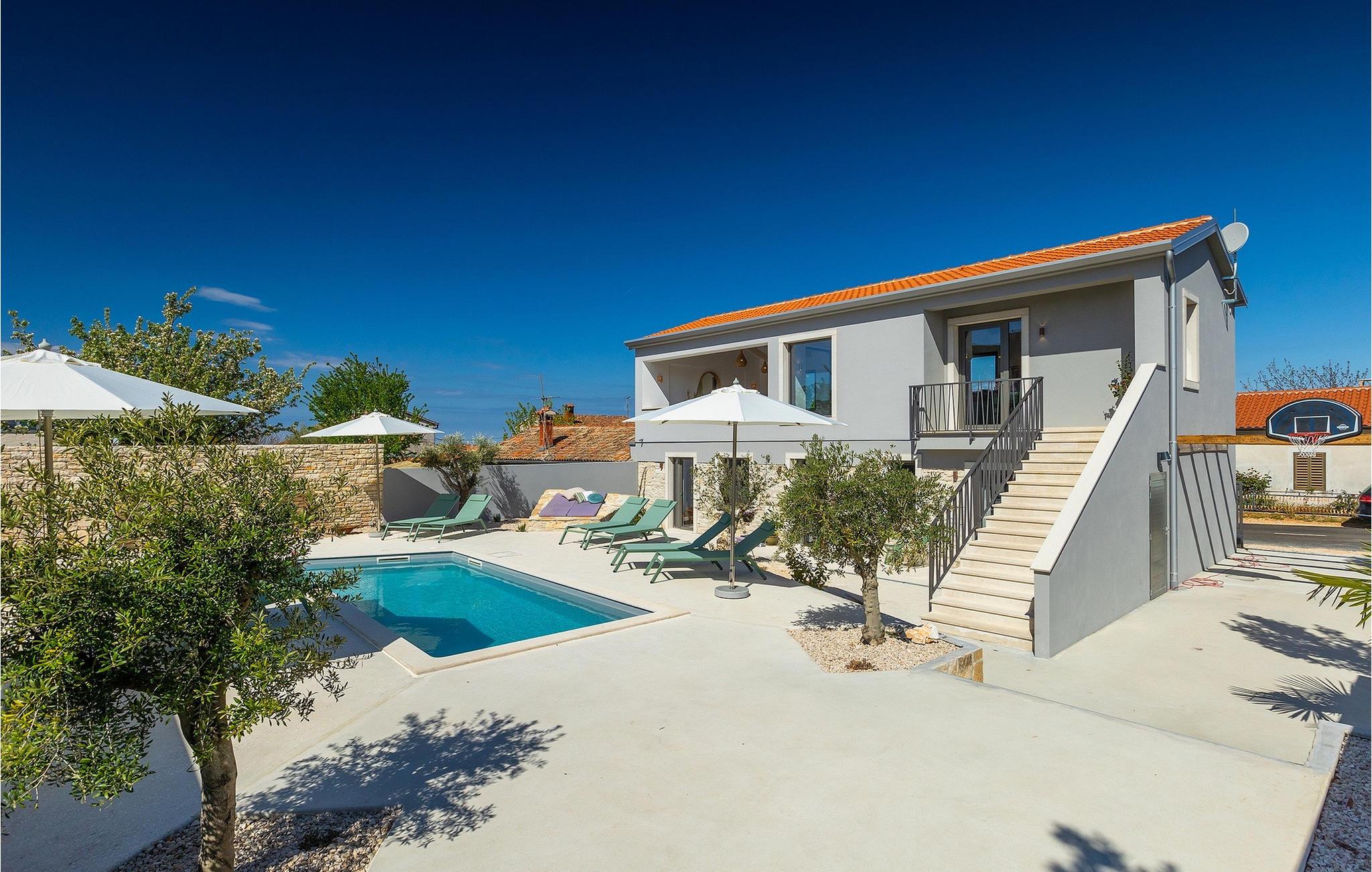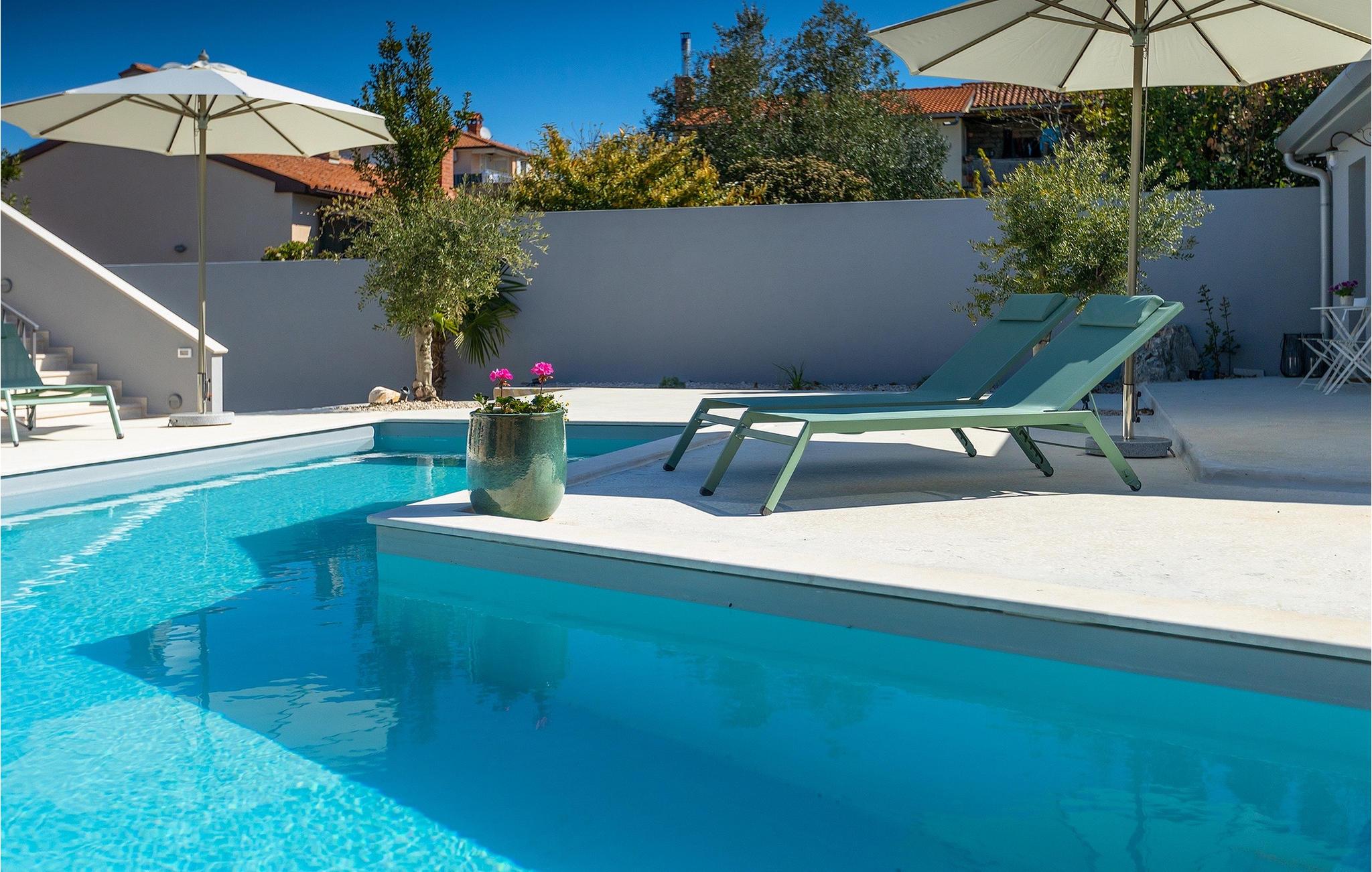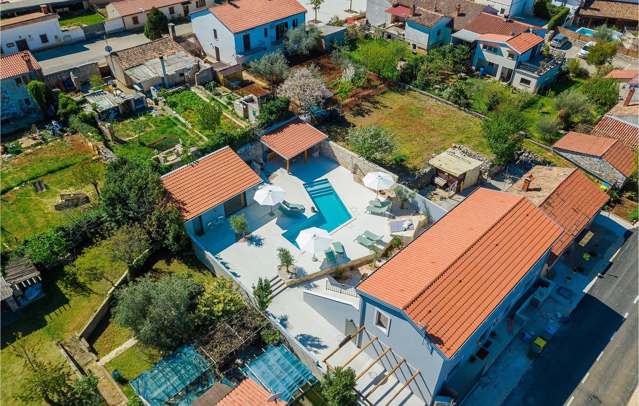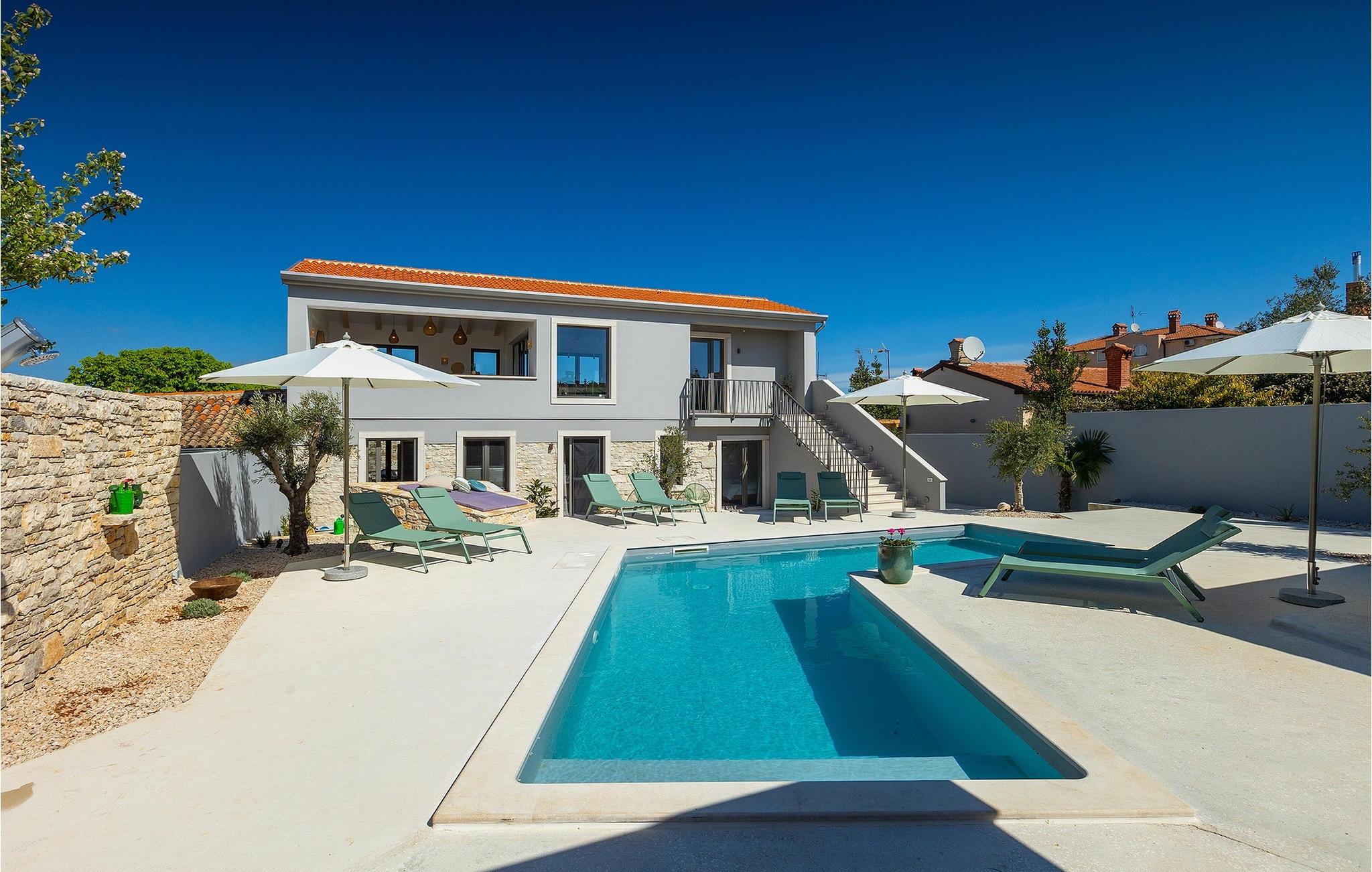 Schon der Pool allein mit seiner außergewöhnlichen Form ist ein Blickfang. Hier finden Sie die nötige Erfrischung an heißen Sommertagen. Die überdachte Sommerküche mit Grill und Esstisch ist der ideale Ort, um Familie und Freunde zu versammeln und Ausflüge zu planen oder gemütliche Abende zu verbringen. Genießen Sie die istrische Sonne auf einer der Sonnenliegen am Pool oder spielen Sie eine Runde Basketball. Hier wird jeder seinen Lieblingsplatz finden.