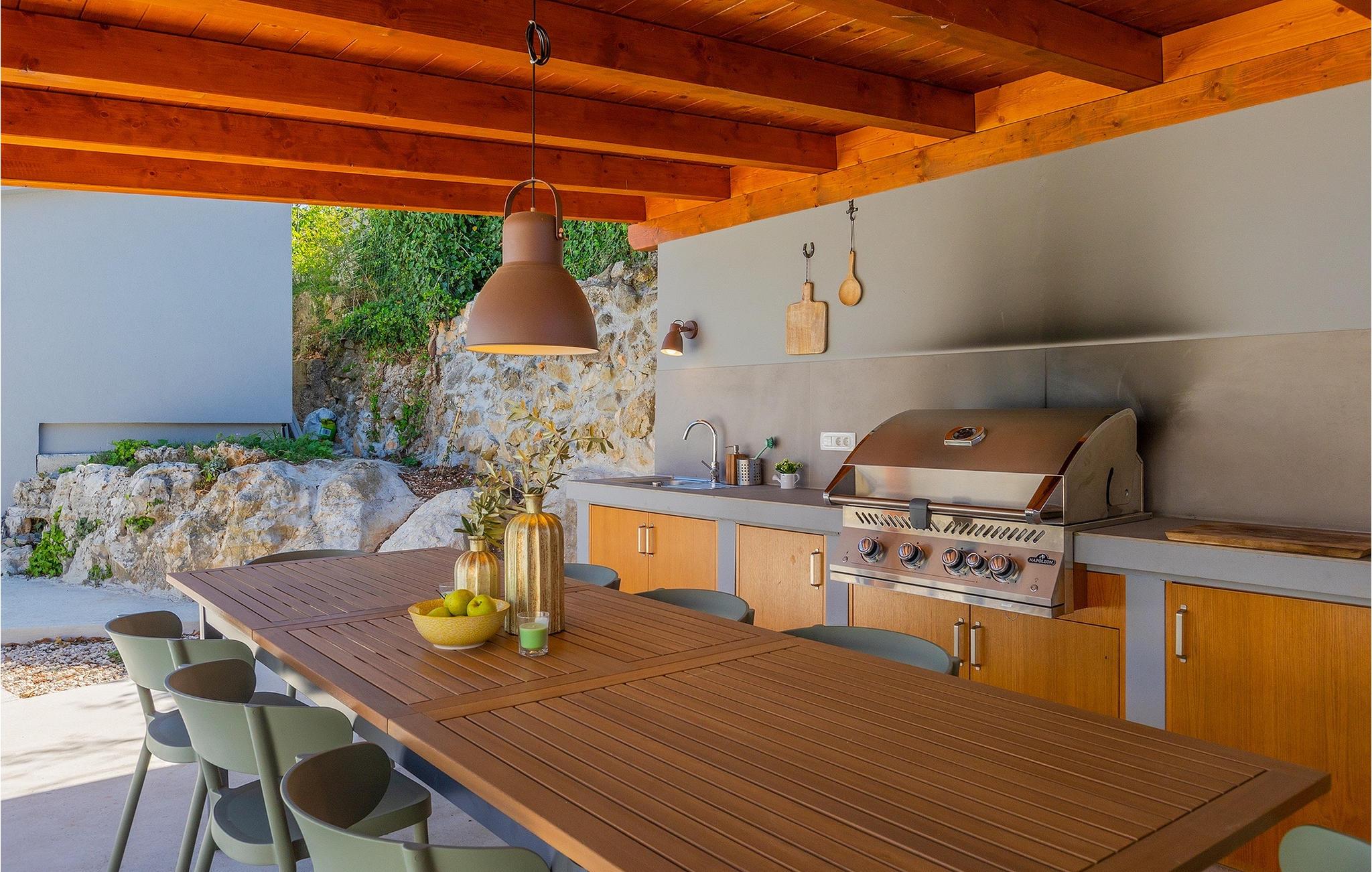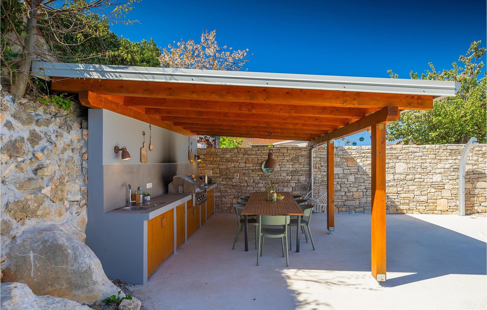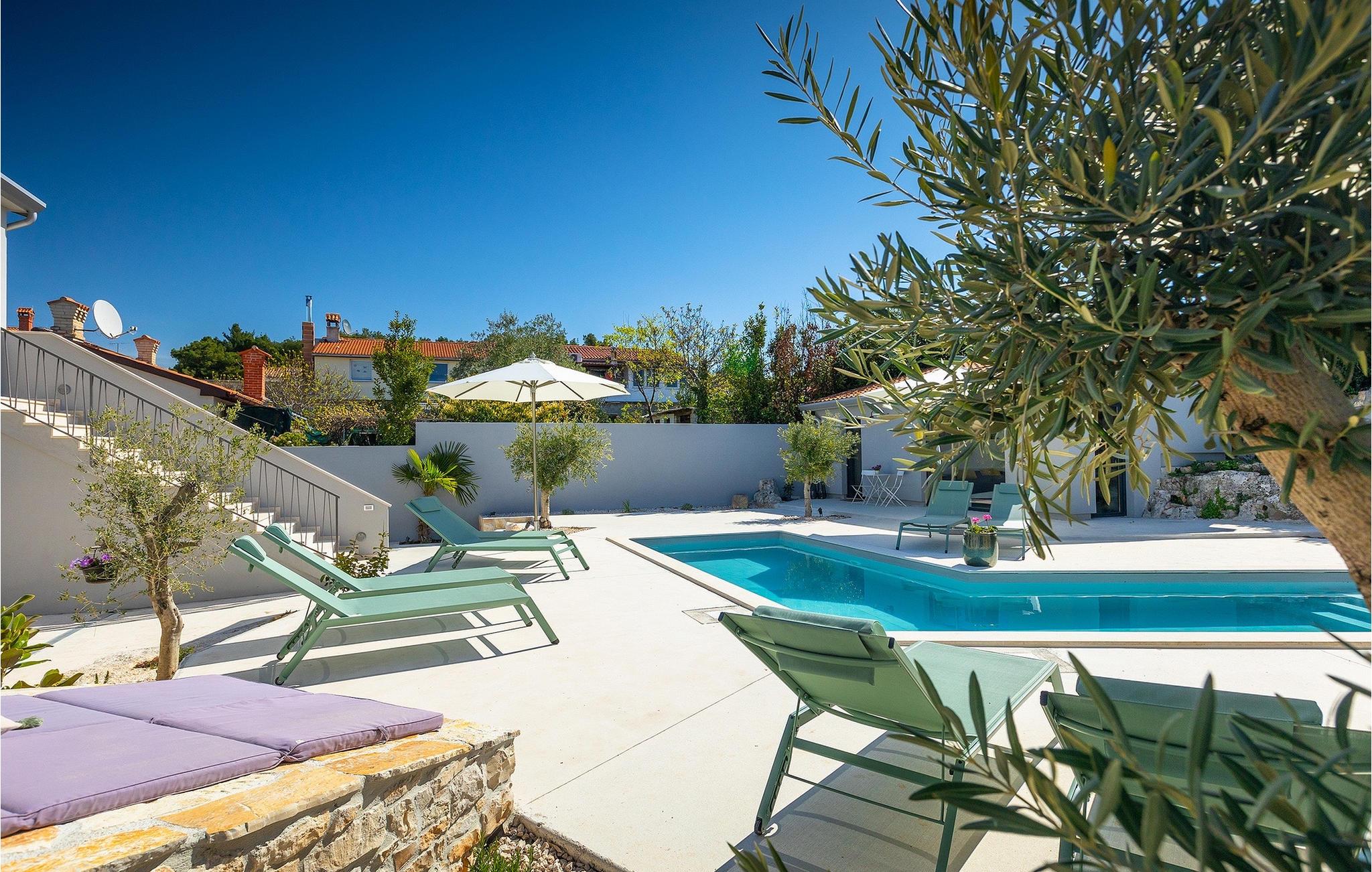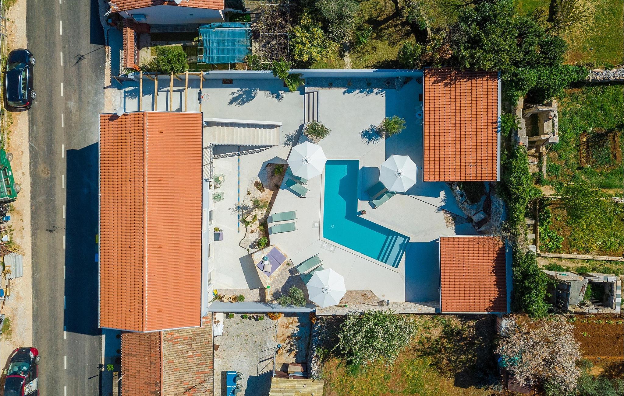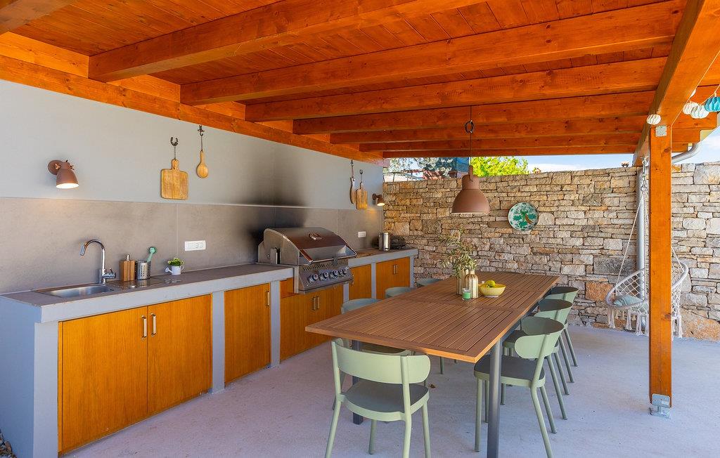Schon der Pool allein mit seiner außergewöhnlichen Form ist ein Blickfang. Hier finden Sie die nötige Erfrischung an heißen Sommertagen. Die überdachte Sommerküche mit Grill und Esstisch ist der ideale Ort, um Familie und Freunde zu versammeln und Ausflüge zu planen oder gemütliche Abende zu verbringen. Genießen Sie die istrische Sonne auf einer der Sonnenliegen am Pool oder spielen Sie eine Runde Basketball. Hier wird jeder seinen Lieblingsplatz finden.
