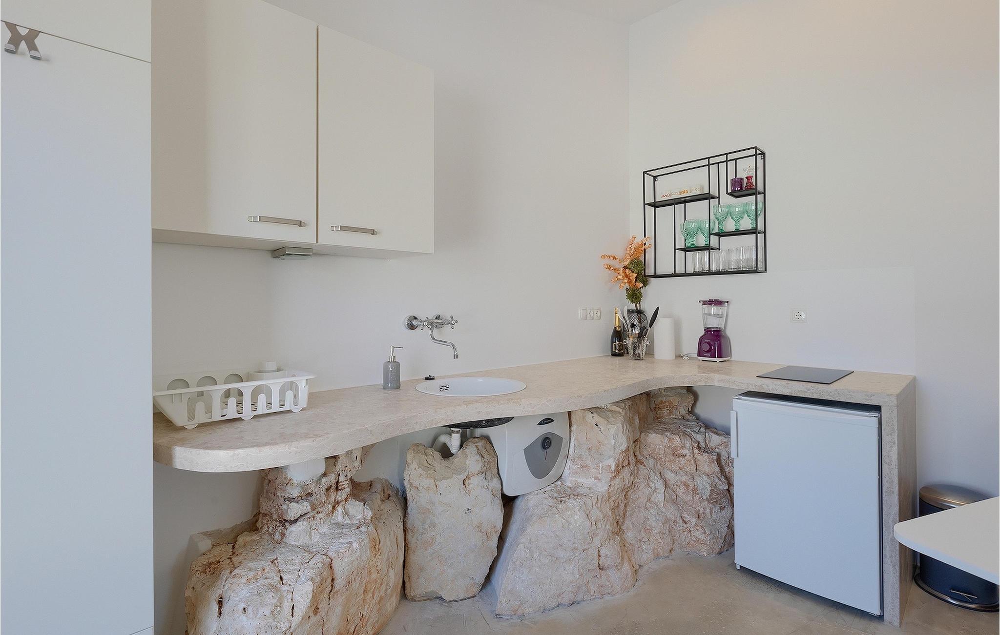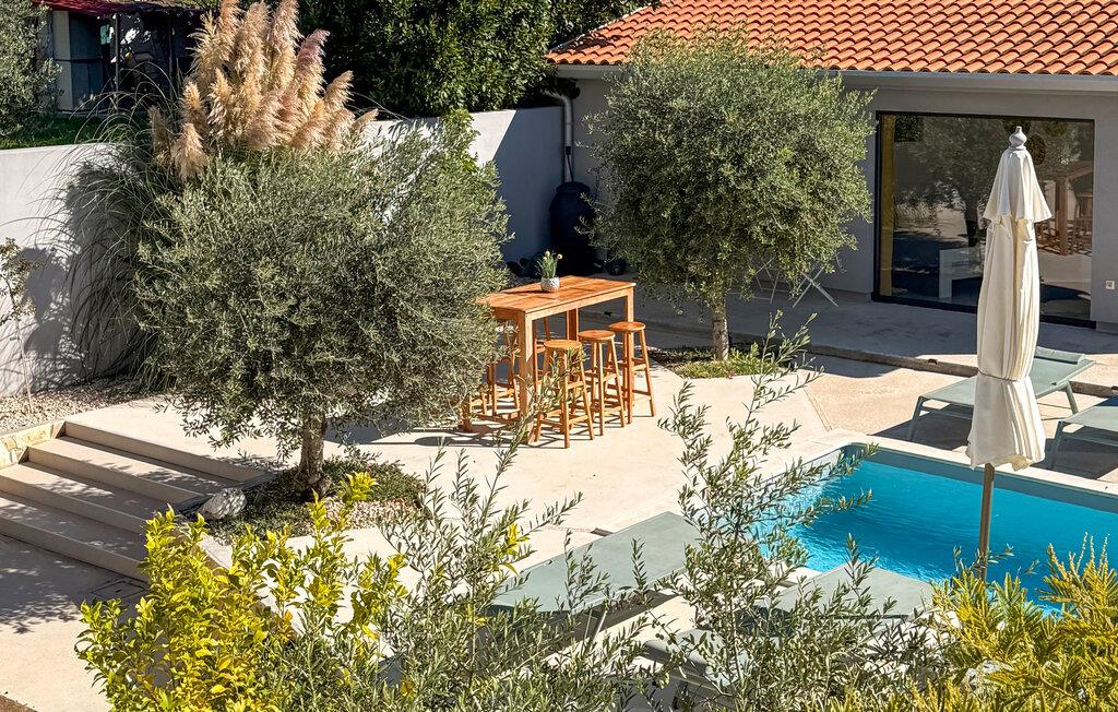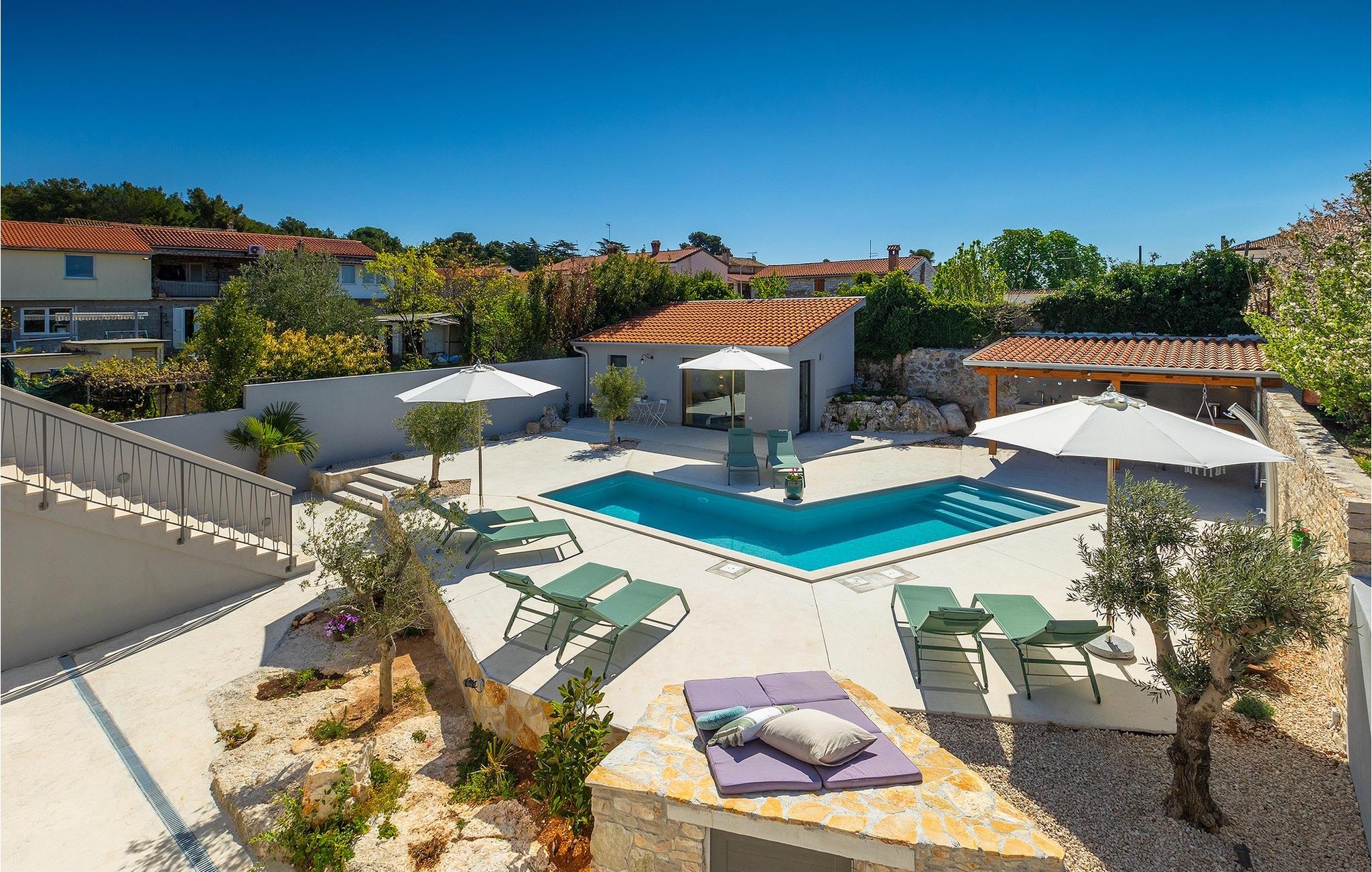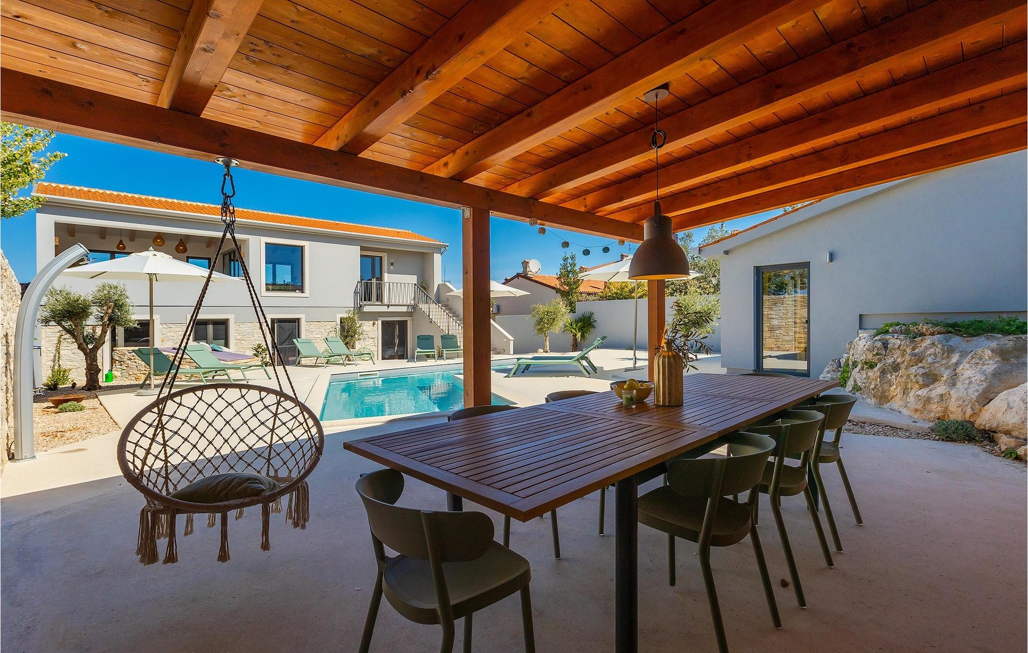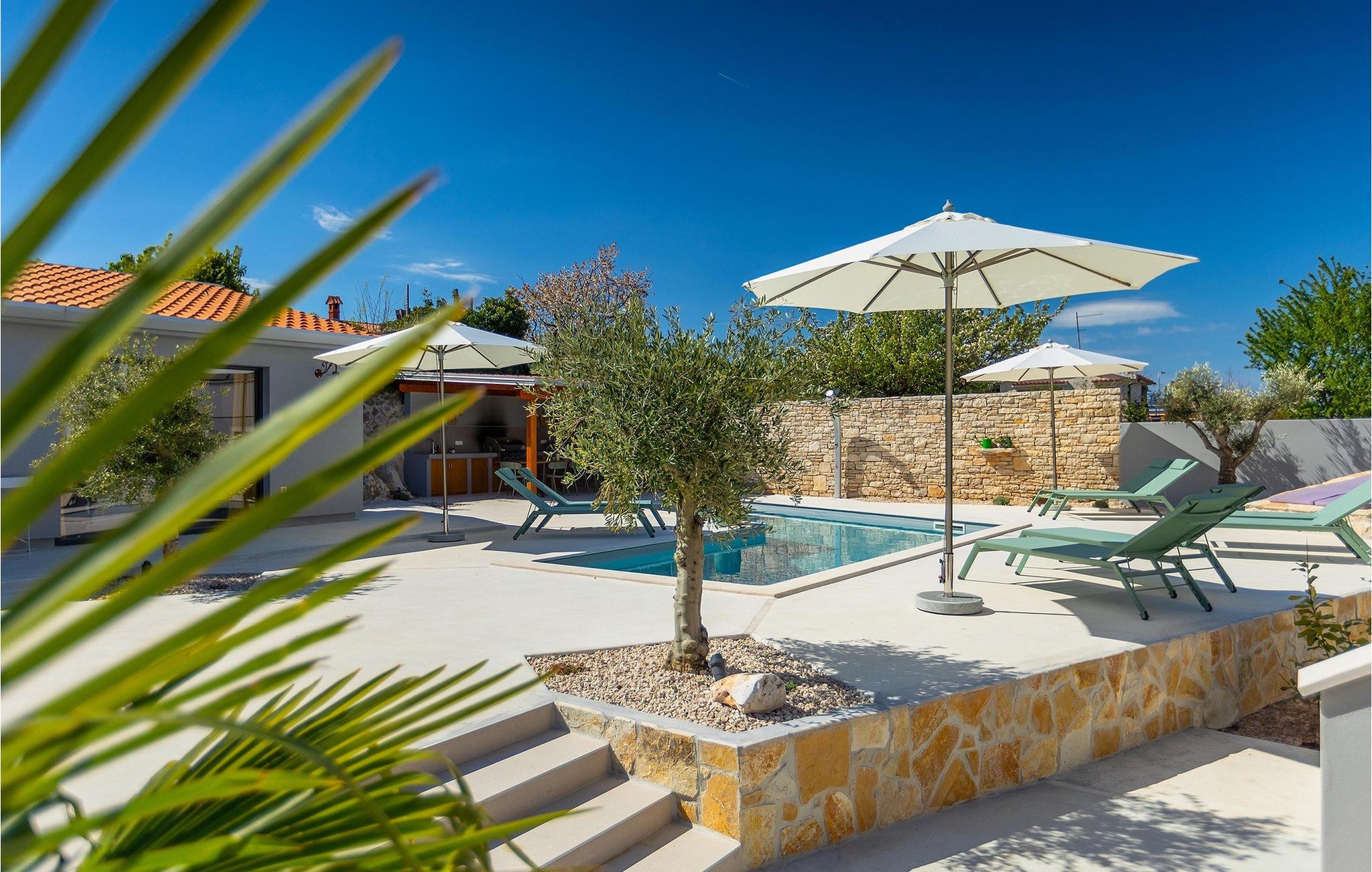 Schon der Pool allein mit seiner außergewöhnlichen Form ist ein Blickfang. Hier finden Sie die nötige Erfrischung an heißen Sommertagen. Die überdachte Sommerküche mit Grill und Esstisch ist der ideale Ort, um Familie und Freunde zu versammeln und Ausflüge zu planen oder gemütliche Abende zu verbringen. Genießen Sie die istrische Sonne auf einer der Sonnenliegen am Pool oder spielen Sie eine Runde Basketball. Hier wird jeder seinen Lieblingsplatz finden.