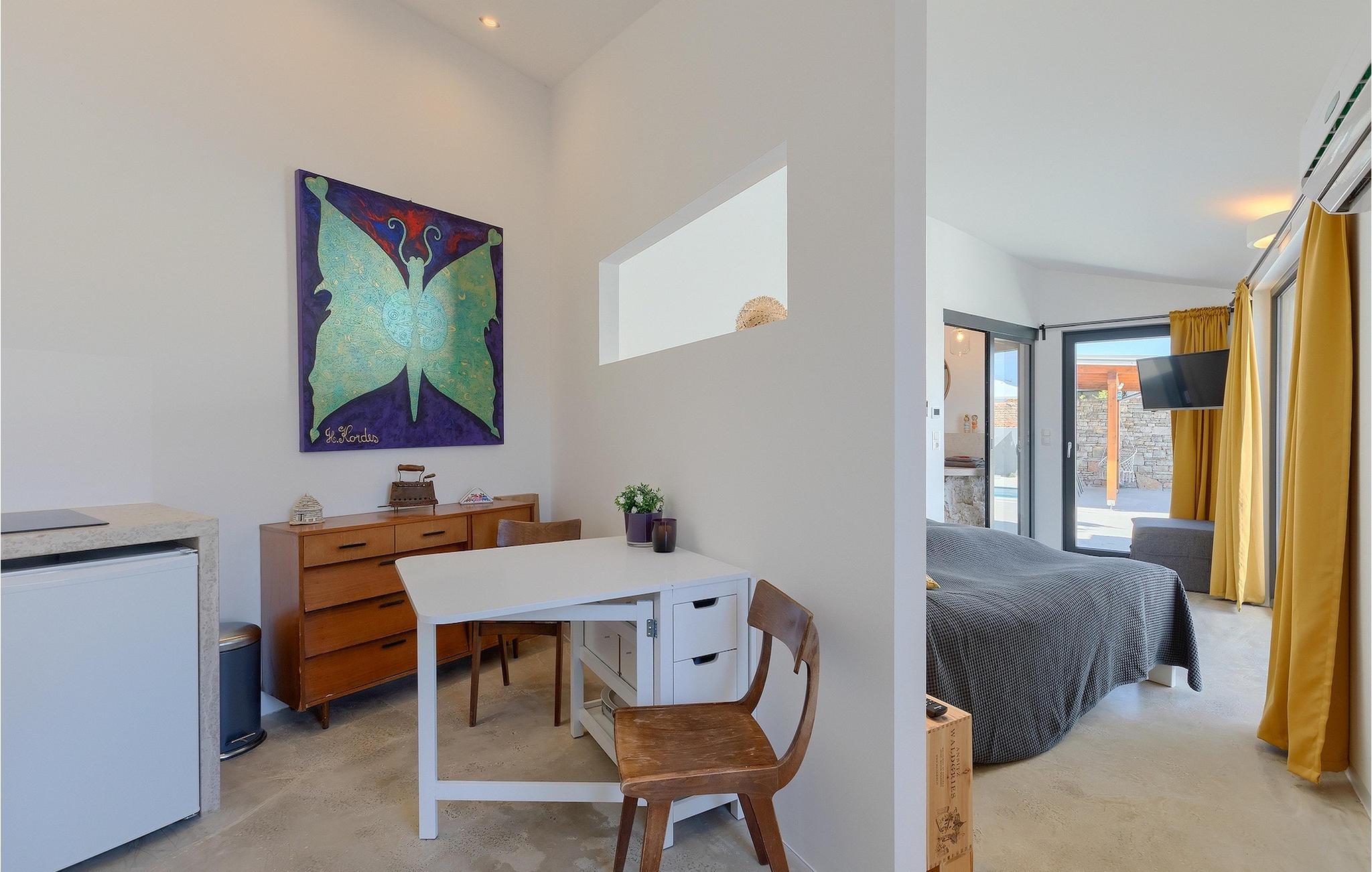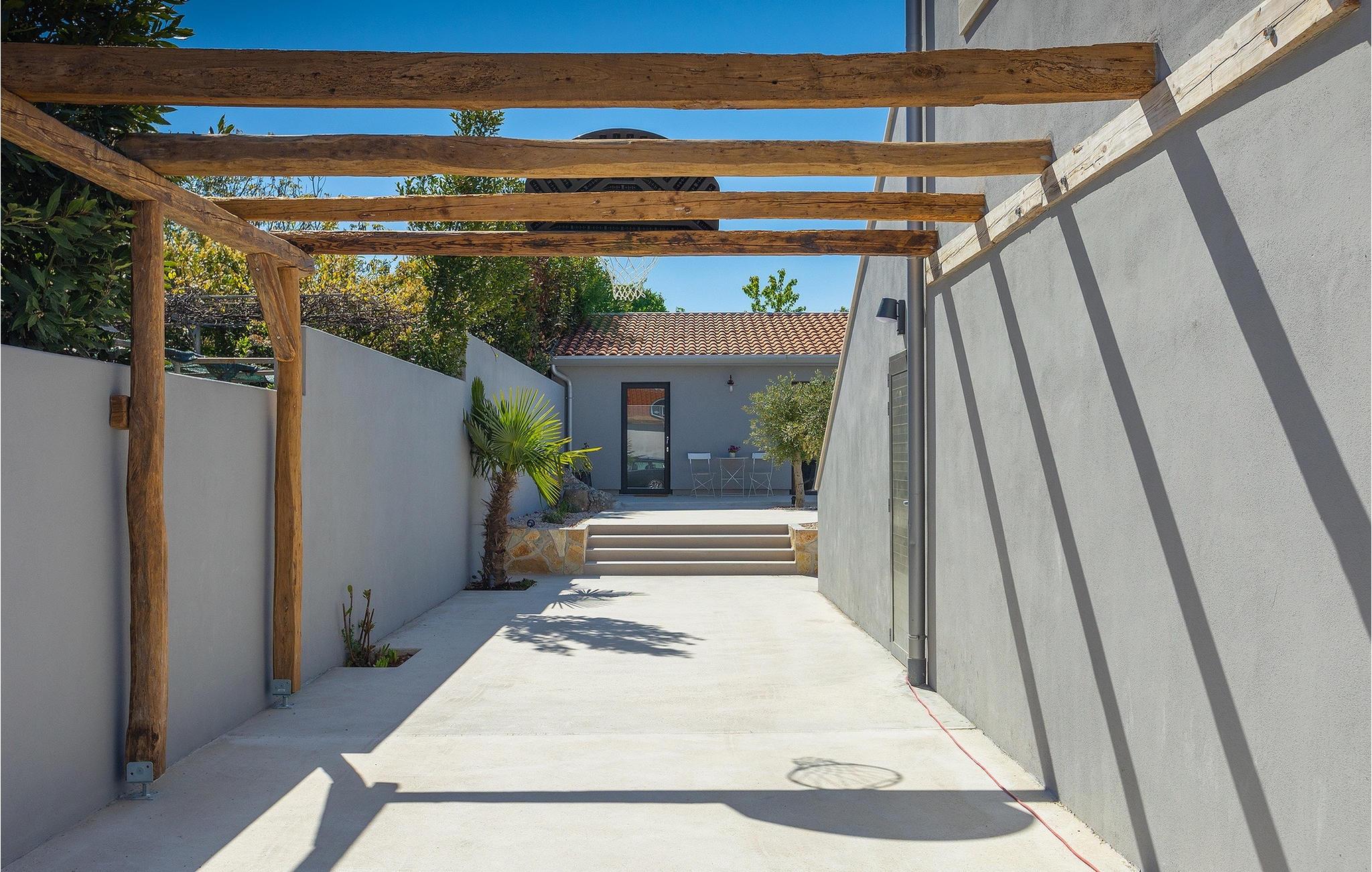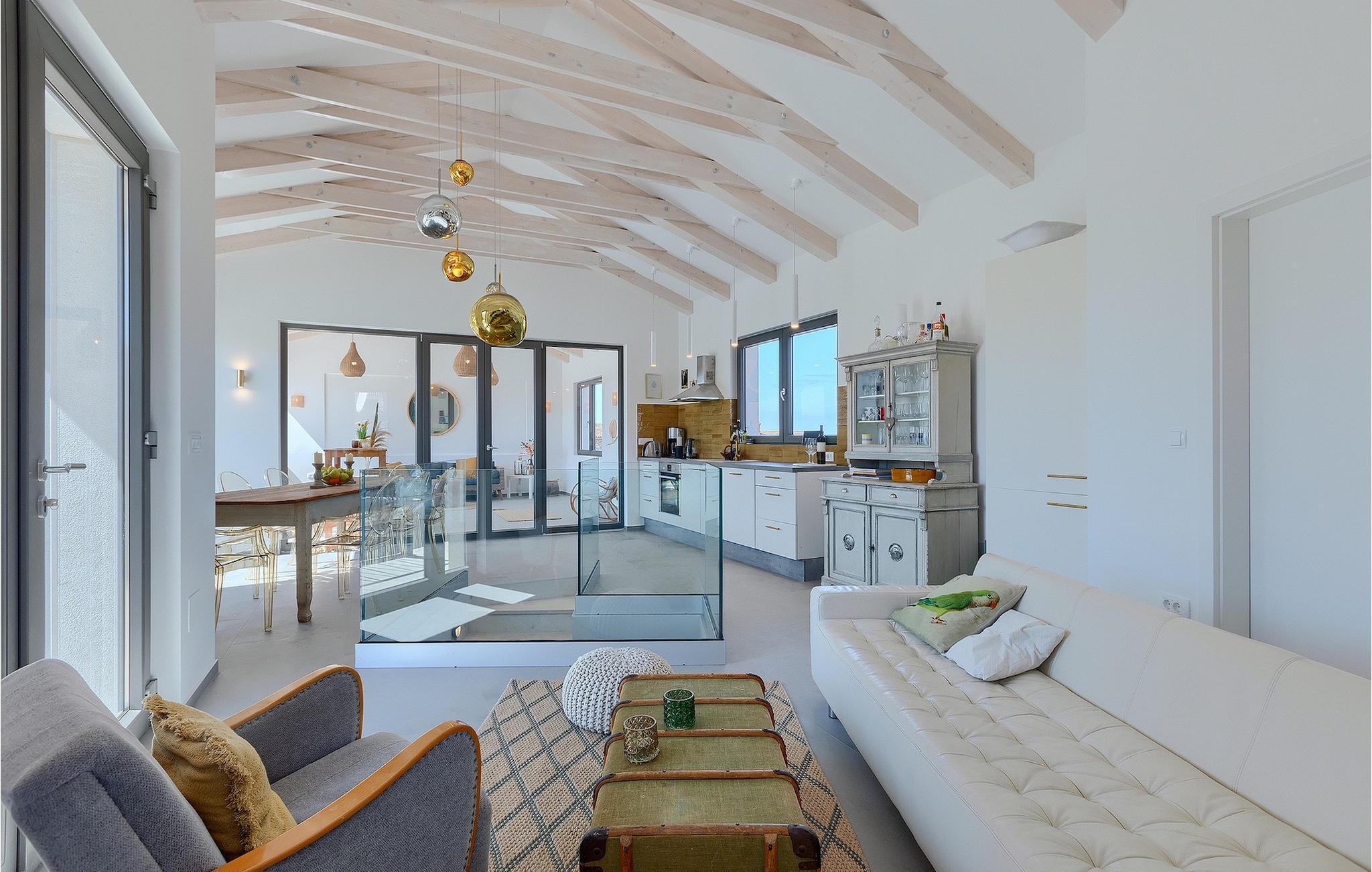 Die gemütliche überdachte Terrasse auf der oberen Etage des Hauses könnte Ihr Lieblingsplatz werden, an dem Sie zum ersten Kaffee am Morgen die Seele baumeln lassen können. Auf der gleichen Ebene befinden sich der offene moderne Wohn- und Kochbereich sowie eine Gästetoilette. Ein Highlight der Villa Casa Juno ist das Poolhaus mit schickem Schlafzimmer für 2 Gäste, Badezimmer und einer eigenen kleinen Küche.