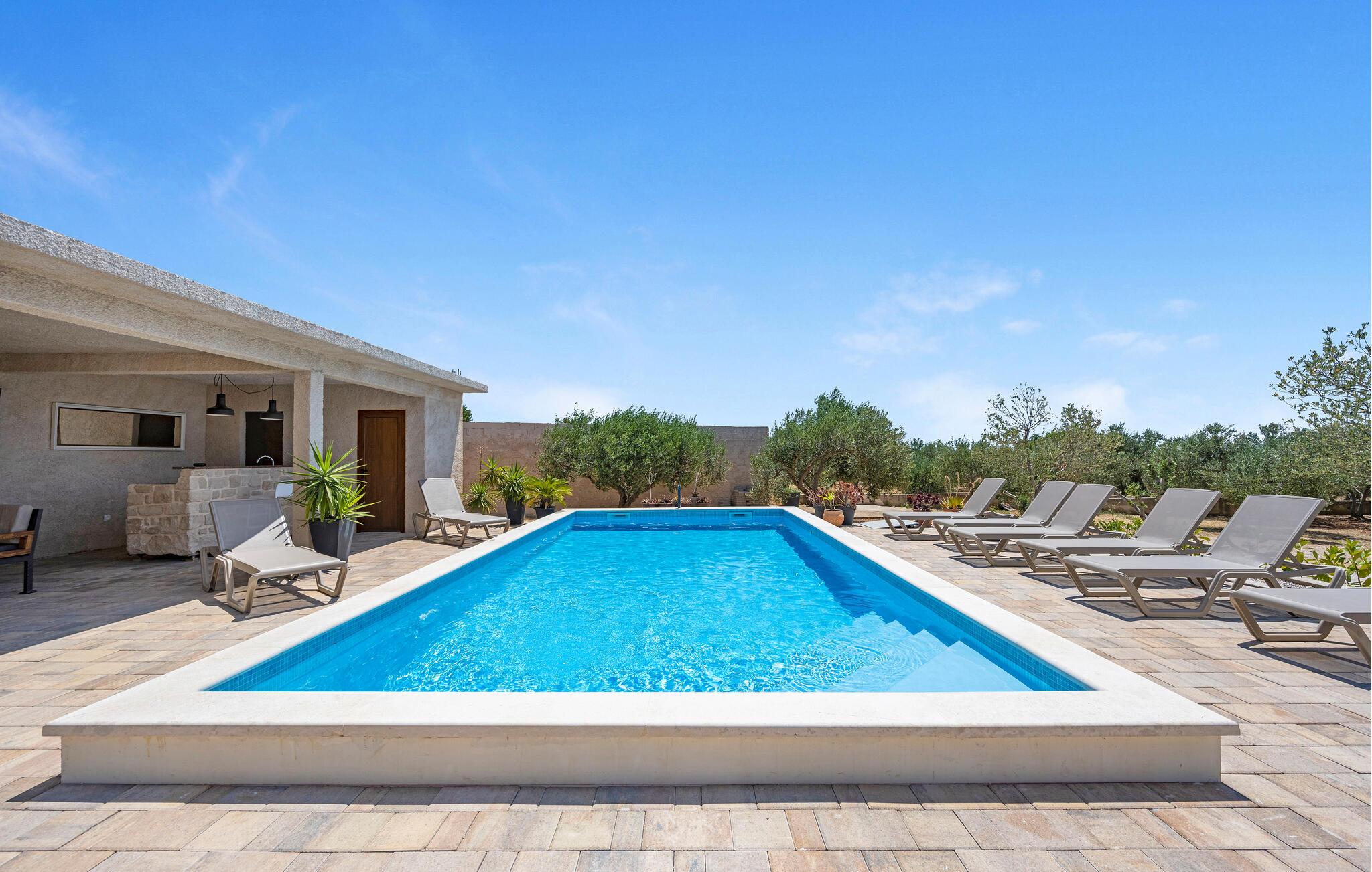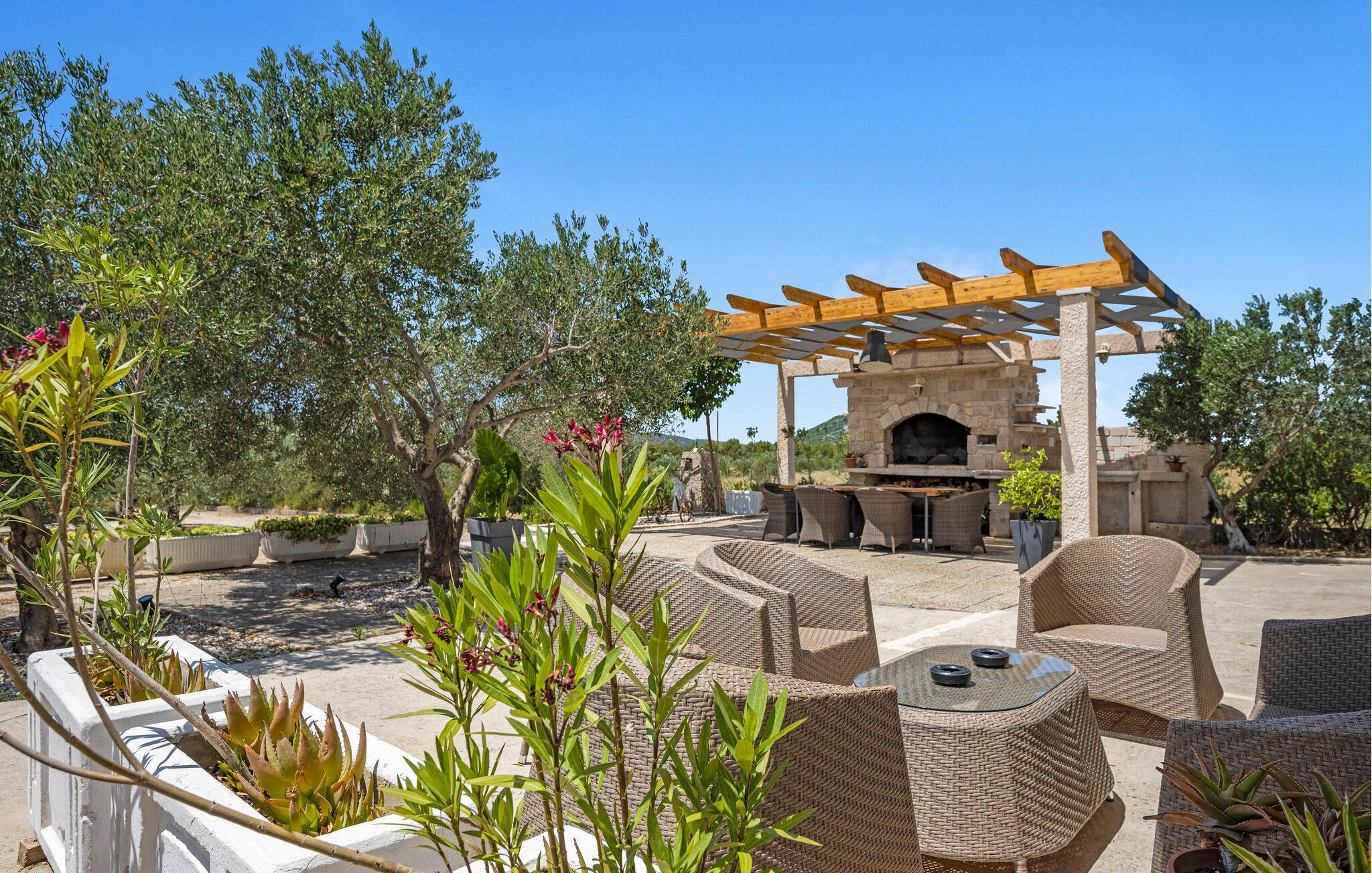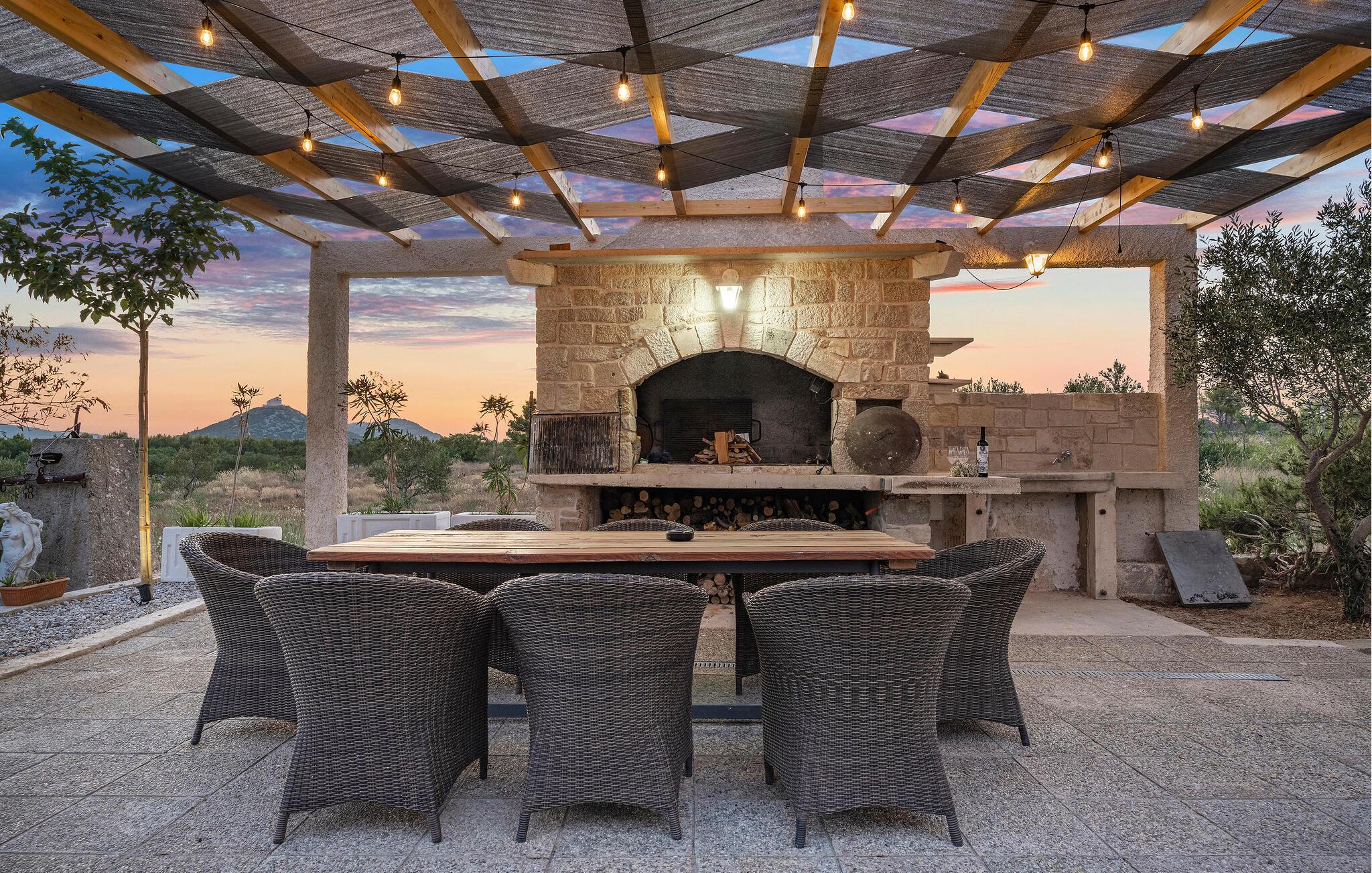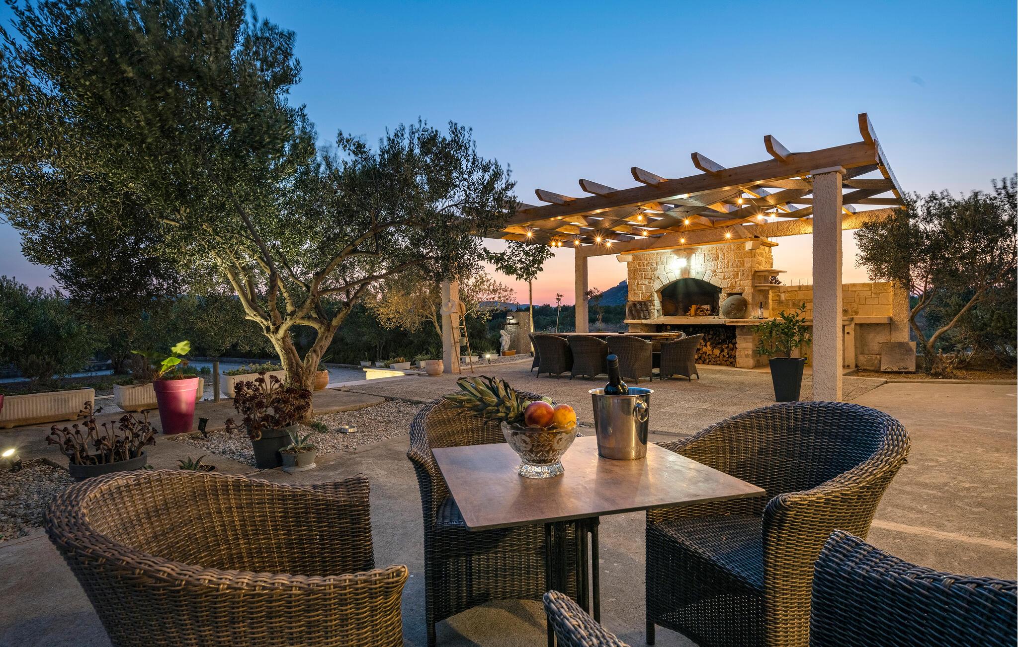 Der sensationelle Außenbereich ist eine echte Ruheoase. Ziehen Sie morgens gemächlich Ihre Bahnen im herrlichen Pool, tanken Sie Sonne auf der Liege und gönnen Sie sich ein erfrischendes Getränk im Schatten. Lauschen Sie dem leisen Knistern des Außenkamins oder genießen Sie Köstlichkeiten vom Grill mit Blick auf den Olivenhain.