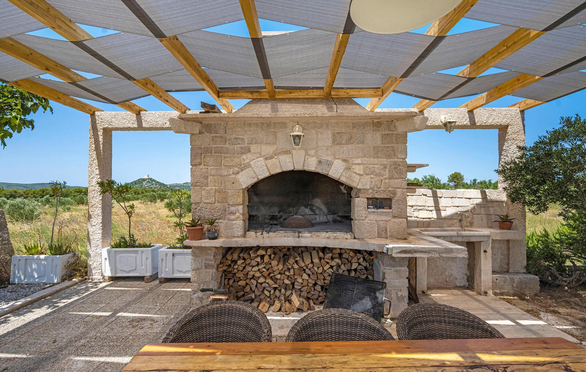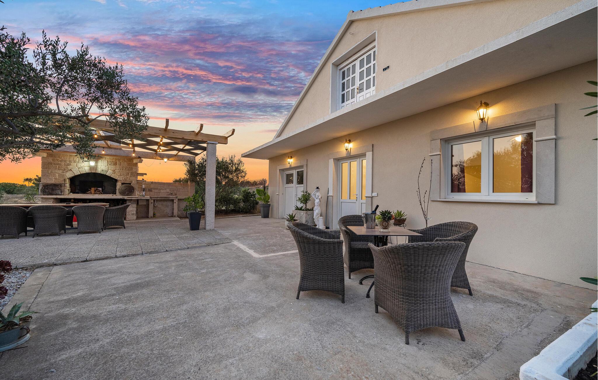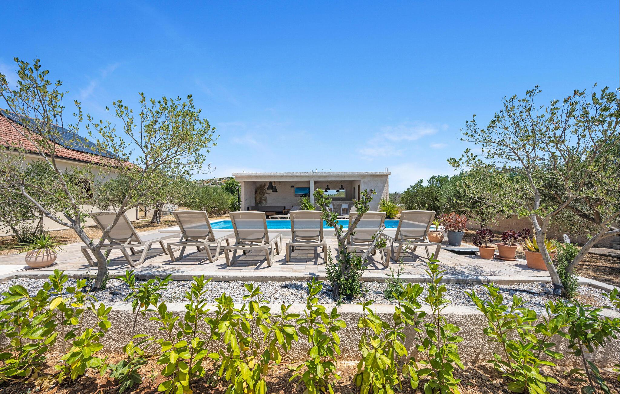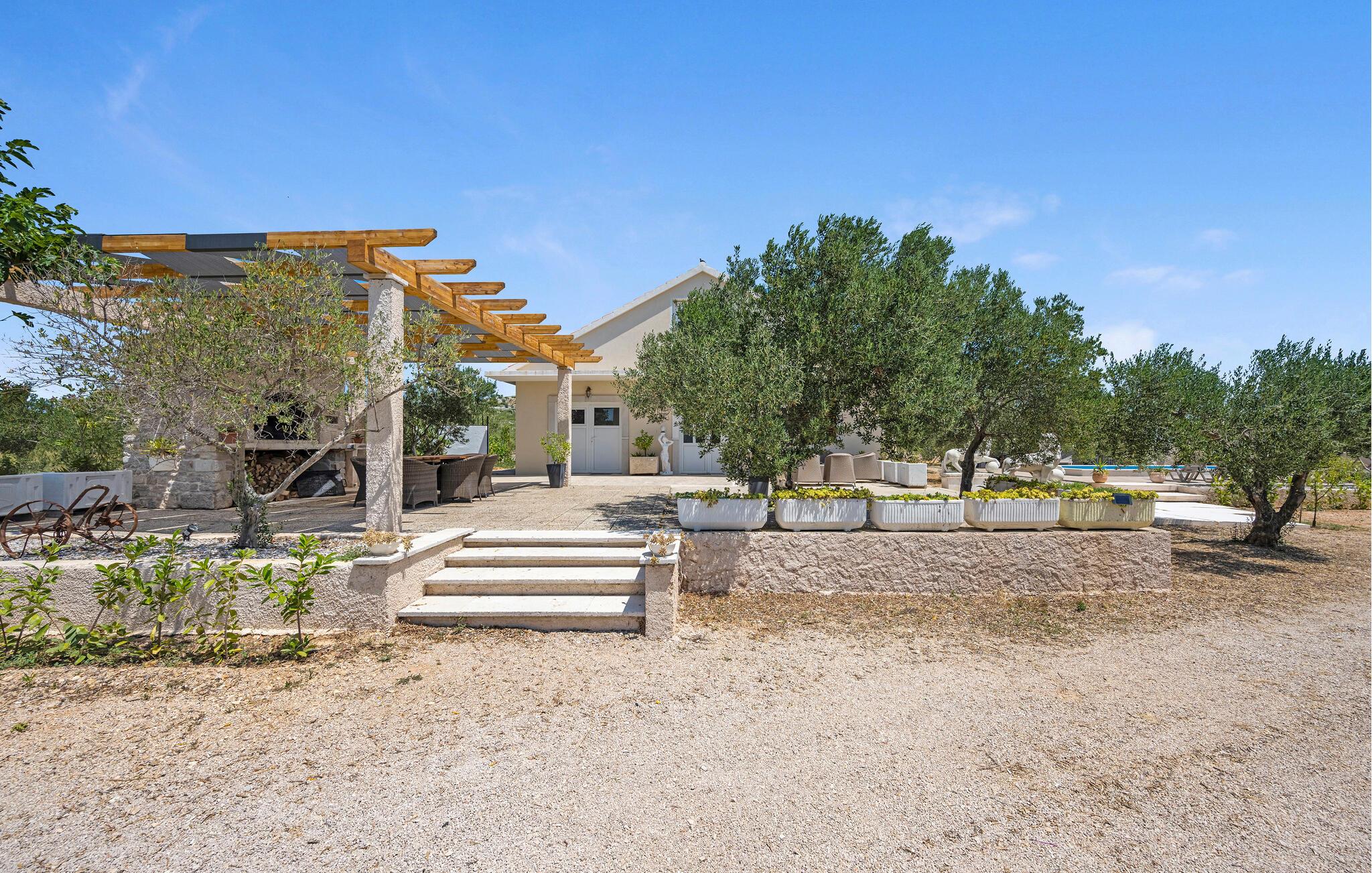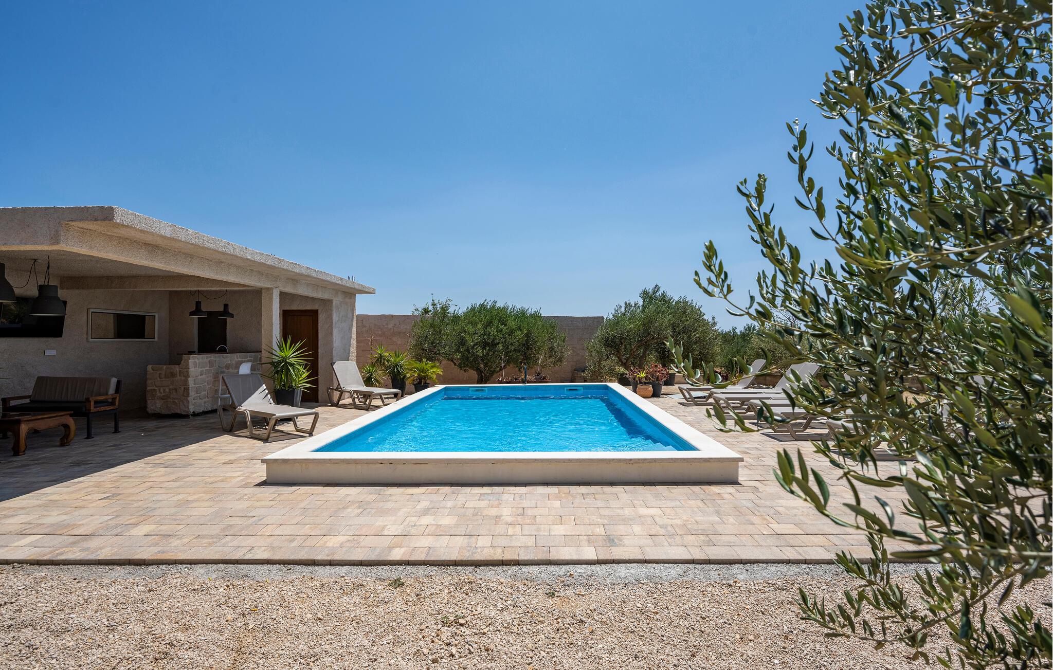 Der sensationelle Außenbereich ist eine echte Ruheoase. Ziehen Sie morgens gemächlich Ihre Bahnen im herrlichen Pool, tanken Sie Sonne auf der Liege und gönnen Sie sich ein erfrischendes Getränk im Schatten. Lauschen Sie dem leisen Knistern des Außenkamins oder genießen Sie Köstlichkeiten vom Grill mit Blick auf den Olivenhain.