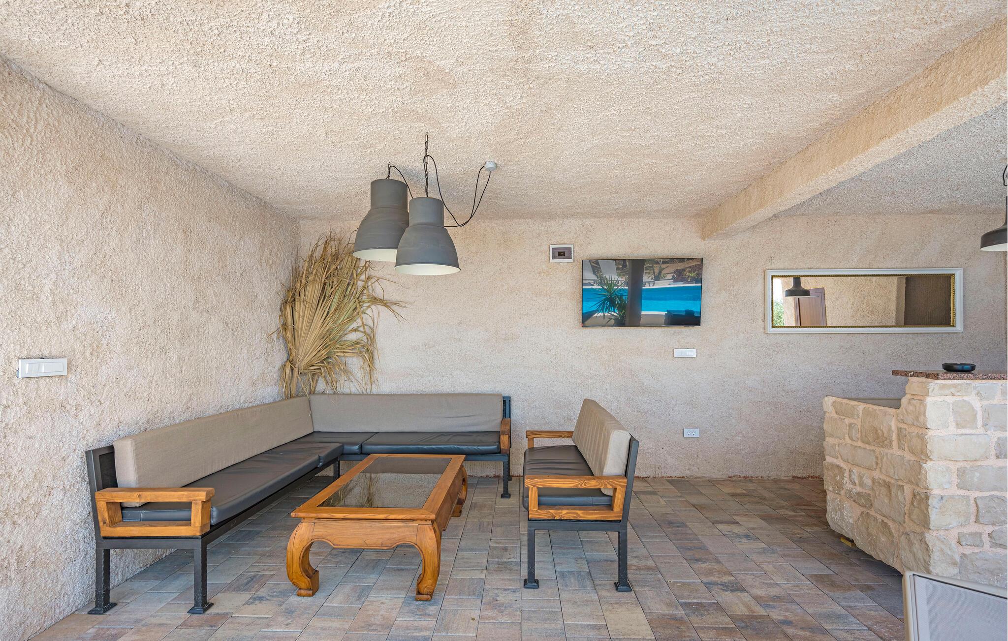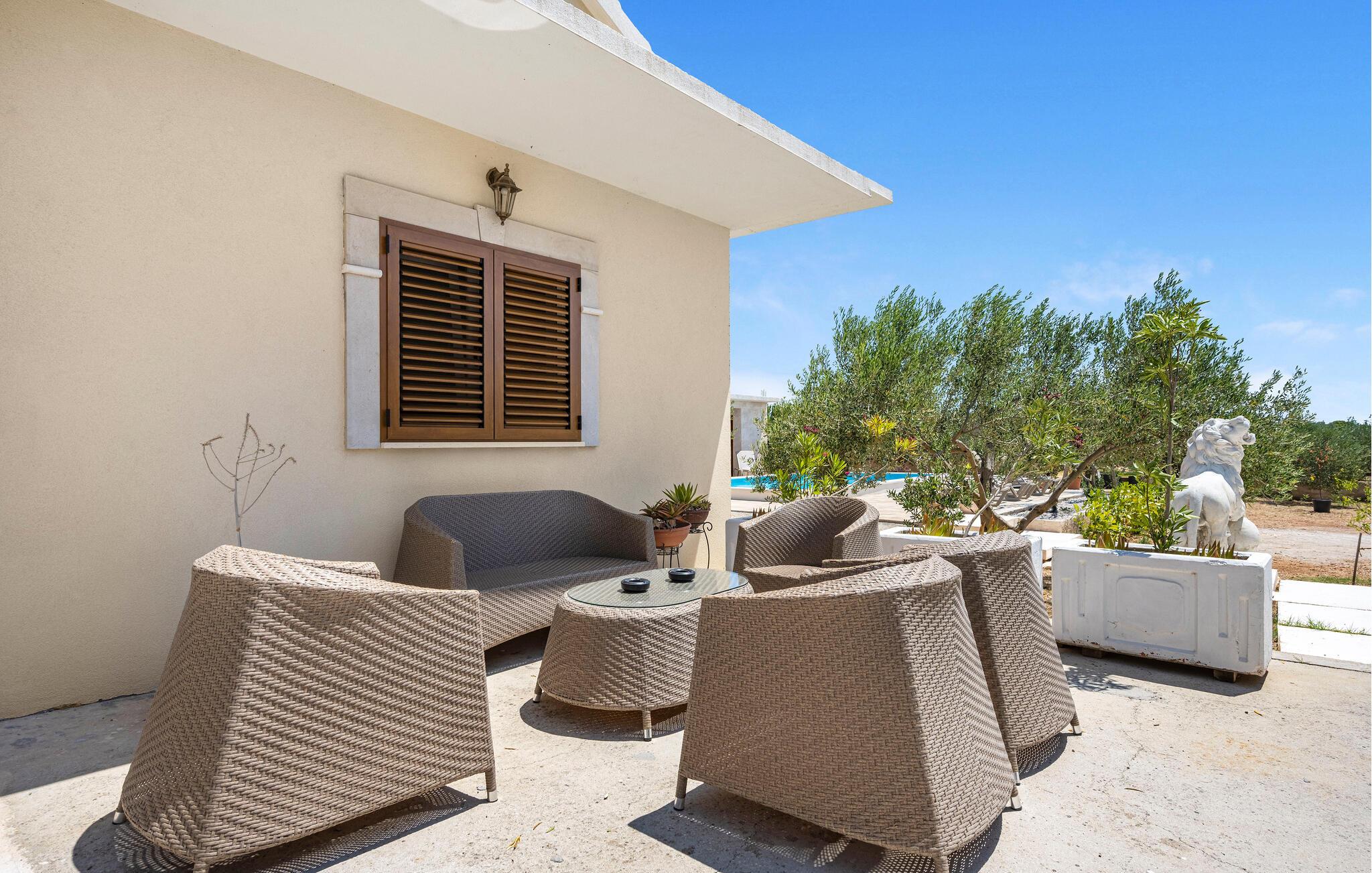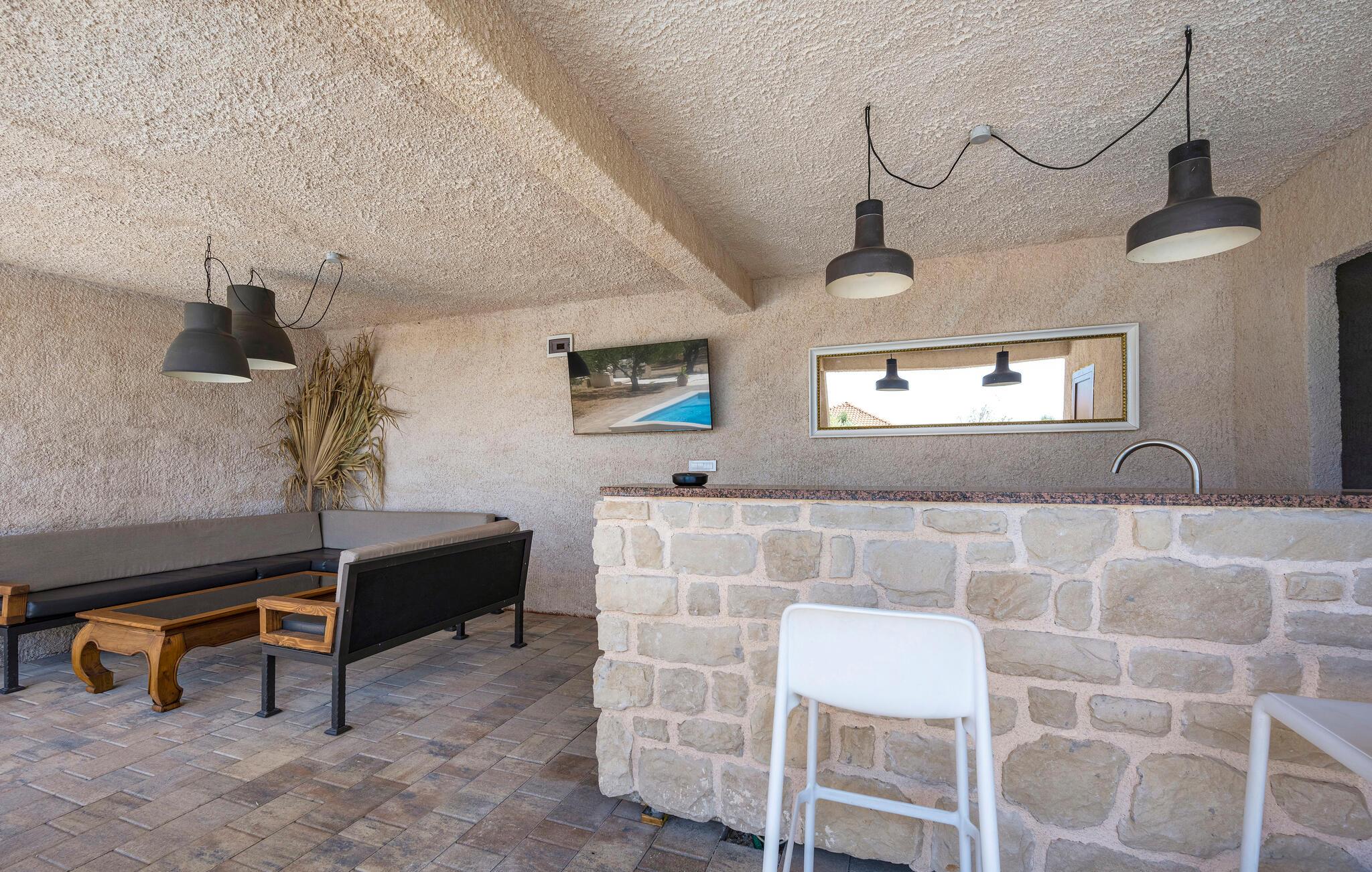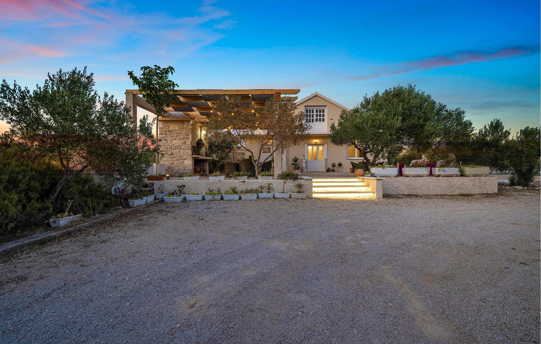 Der sensationelle Außenbereich ist eine echte Ruheoase. Ziehen Sie morgens gemächlich Ihre Bahnen im herrlichen Pool, tanken Sie Sonne auf der Liege und gönnen Sie sich ein erfrischendes Getränk im Schatten. Lauschen Sie dem leisen Knistern des Außenkamins oder genießen Sie Köstlichkeiten vom Grill mit Blick auf den Olivenhain.