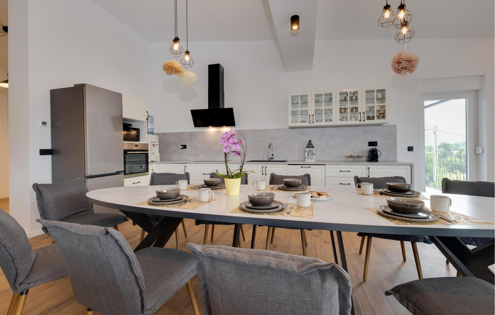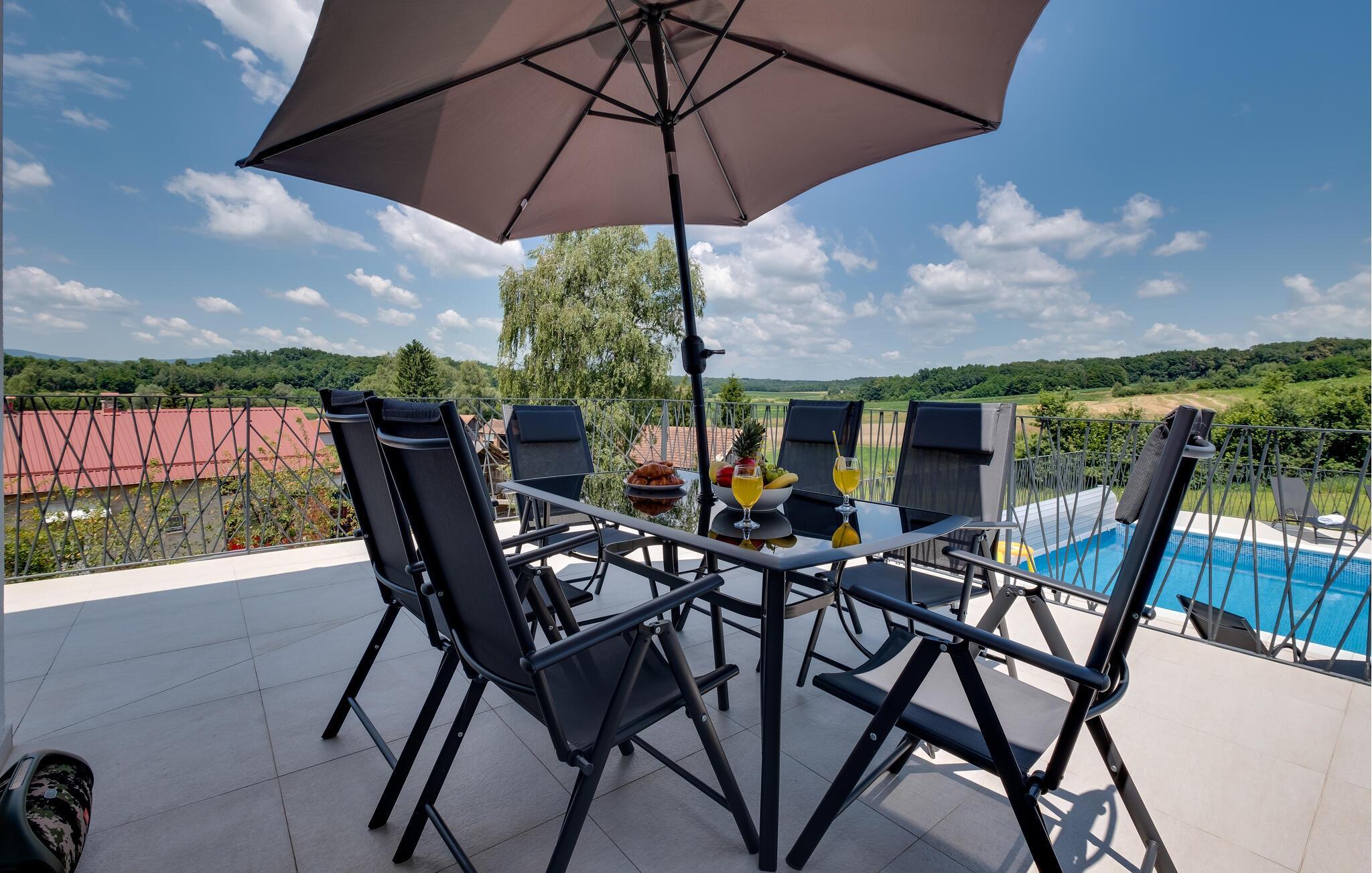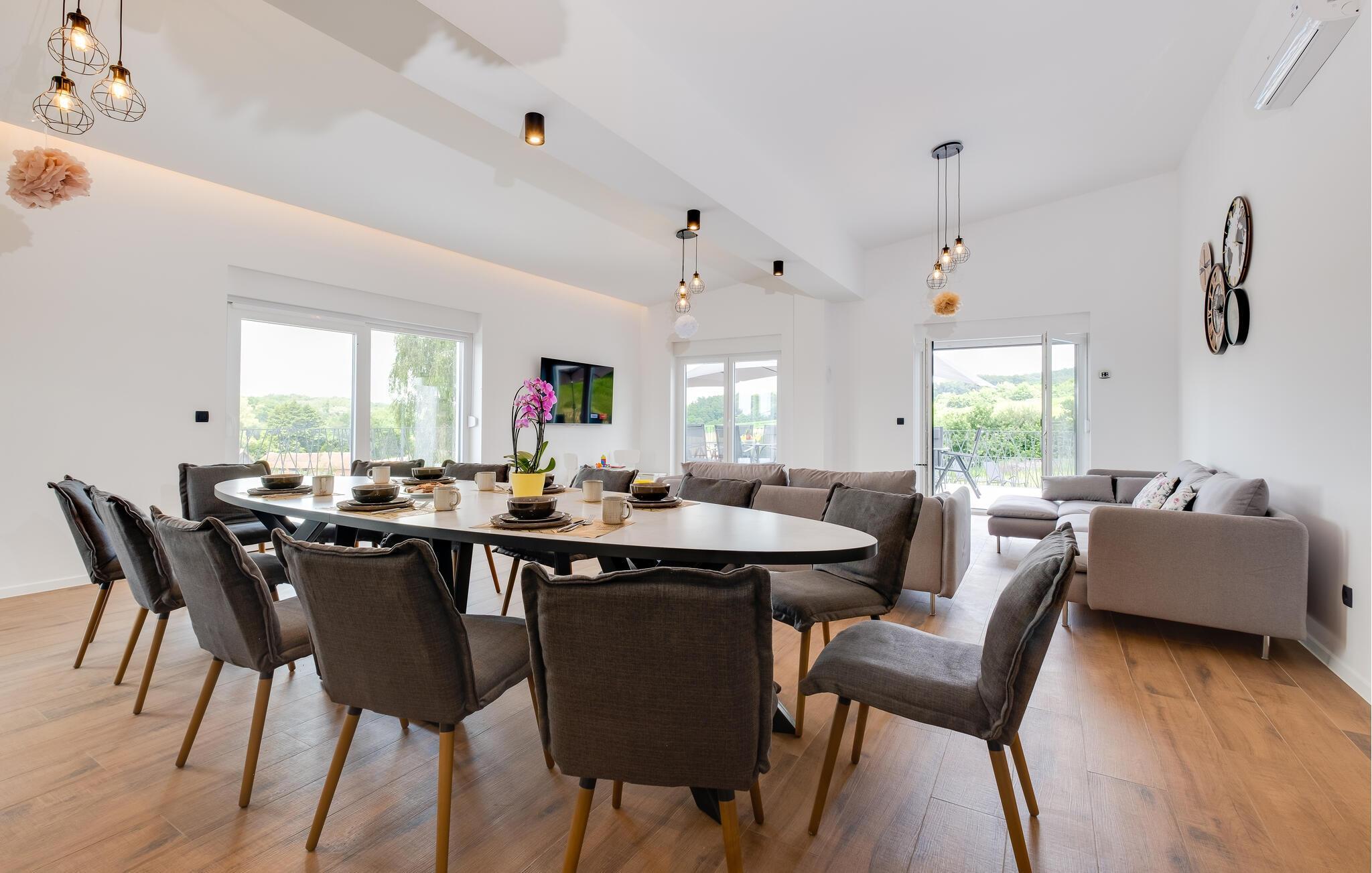 In Dvorisce, nahe Zagreb, lädt Sie dieses moderne Ferienhaus zu einer erholsamen Auszeit ein. Entspannen Sie sich am großzügigen Pool, der von einer geräumigen Terrasse umgeben ist, und lassen Sie den Blick über die sanften Hügel schweifen, die das Anwesen umgeben. Beginnen Sie Ihren Tag mit einem gemütlichen Frühstück auf der Terrasse unter den schattenspendenden Sonnenschirmen. Nutzen Sie die elegante Küche, um frische lokale Produkte zuzubereiten und den Tag in aller Ruhe zu planen. Der helle und großzügige Wohnraum bietet genug Platz für gesellige Abende oder ruhige Momente der Entspannung. Schauen Sie hier einen guten Film oder nutzen Sie den Außenbereich für ein Spiel Tischtennis mit Blick auf die malerische Landschaft.