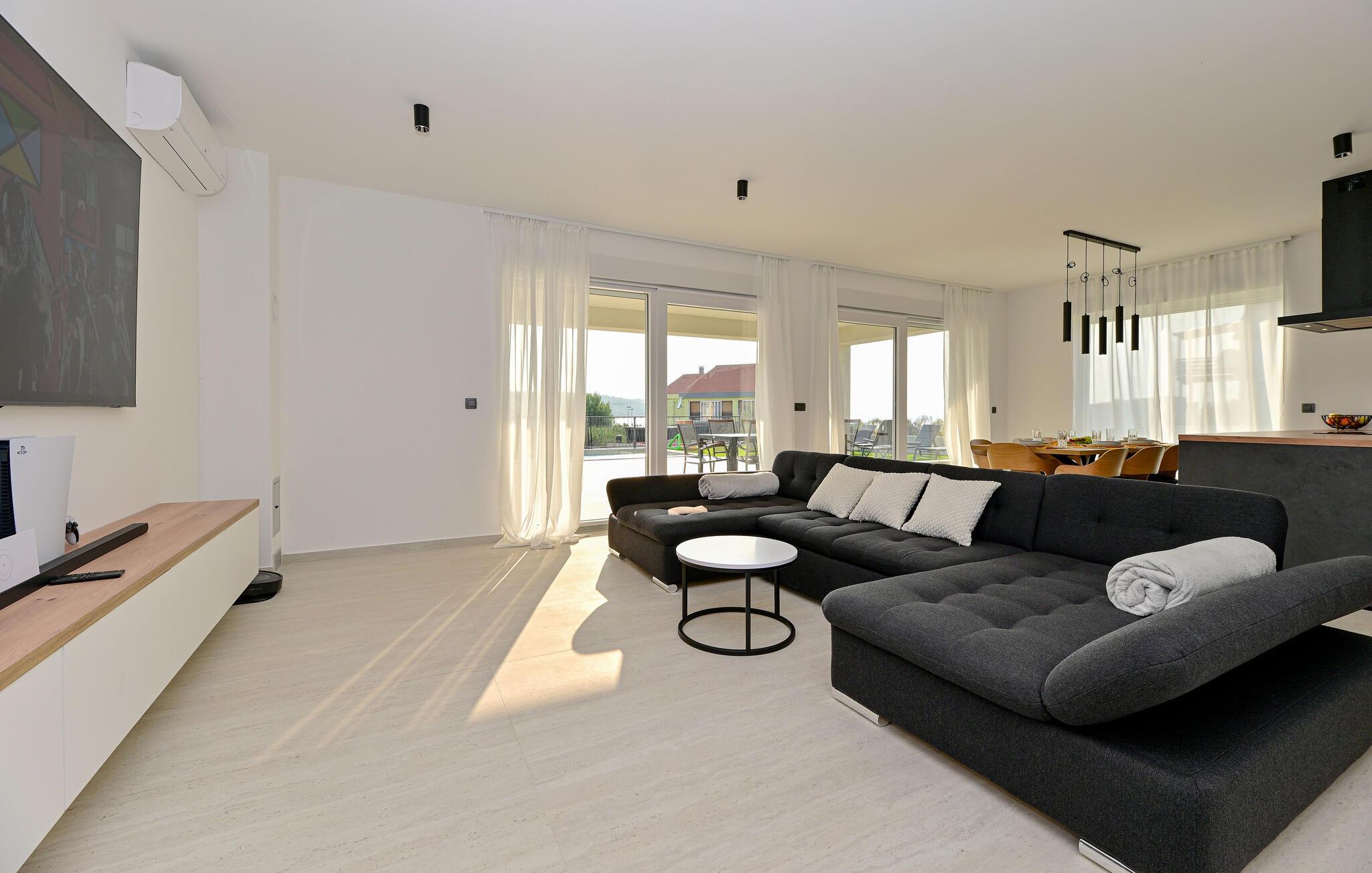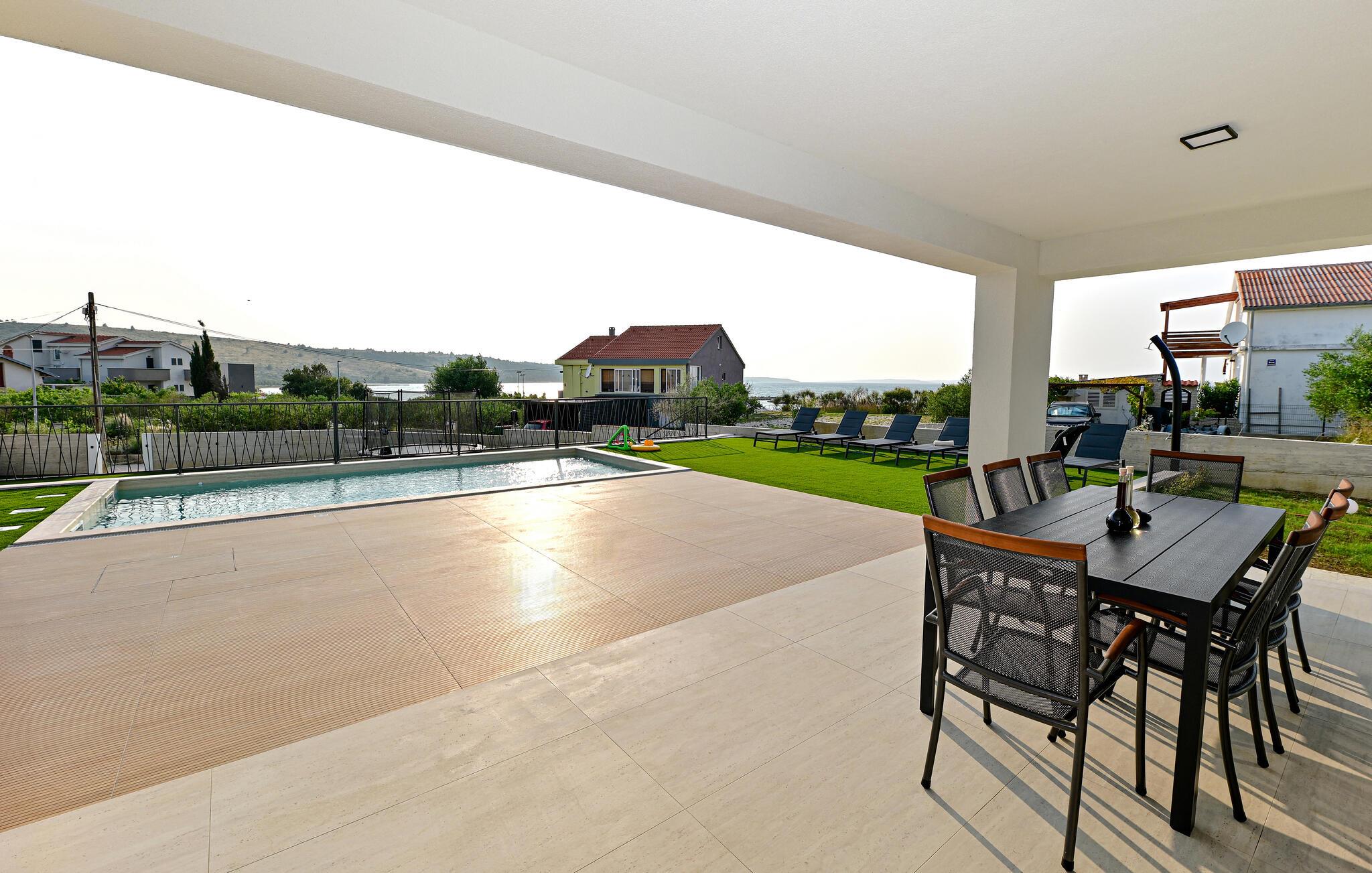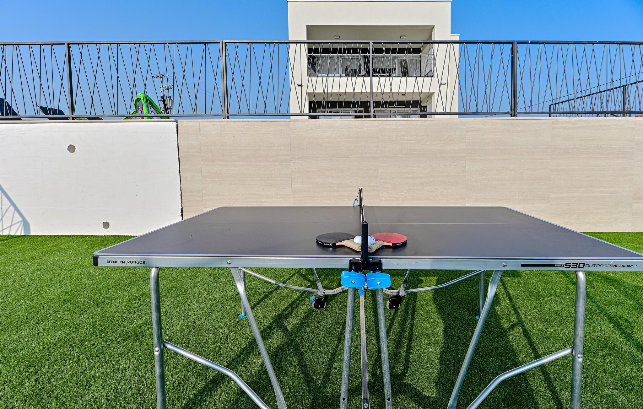 Ziehen Sie gleich nach dem Aufstehen entspannt Ihre Bahnen im Pool und lassen Sie bei einem Frühstück auf der Terrasse den Blick über das nahe Meer schweifen. Ihre Kinder werden sich am separaten Spielbereich erfreuen – hier locken eine Tischtennisplatte und ein Trampolin zum Toben. Entfachen Sie den Grill und zelebrieren Sie die gemeinsame Zeit mit stimmungsvollen Abenden unter freiem Himmel.
