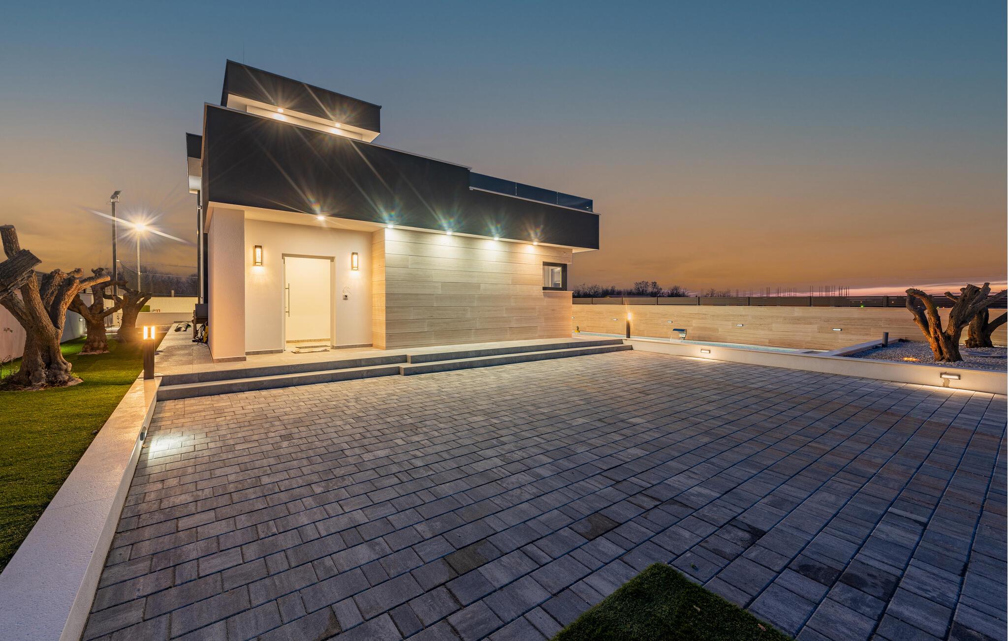 Dieses geräumige und luxuriös anmutende Ferienhaus bietet Familien fantastische Urlaubserlebnisse. Freuen Sie sich auf die vielen Möglichkeiten, die Ihr Ferienhaus für Sie bereithält. Im beheizten Außenpool kommen kleine und große Wasserfreunde auf ihre Kosten. Und dank der großzügigen Außenbeleuchtung können Sie Ihren Pool auch abends nach Sonnenuntergang nutzen. Wenn Sie etwas Abwechslung wünschen, dann erwartet Sie auf der Terrasse im ersten Stock ein Whirlpool, der Entspannung pur verspricht. Genießen Sie von dort aus oder von den dort vorhandenen Sonnenliegen die Aussicht auf Ihre Urlaubsgegend. Auch sportliche Aktivitäten kommen hier nicht zu kurz. Auf dem direkt am Haus gelegenen Sportplatz können Sie mit Ihren Kindern sportliche Wettkämpfe in vielen verschiedenen Sportarten bestreiten. Ein ganz besonderes Highlight für alle Hobbyköche ist die Außenküche mit gemauertem Grill und Esstisch. Abends können Sie sich es bei einem gemeinsamen Filmabend auch in den Sitzgruppen gemütlich machen