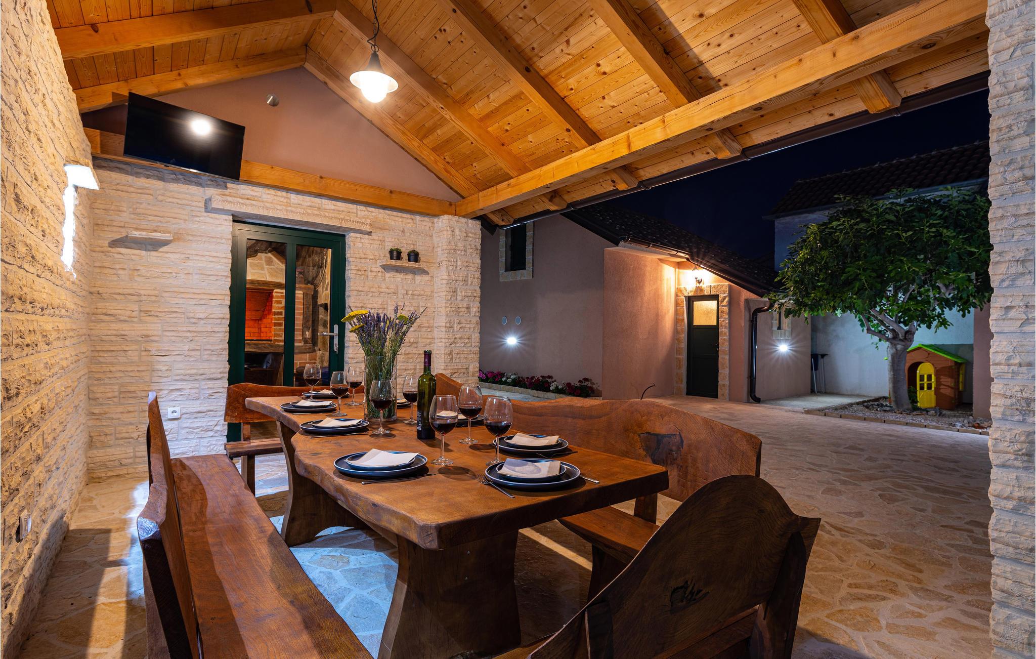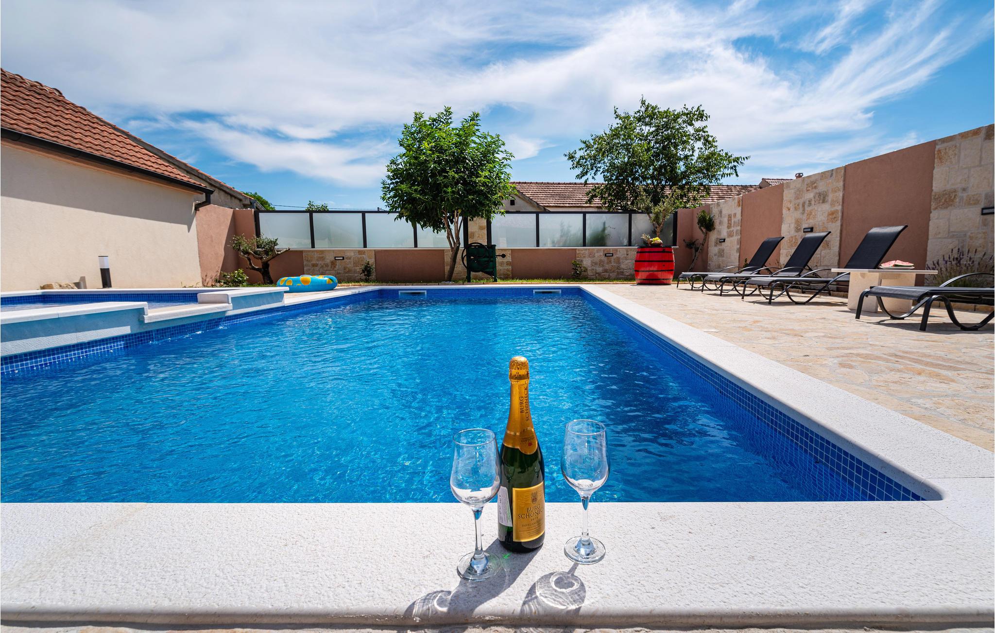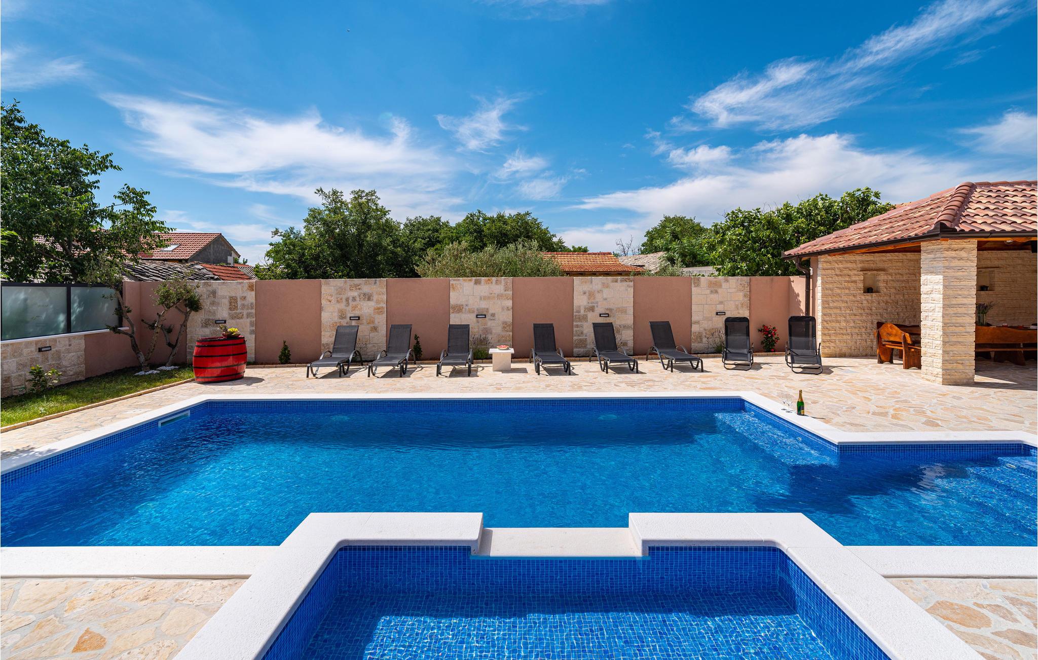 Wenn Sie ein Liebhaber von mediterraner Sonne, stilvoller Gemütlichkeit und Geselligkeit sind, ist dieses einladende Haus die richtige Wahl für Sie. Zwischen Zadar und Sibenik im Hinterland gelegen, empfängt die Ihr Ferienhaus in stimmiger Atmosphäre. Sie werden vor Allem den Bereich vor dem Haus lieben, der durch großen, beheizten Pool und Grill mit überdachtem, schönen Essbereich einlädt.